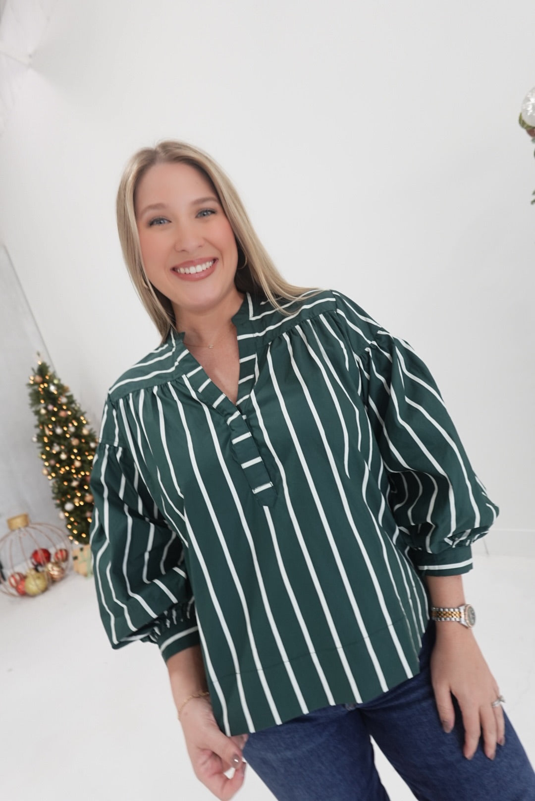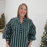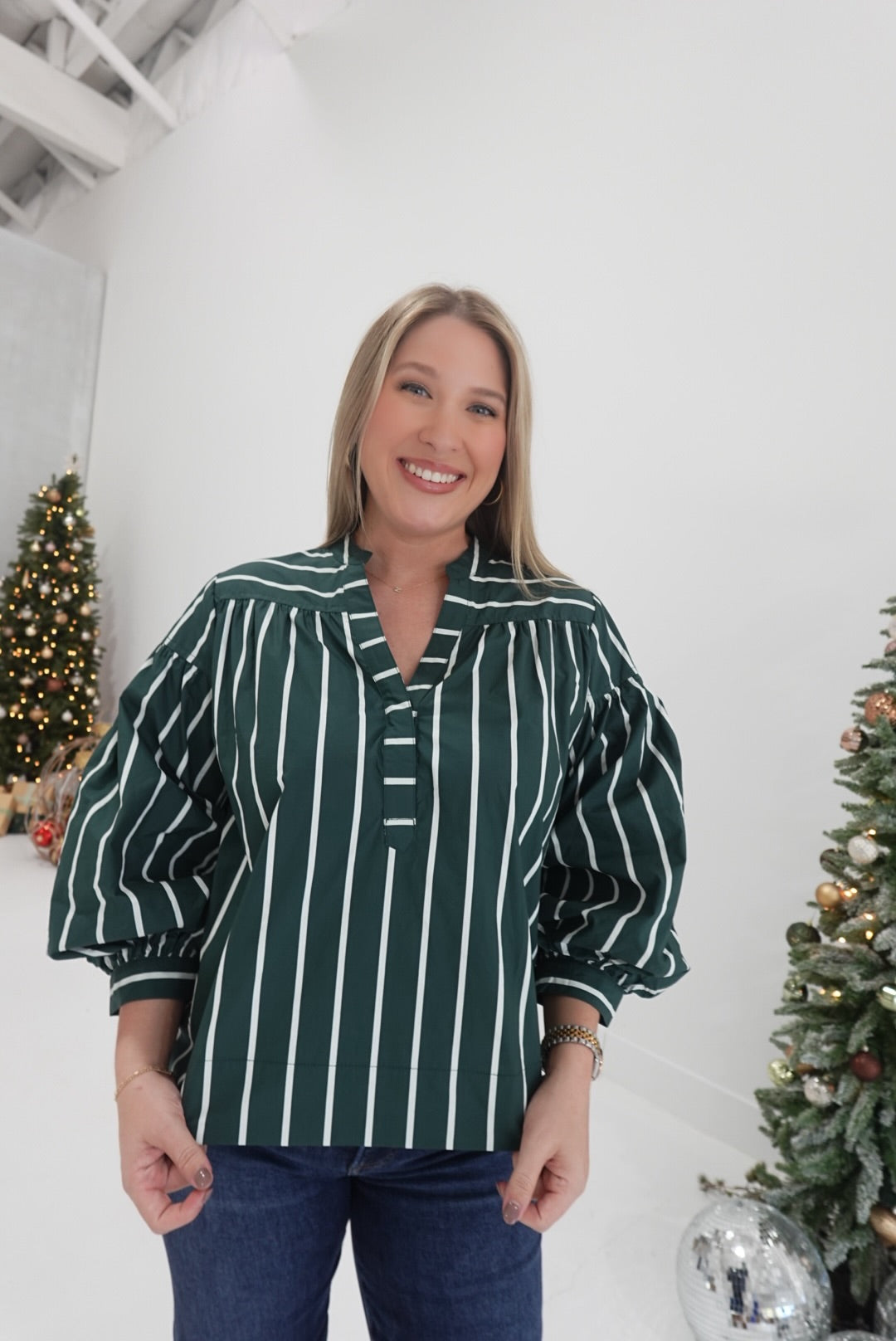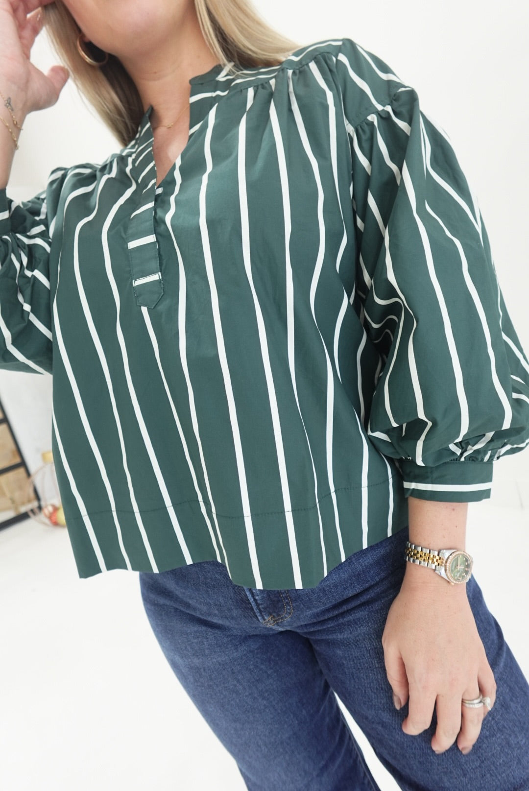 - Striped V Neck Top With Puff Sleeves