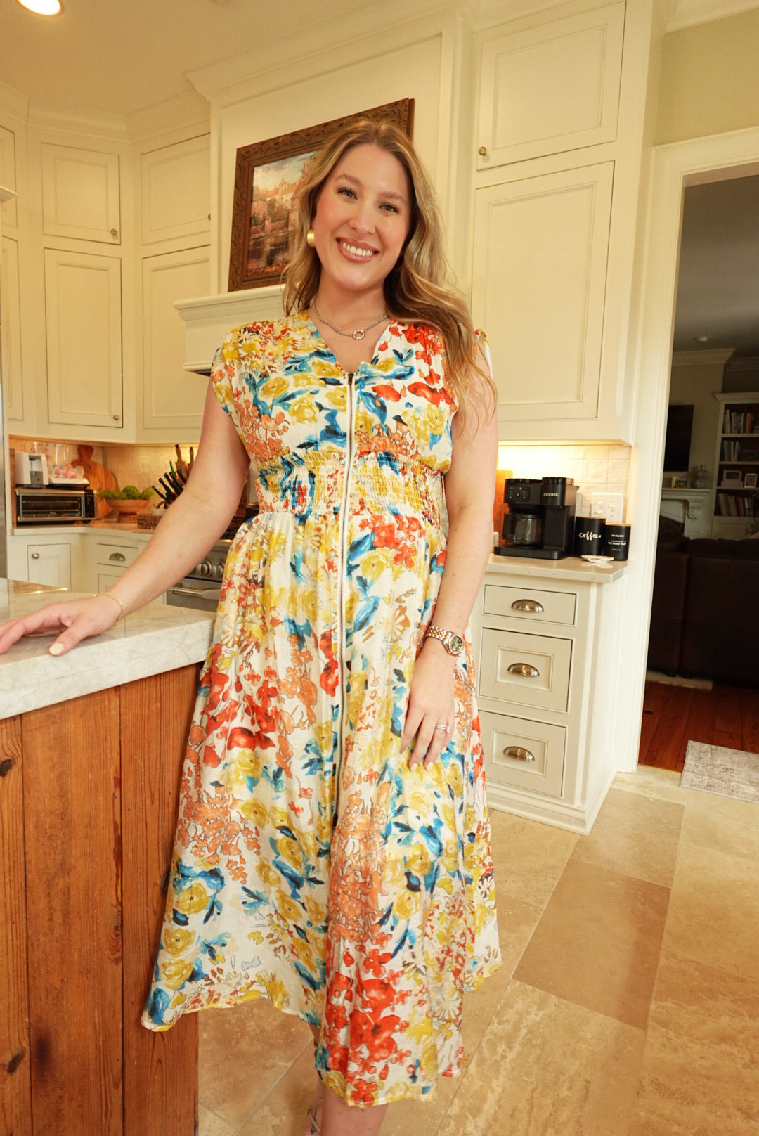 - Floral Midi Dress With Front Zipper
