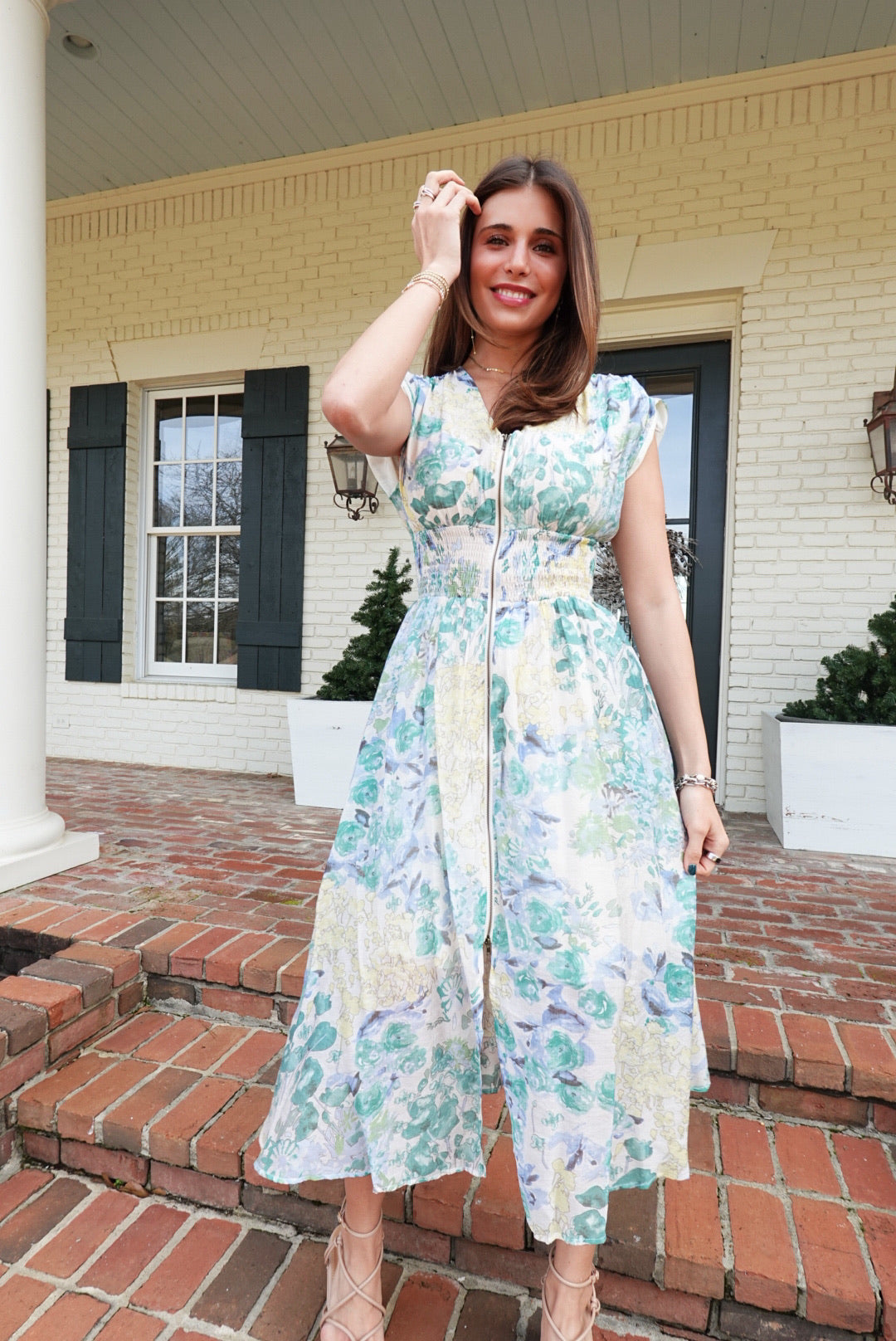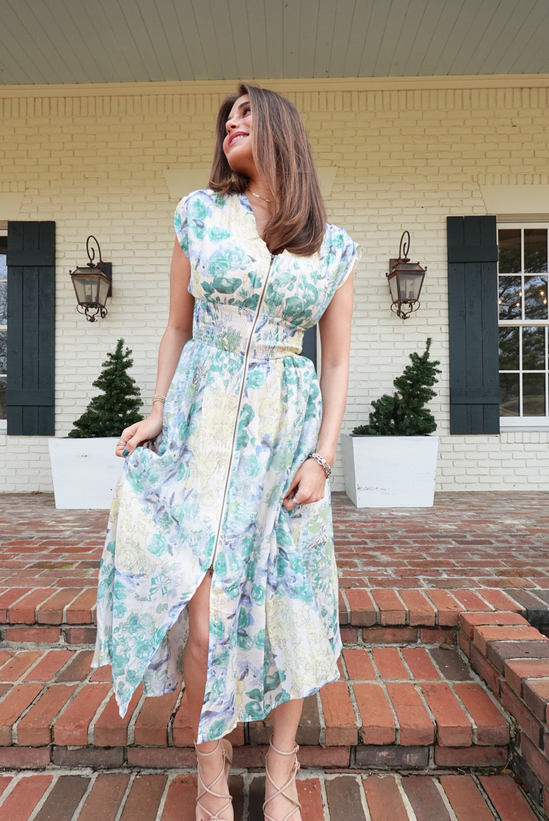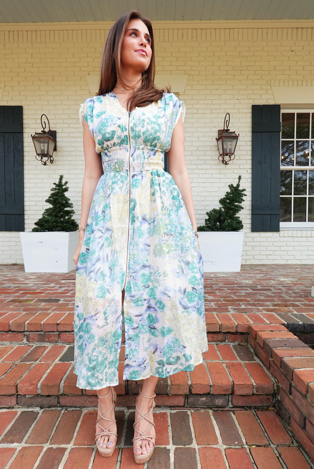 Juniper Midi Dress – Dare to make a statement in this floral midi dress that commands attention from every angle. The striking blue mix print brings bold botanical energy to your wardrobe, while the front zipper offers effortless versatility—wear it fully buttoned for polished elegance or unzipped for an edgier, layered look. Midi length hits at the perfect sweet spot between sophisticated and daring. Pair with heels for evening drama or sneakers for confident daytime style. This is the dress that refuses to blend in.