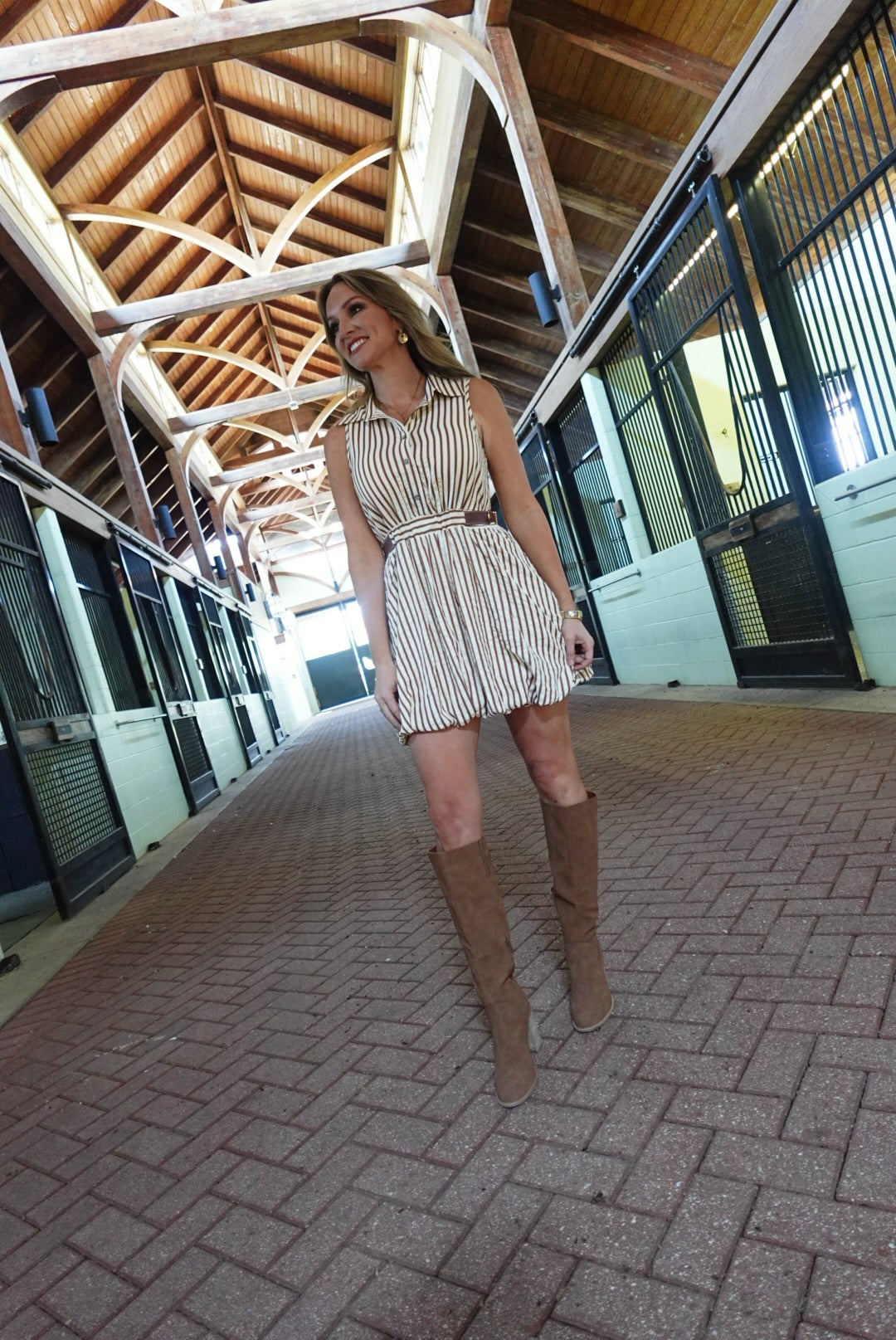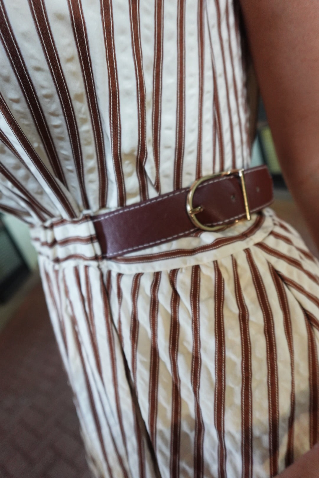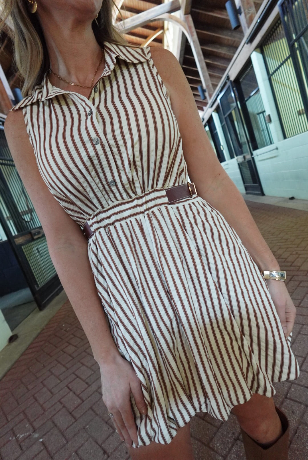 This expertly designed Justice Striped Dress features a sophisticated sleeveless silhouette with a playful bubble hem. The distinctive stripe pattern is complemented by functional side pockets and an adjustable belt for a customized fit. A collar with button-front closure adds a tailored touch to this versatile mini dress.