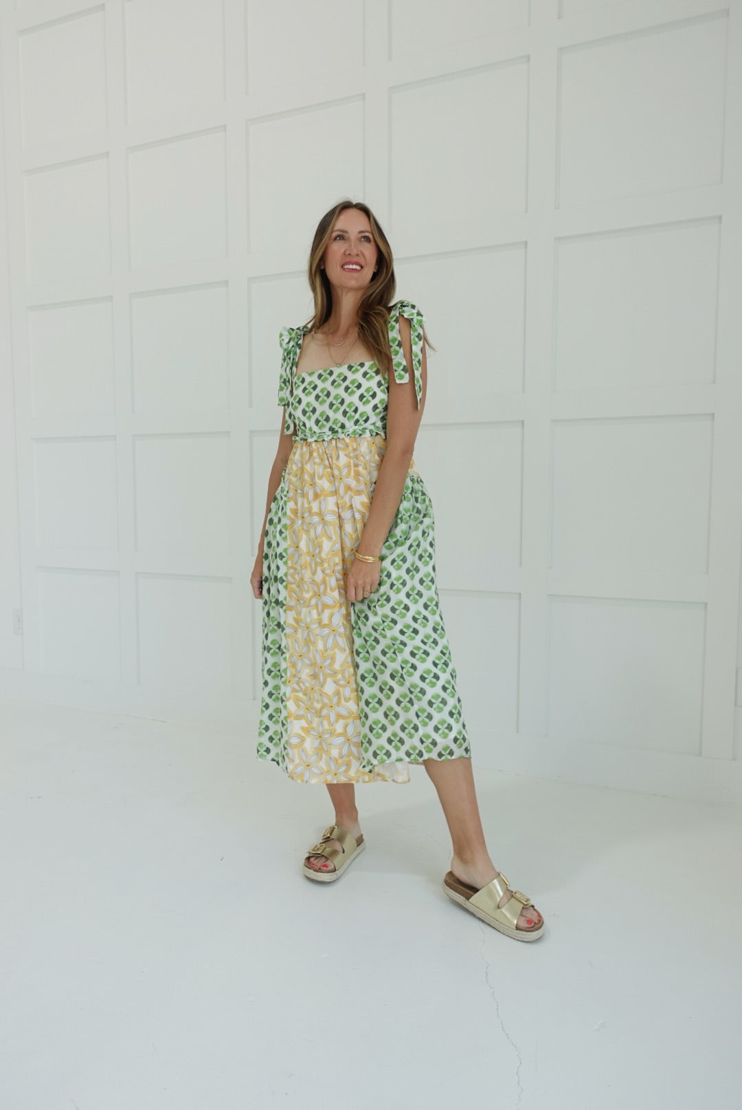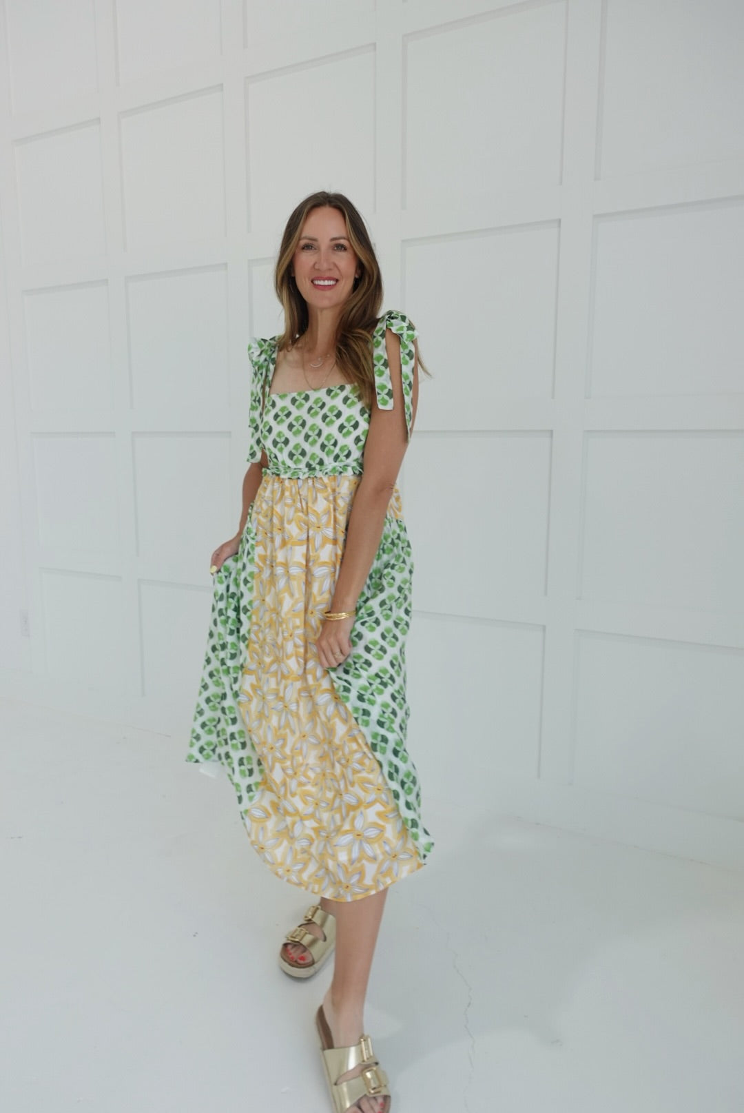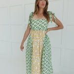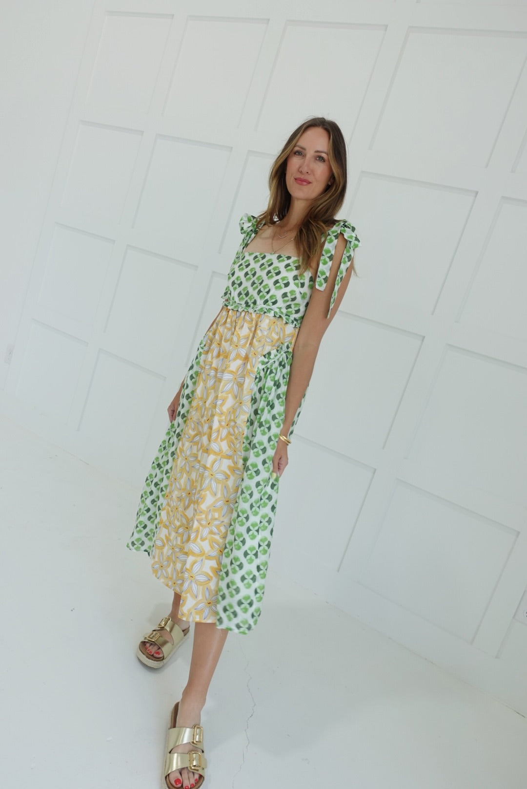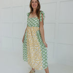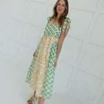 Turn heads in this playful midi dress with a kaleidoscope-like mix of prints. Guaranteed to add a touch of fun and uniqueness to any outfit.