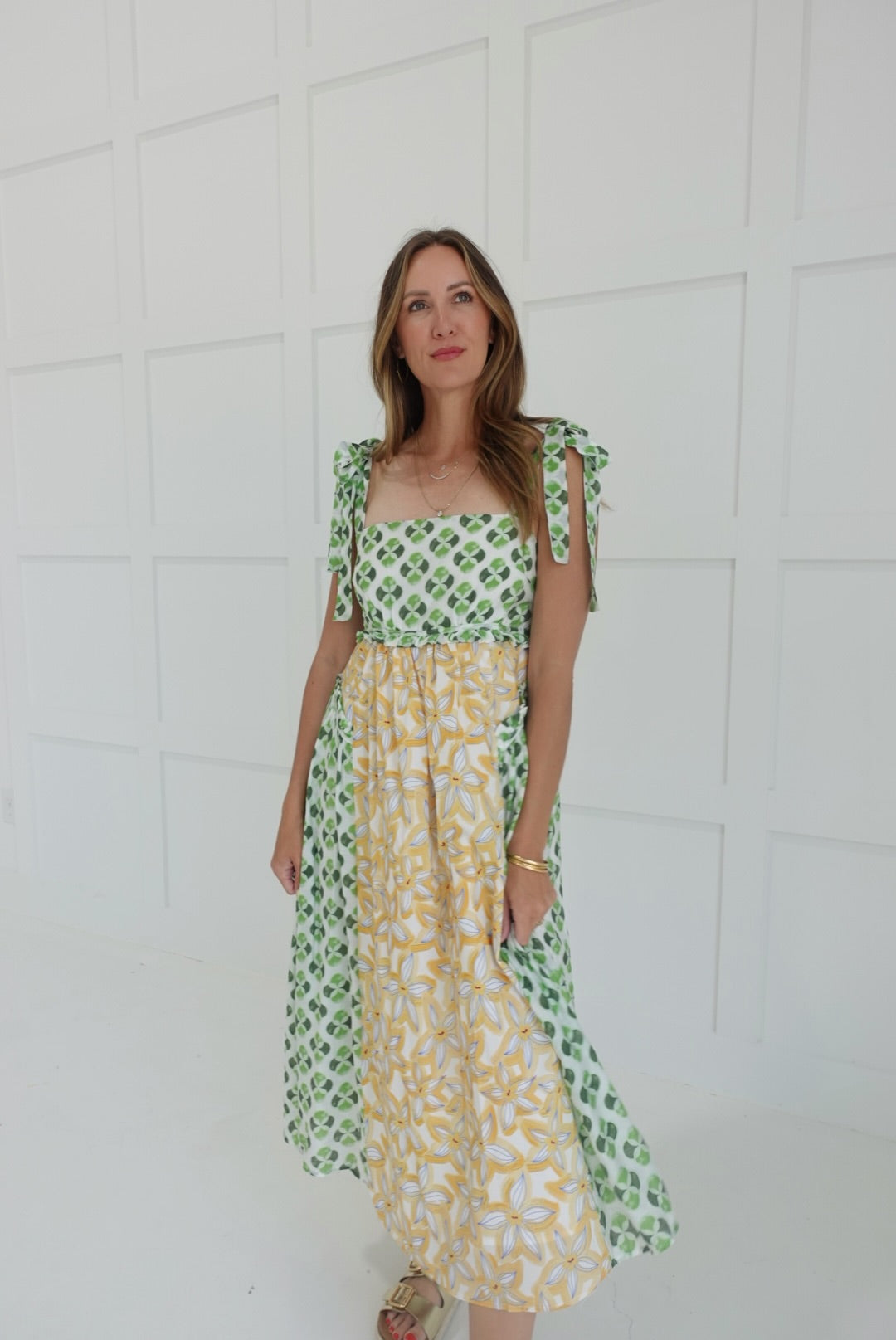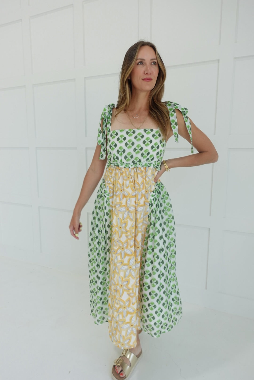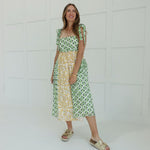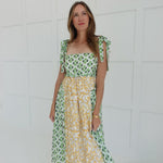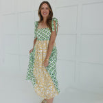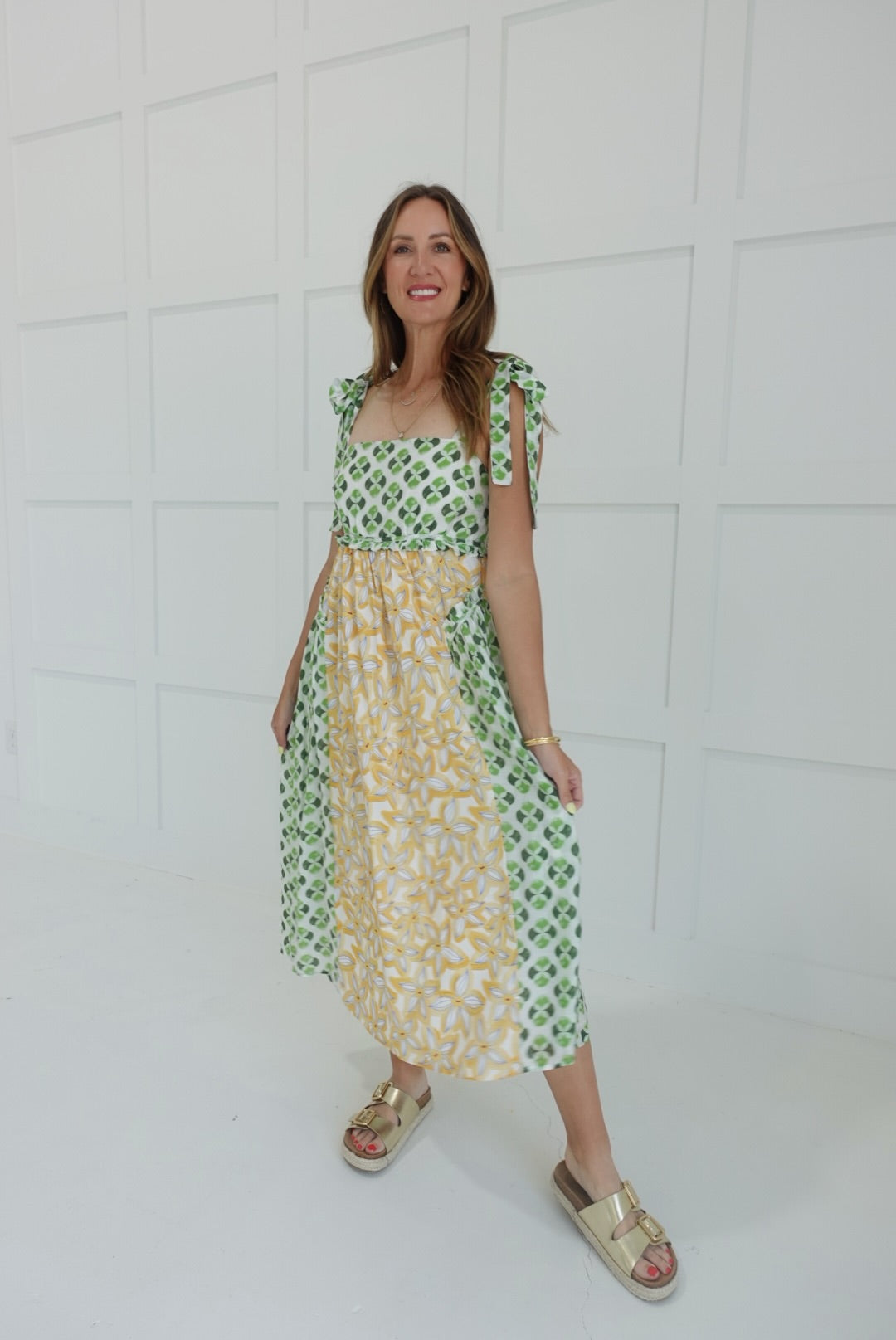 Turn heads in this playful midi dress with a kaleidoscope-like mix of prints. Guaranteed to add a touch of fun and uniqueness to any outfit.