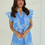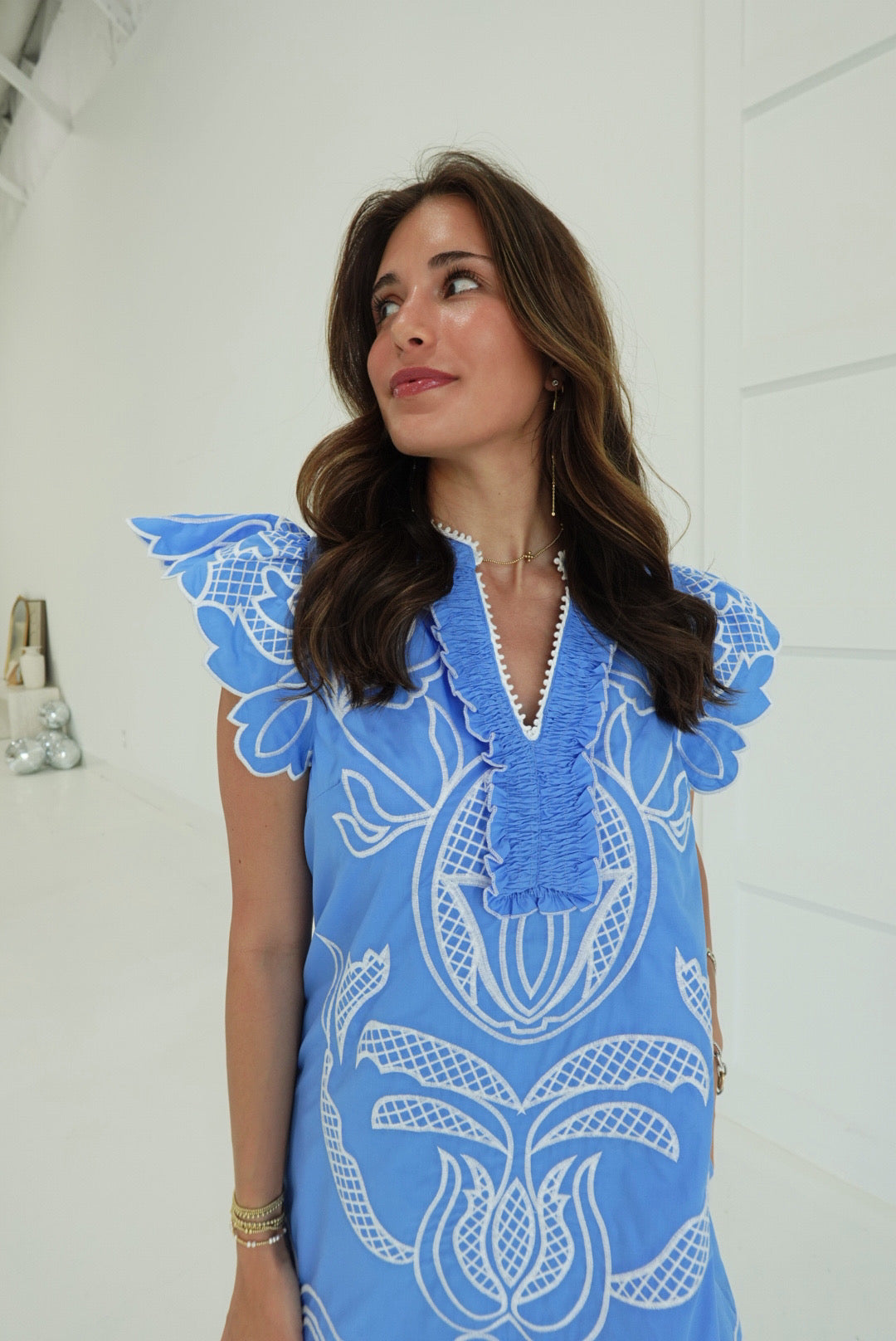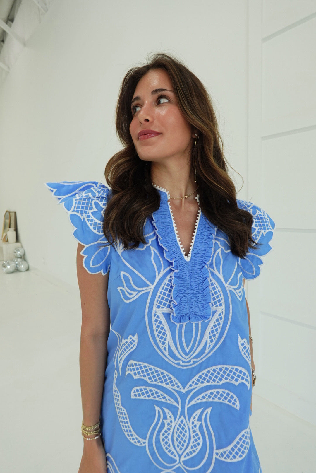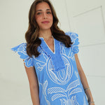 Elevate your wardrobe with the Keirstin Mini Dress, a charming piece designed for effortless style. This woven mini features delicate embroidered details and romantic flutter sleeves that frame the shoulders beautifully. The smocked ruffle V-neck adds dimension and visual interest, while practical side pockets keep essentials within reach. Fully lined for comfort and opacity, this lightweight dress transitions seamlessly from day to evening. Perfect for warm-weather occasions when you want to look polished without sacrificing comfort.