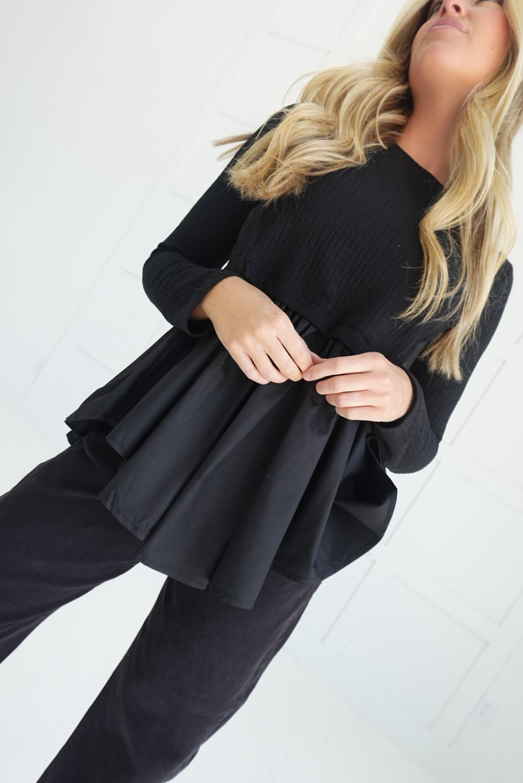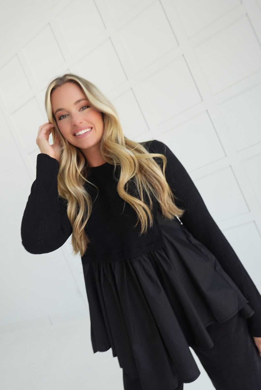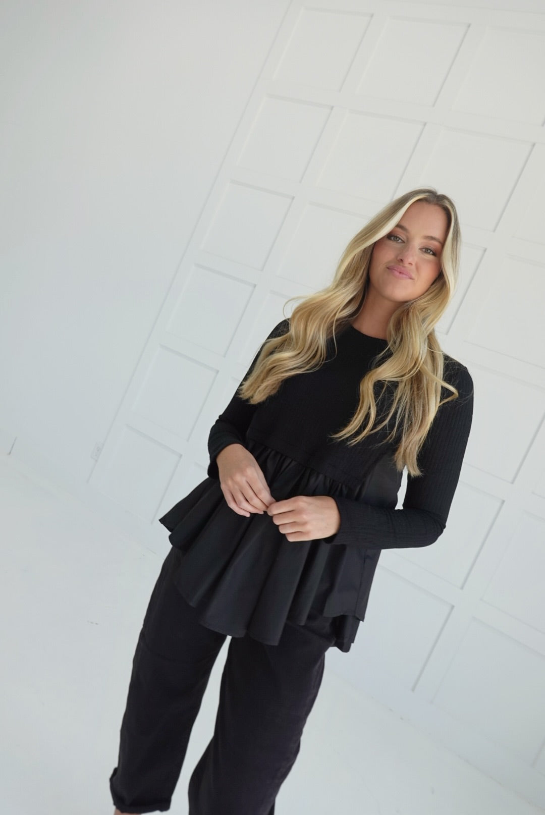 The Kitt Poplin Top combines the softness of knit fabric with the crisp texture of poplin, creating a comfortable yet structured feel. Its long sleeves and delicate ruffle details add a touch of feminine charm while providing coverage for cooler days. This top effortlessly balances casual comfort and polished style, making it a versatile addition to your wardrobe. Perfect for layering or wearing on its own, it supports both your everyday ease and refined look.