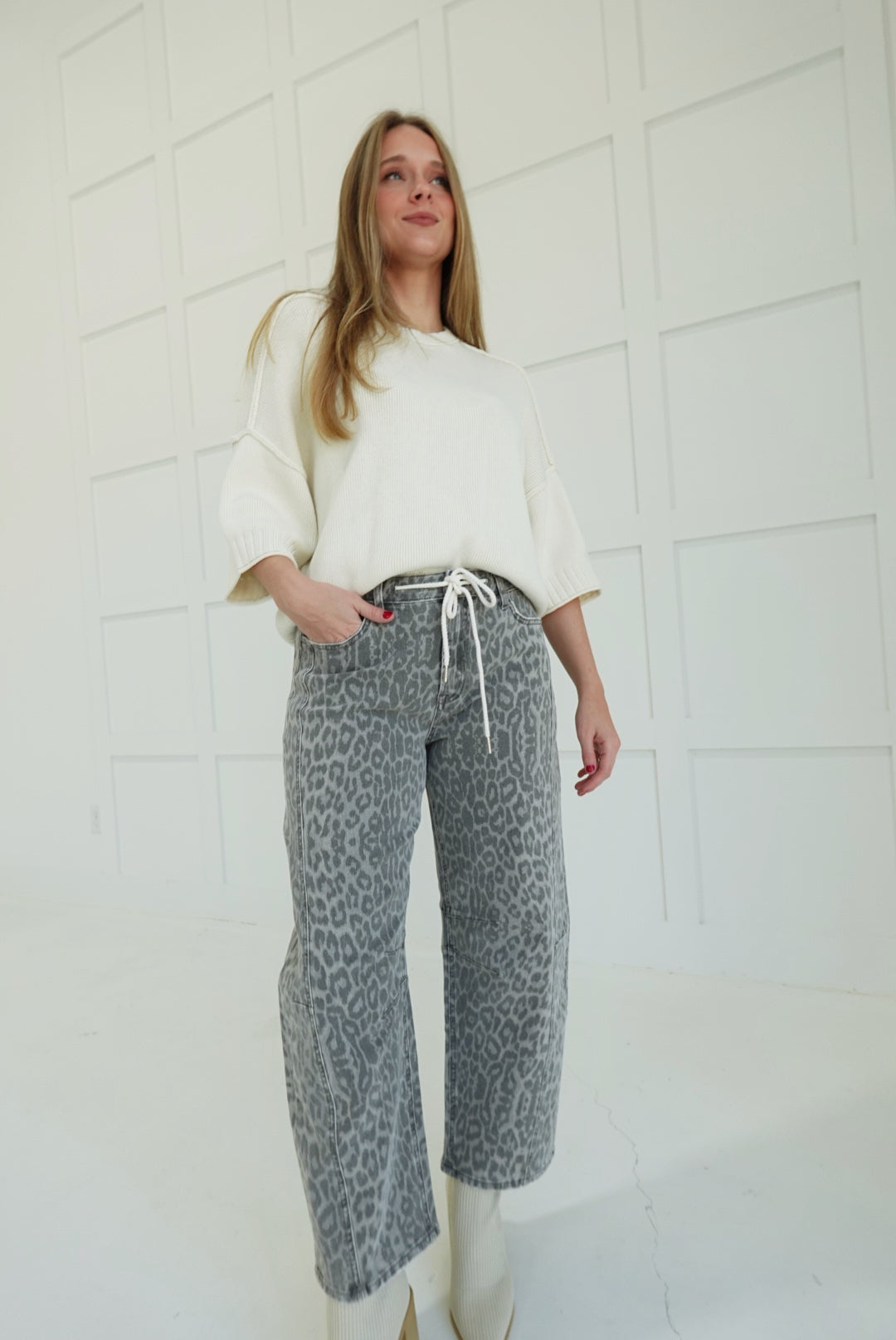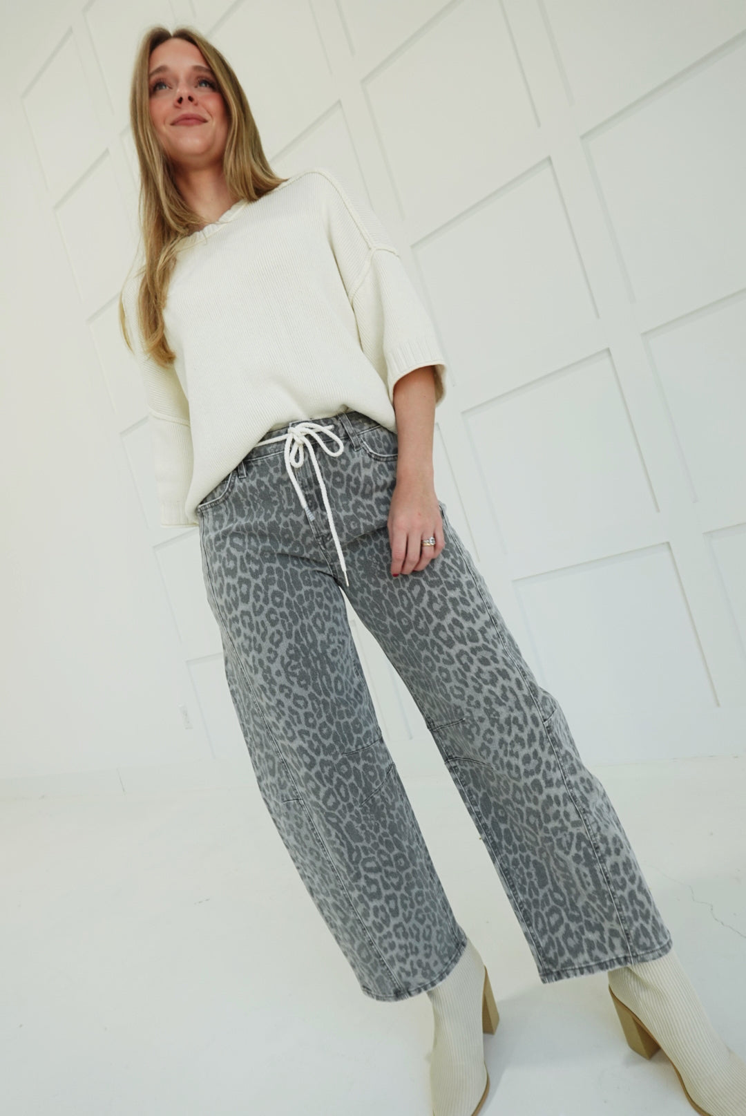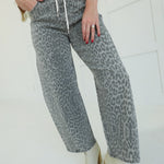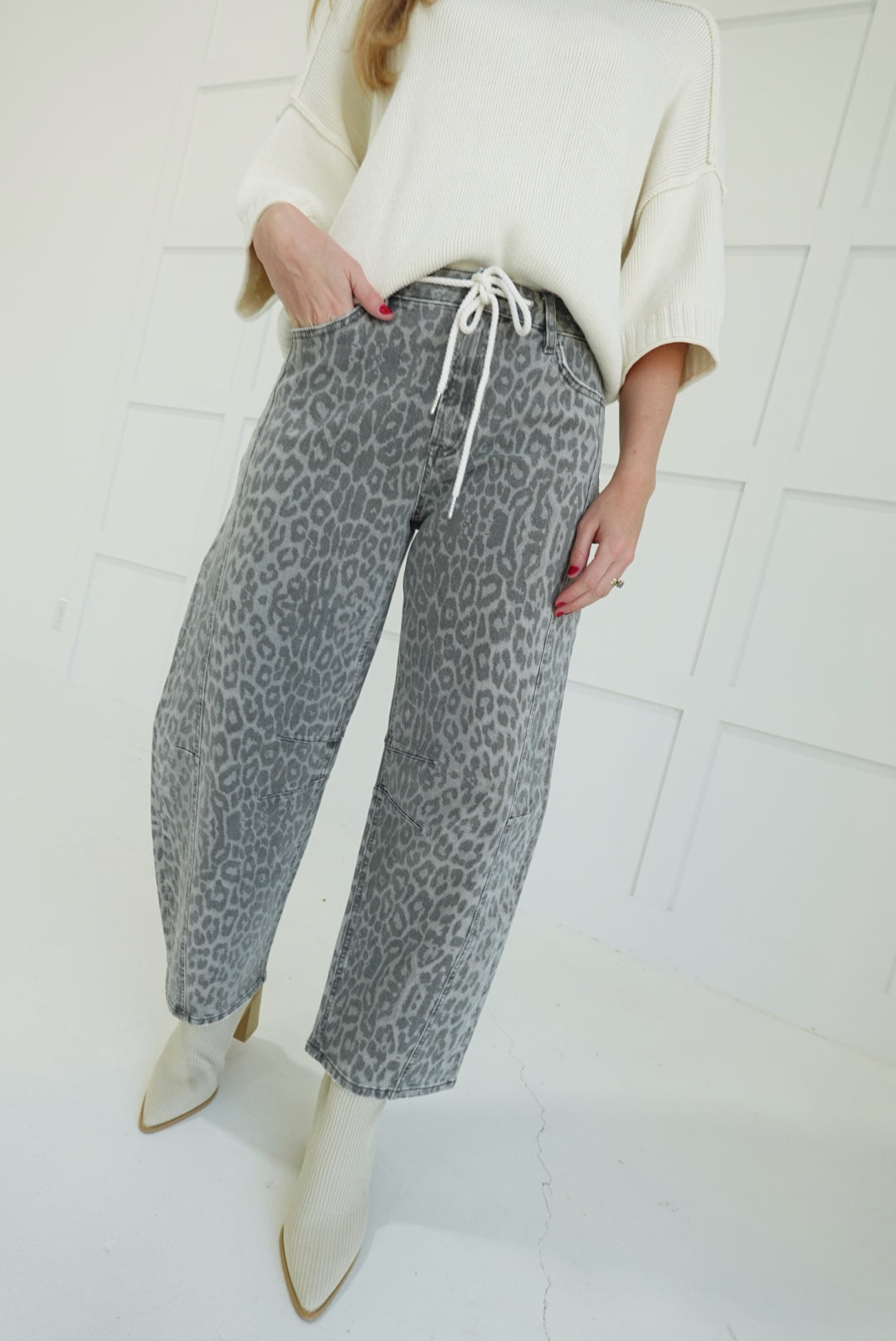 Embrace an edgy silhouette with these high-rise barrel jeans, cut for a bold, relaxed fit that commands attention. The grey leopard print adds an untamed edge to your everyday rotation—sophisticated enough for styled moments, daring enough to make a statement. Drawstring waist ensures comfort without compromise. A modern take on vintage denim that refuses to blend in.