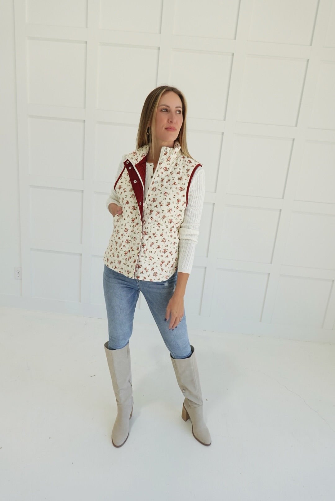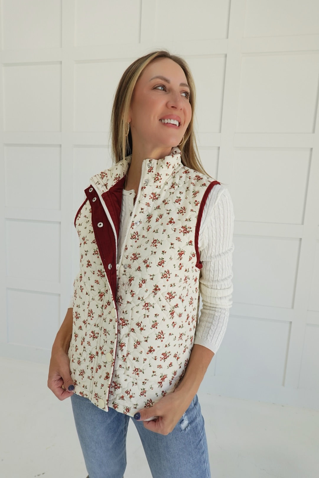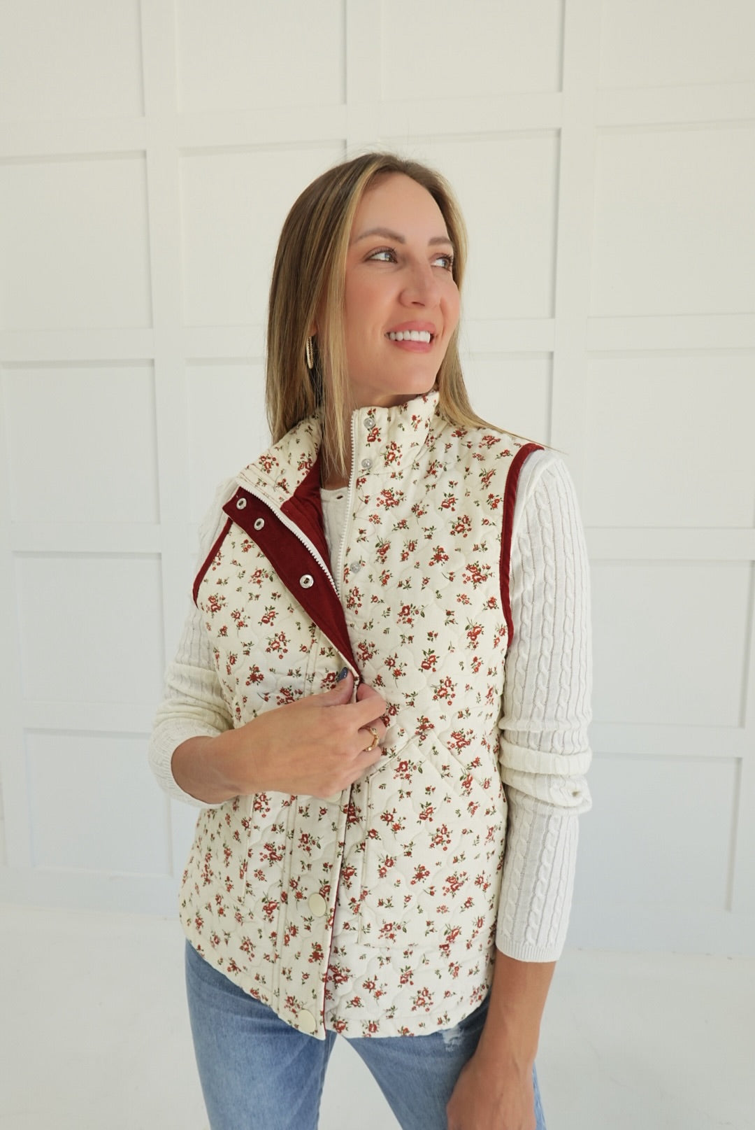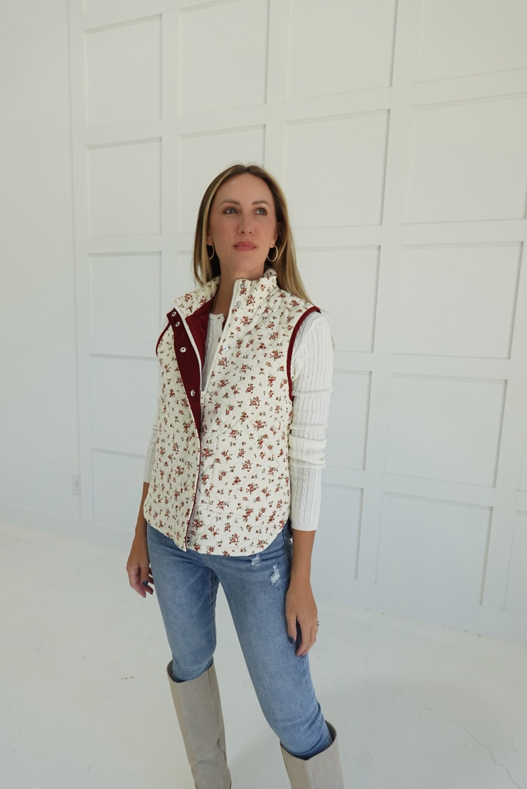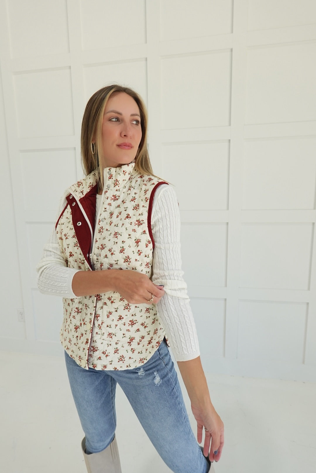 The Layfair Floral Vest combines cozy warmth with feminine charm through its quilted design and delicate floral pattern. This zip-up puffer vest offers lightweight insulation perfect for layering on chillier days, keeping you comfortable without bulk. Its versatile style pairs effortlessly with casual or outdoor looks, making it an ideal choice for everyday wear when you need just a little extra warmth.