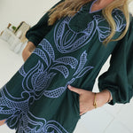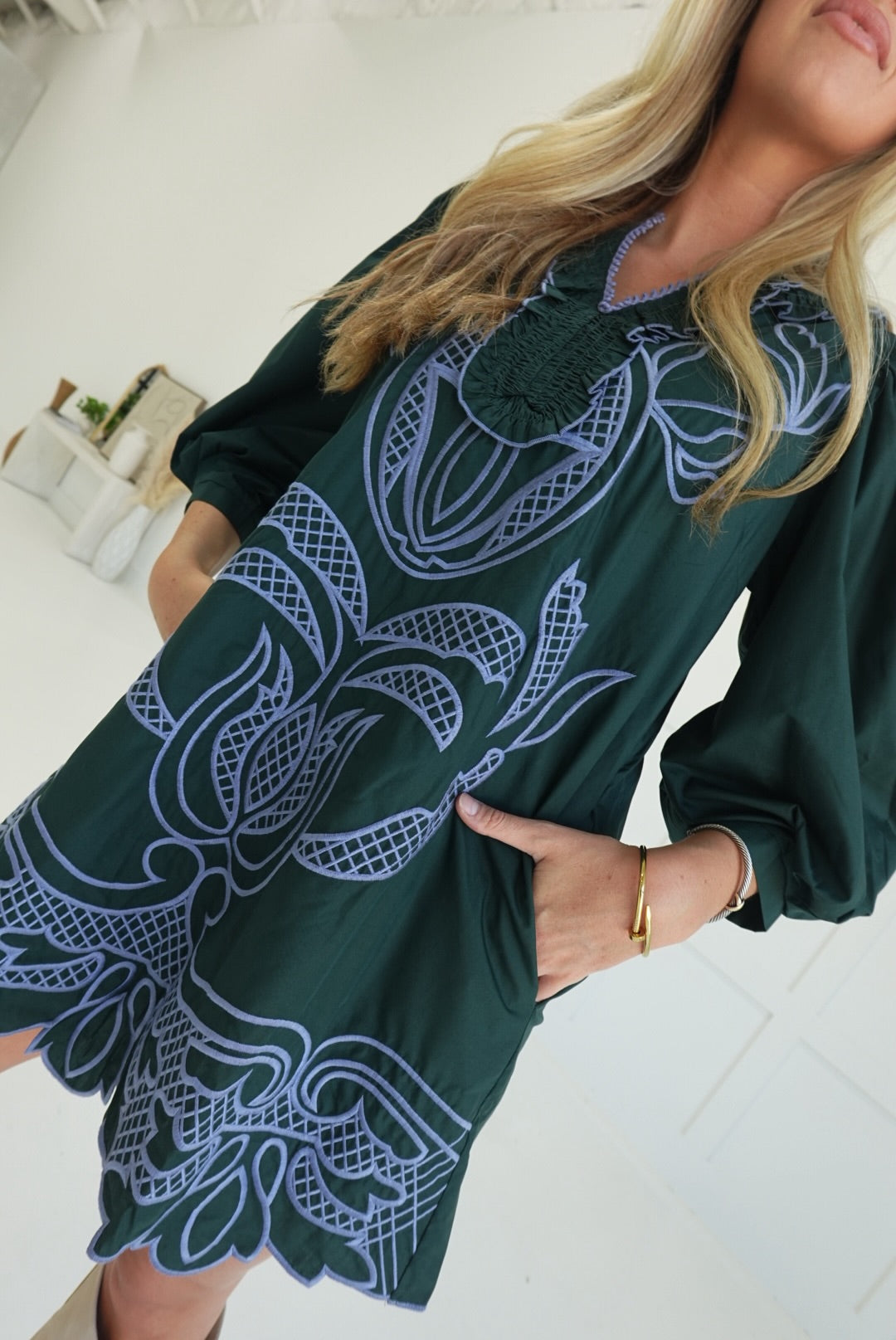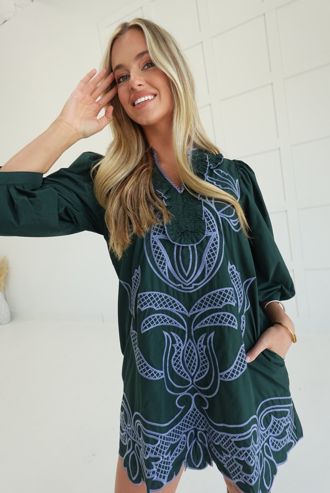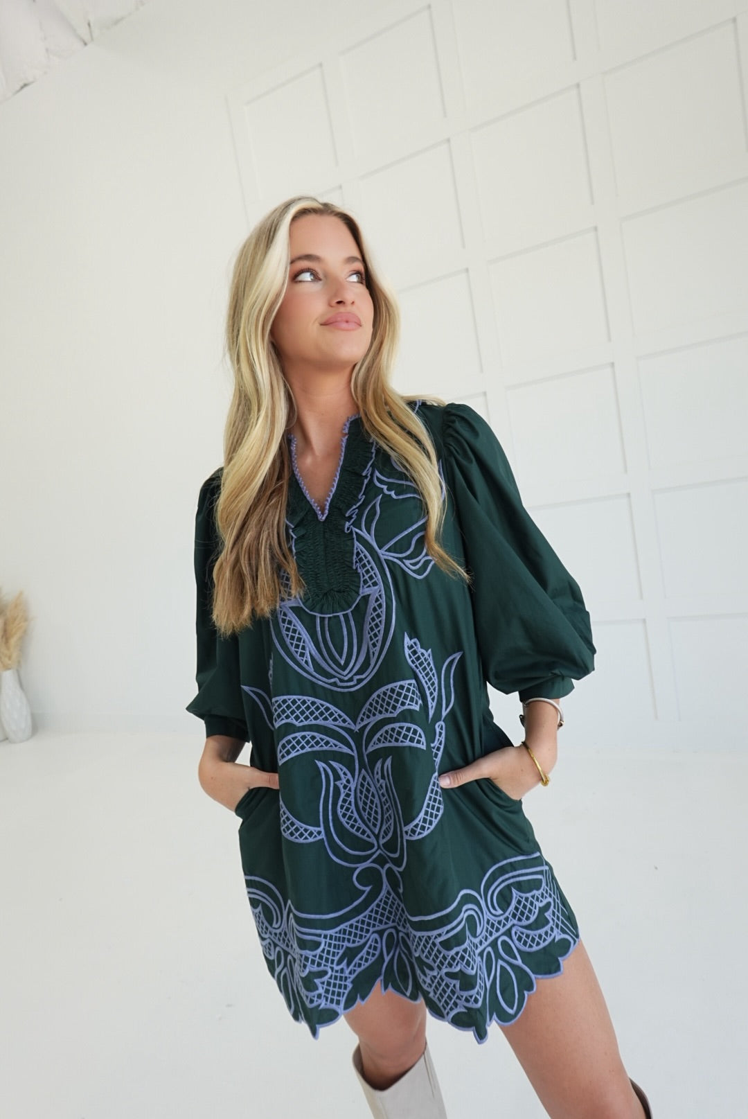 The Layla Mini Dress combines comfort and charm with its solid 3/4 puff sleeves and lightweight woven fabric. Its embroidered design and scallop hem add delicate detail, while the ruffled trim with a split neck and smocked back collar provide a flattering fit. Practical side pockets enhance convenience, and the unlined, non-sheer material ensures all-day ease and confidence. Perfect for those seeking a stylish yet comfortable dress for any occasion.
