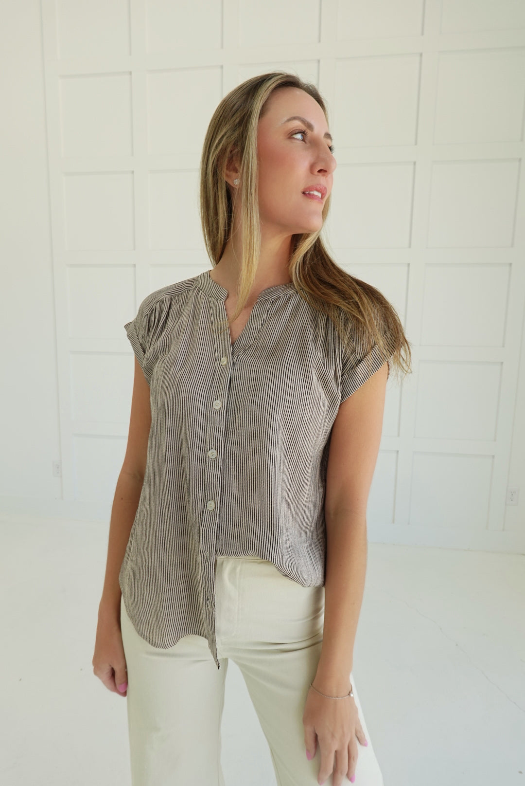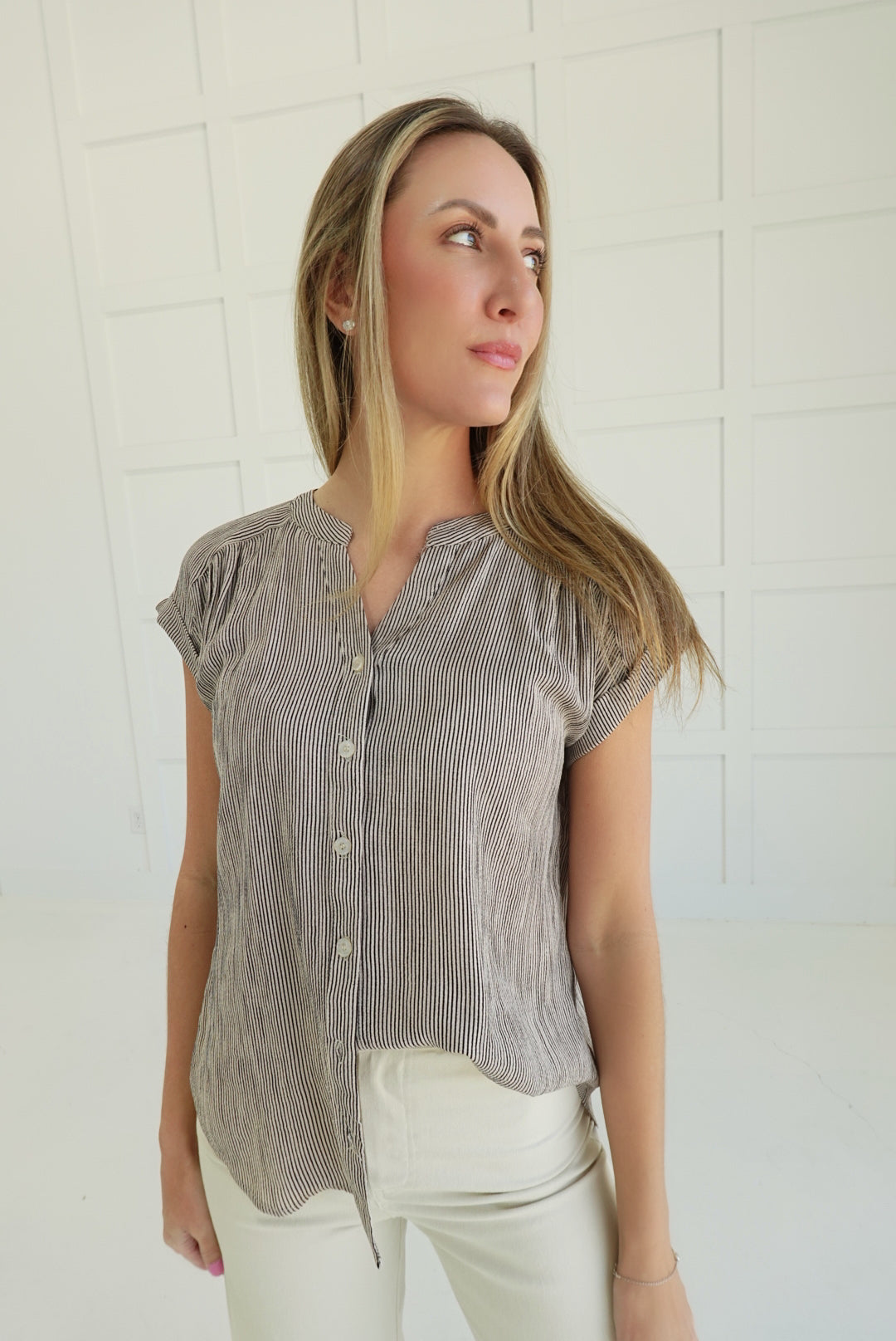 Elevate your everyday with the Leeway Pinstripe Top in Champagne—a bold take on the classic button-down. Sharp pinstripes command attention while the short cuff sleeves keep things fresh and modern. Crafted for those who refuse to blend in, this piece transitions seamlessly from office to evening with undeniable style. The structured fit and refined details make it a daring essential that works harder than it looks.