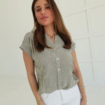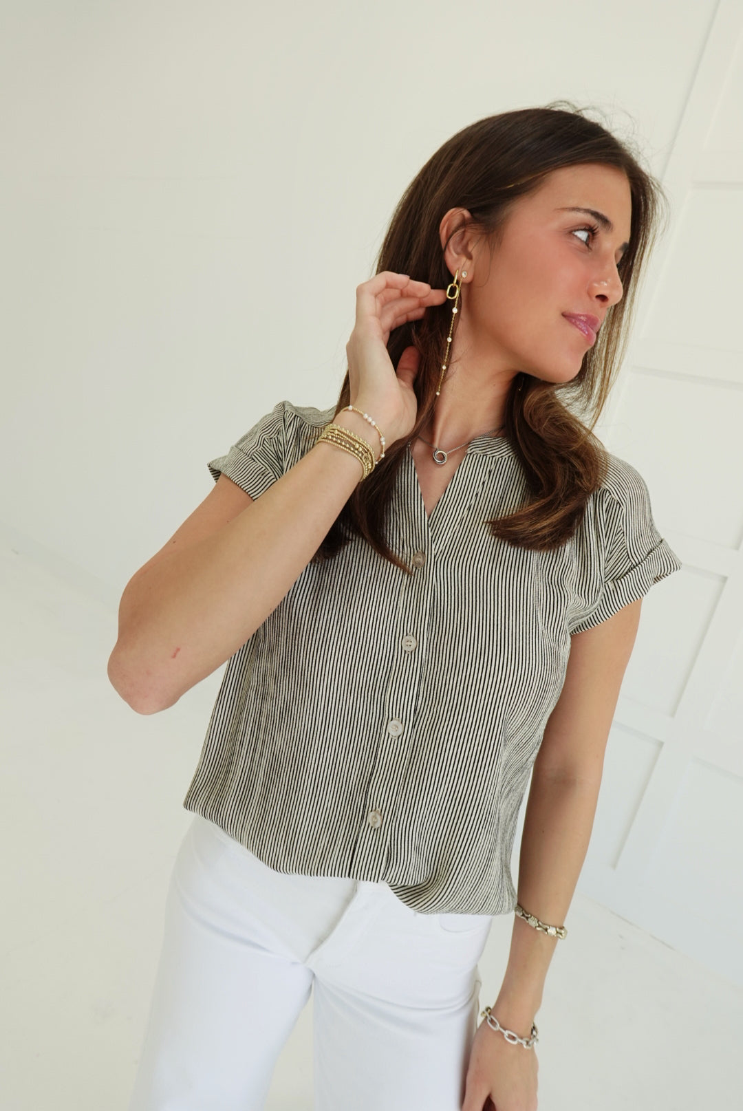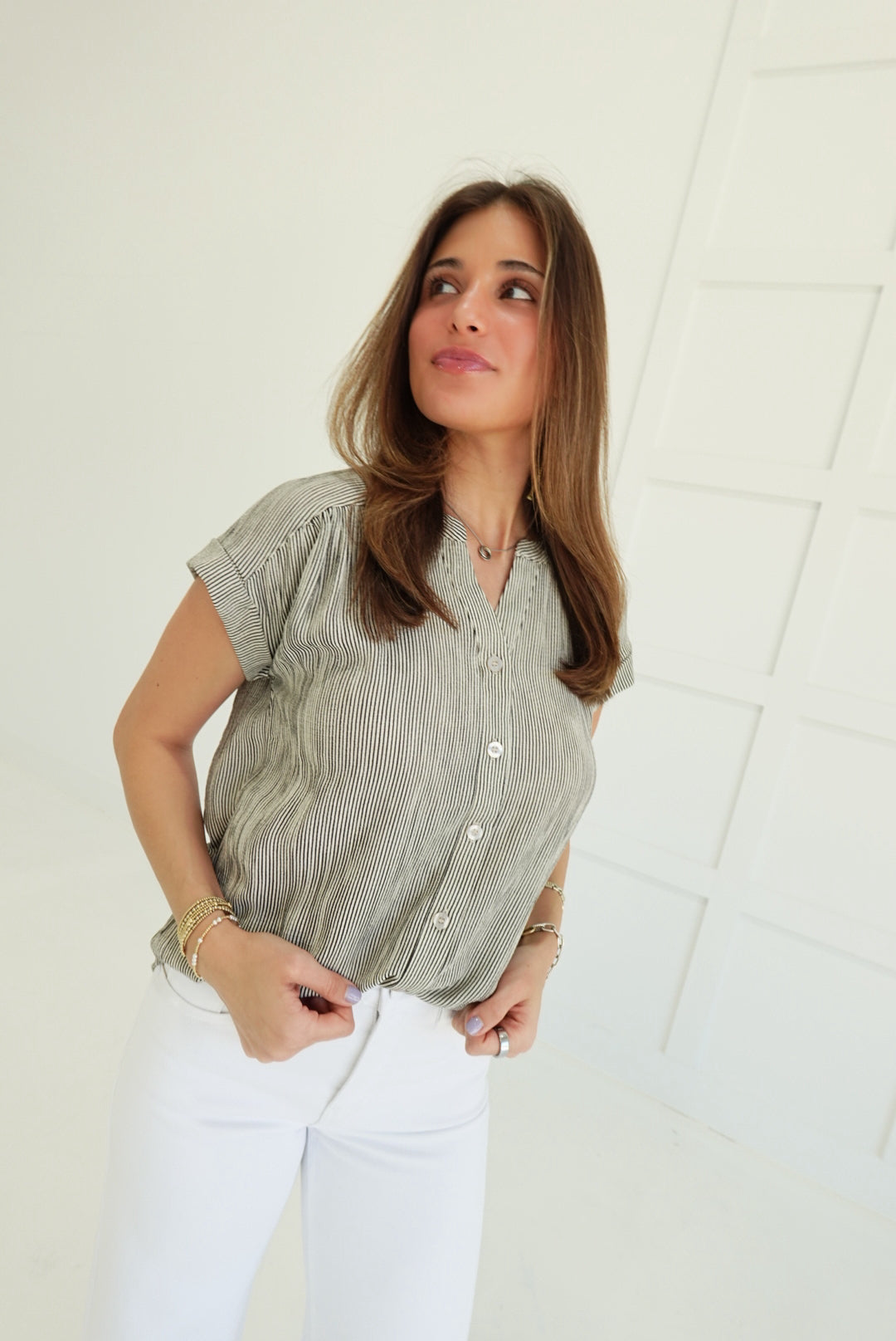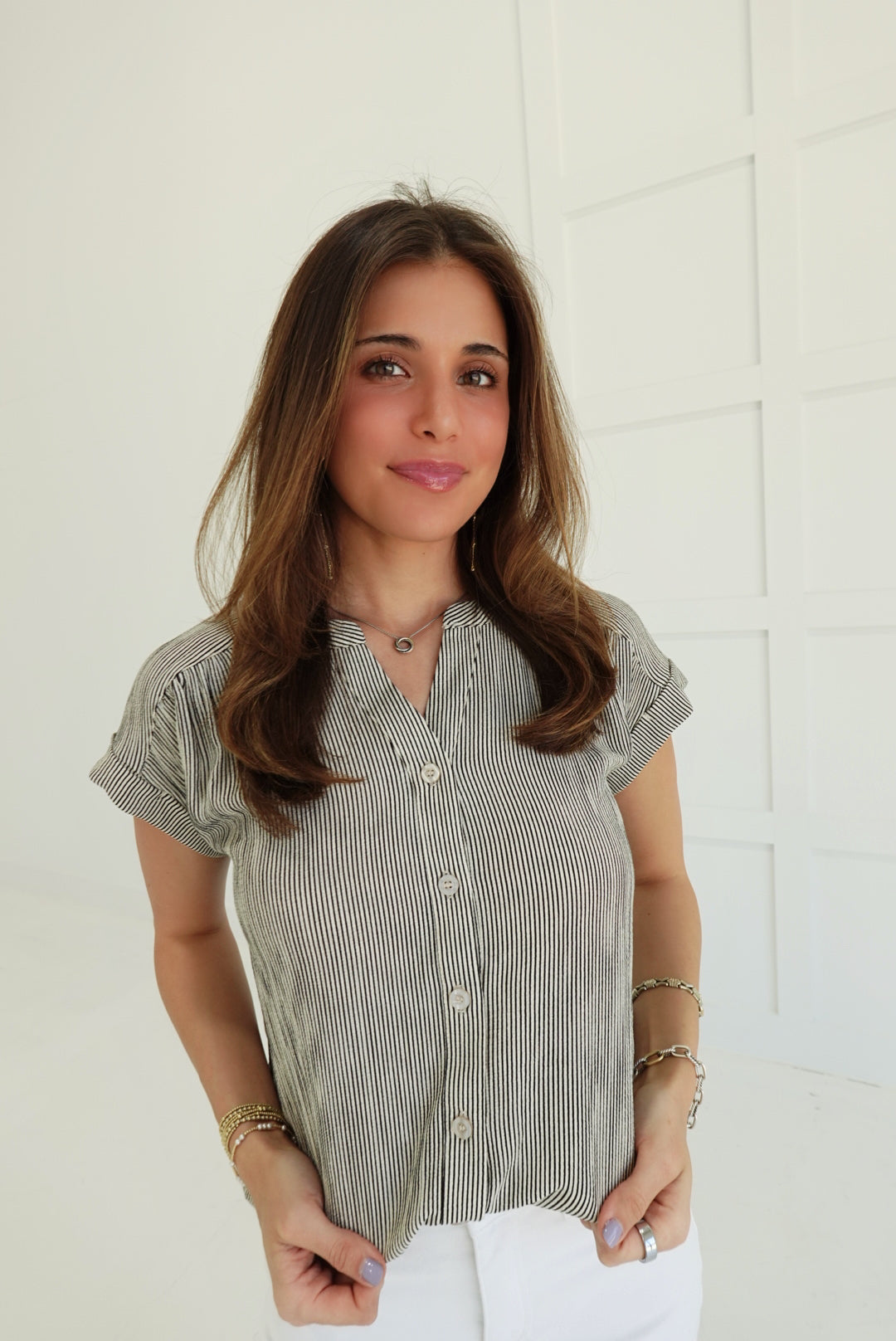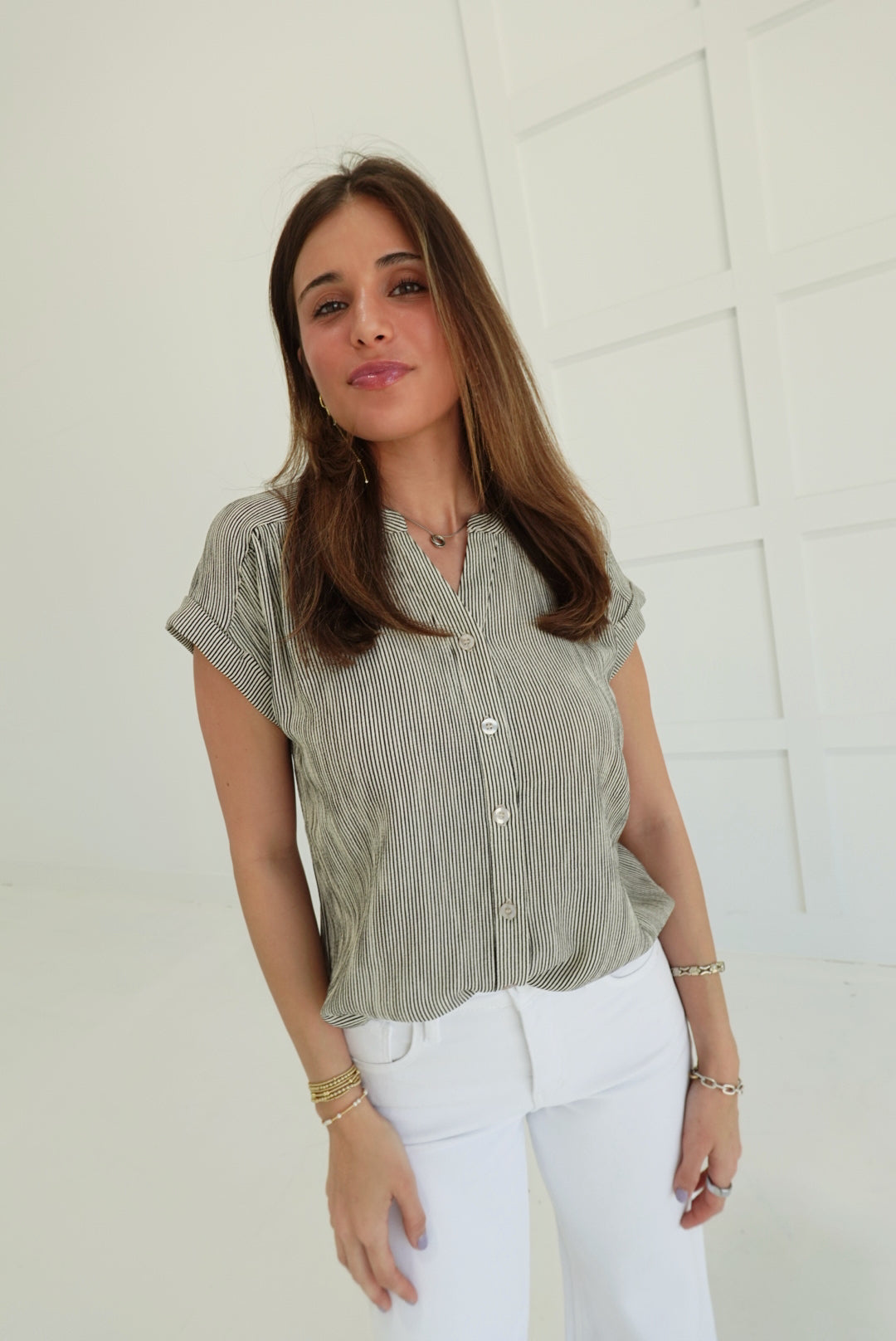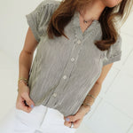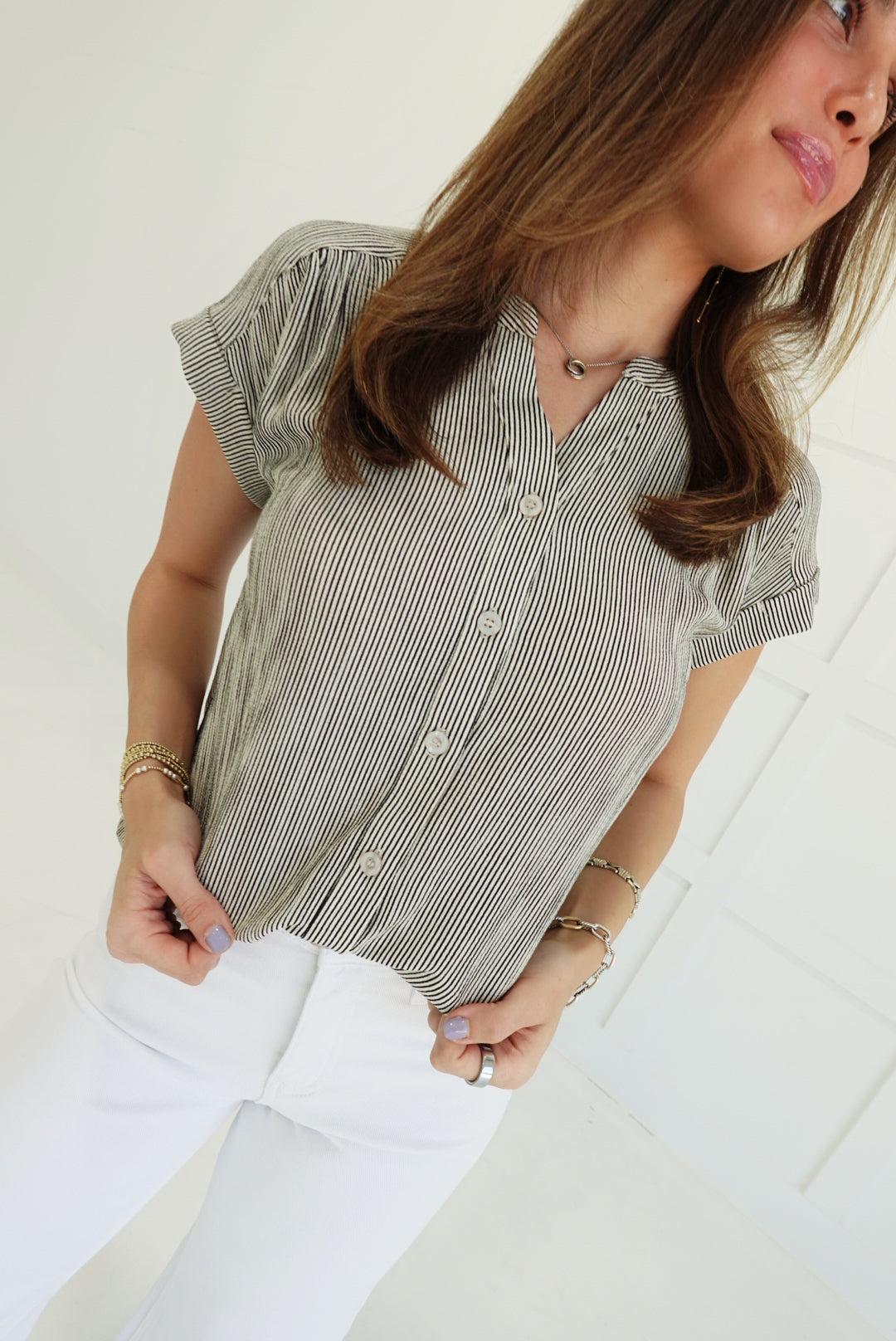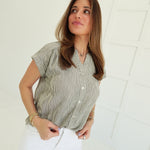 Elevate your everyday with the Leeway Pinstripe Top in Ivory—a bold take on the classic button-down. Sharp pinstripes command attention while the short cuff sleeves keep things fresh and modern. Crafted for those who refuse to blend in, this piece transitions seamlessly from office to evening with undeniable style. The structured fit and refined details make it a daring essential that works harder than it looks.