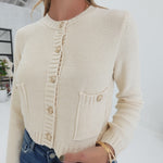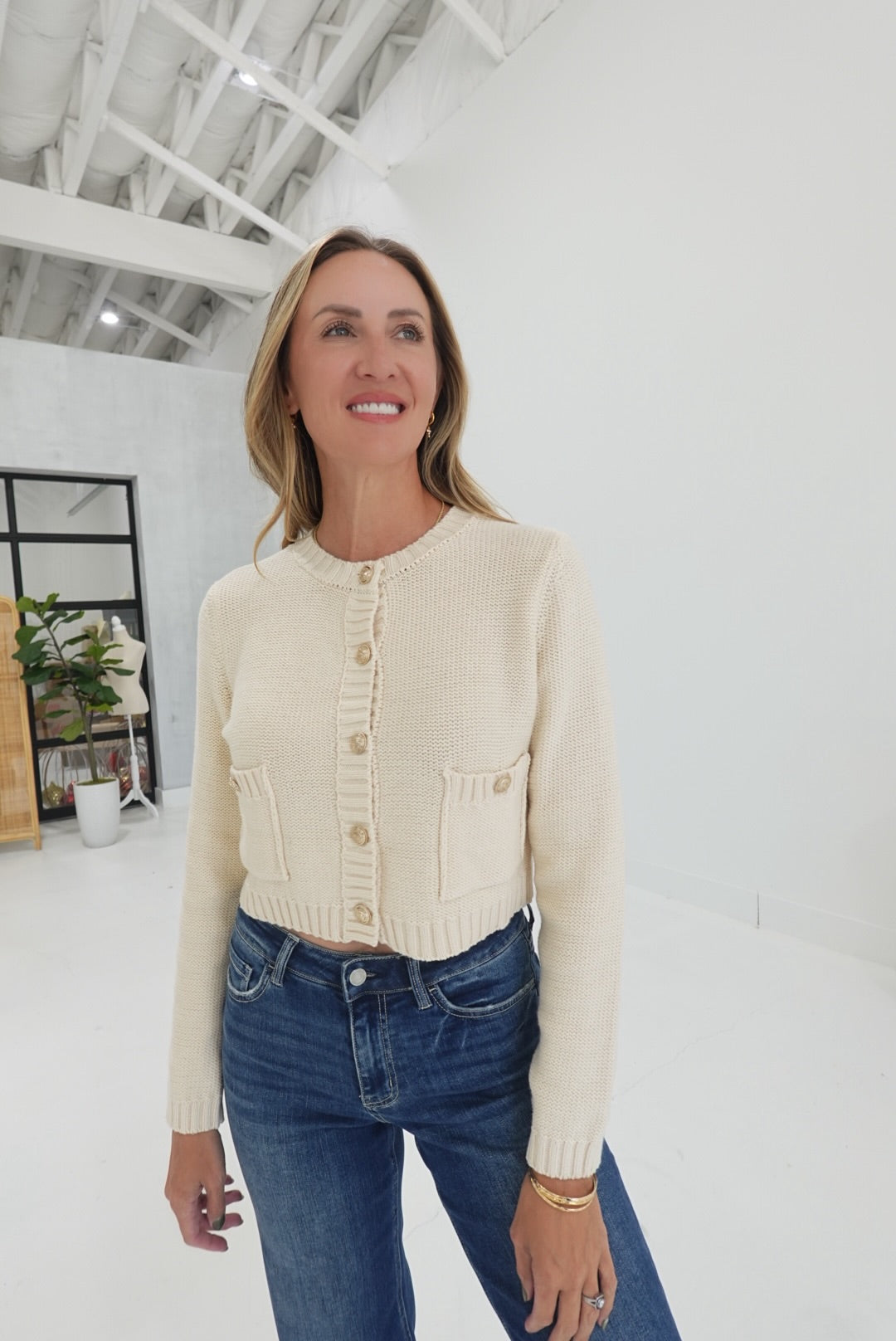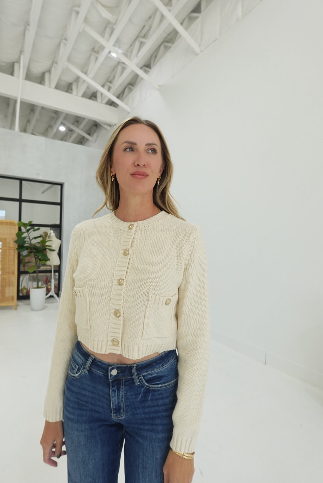 The Left Behind Sweater features a cozy ribbed trim and elegant gold buttons that add a touch of sophistication to your casual look. Crafted for comfort and style, this knit cardigan offers warmth while maintaining a flattering fit. Perfect for layering on cooler days, it effortlessly combines practicality with refined detail to keep you comfortable and confident all day long.