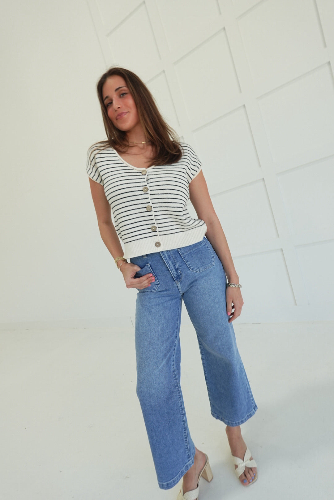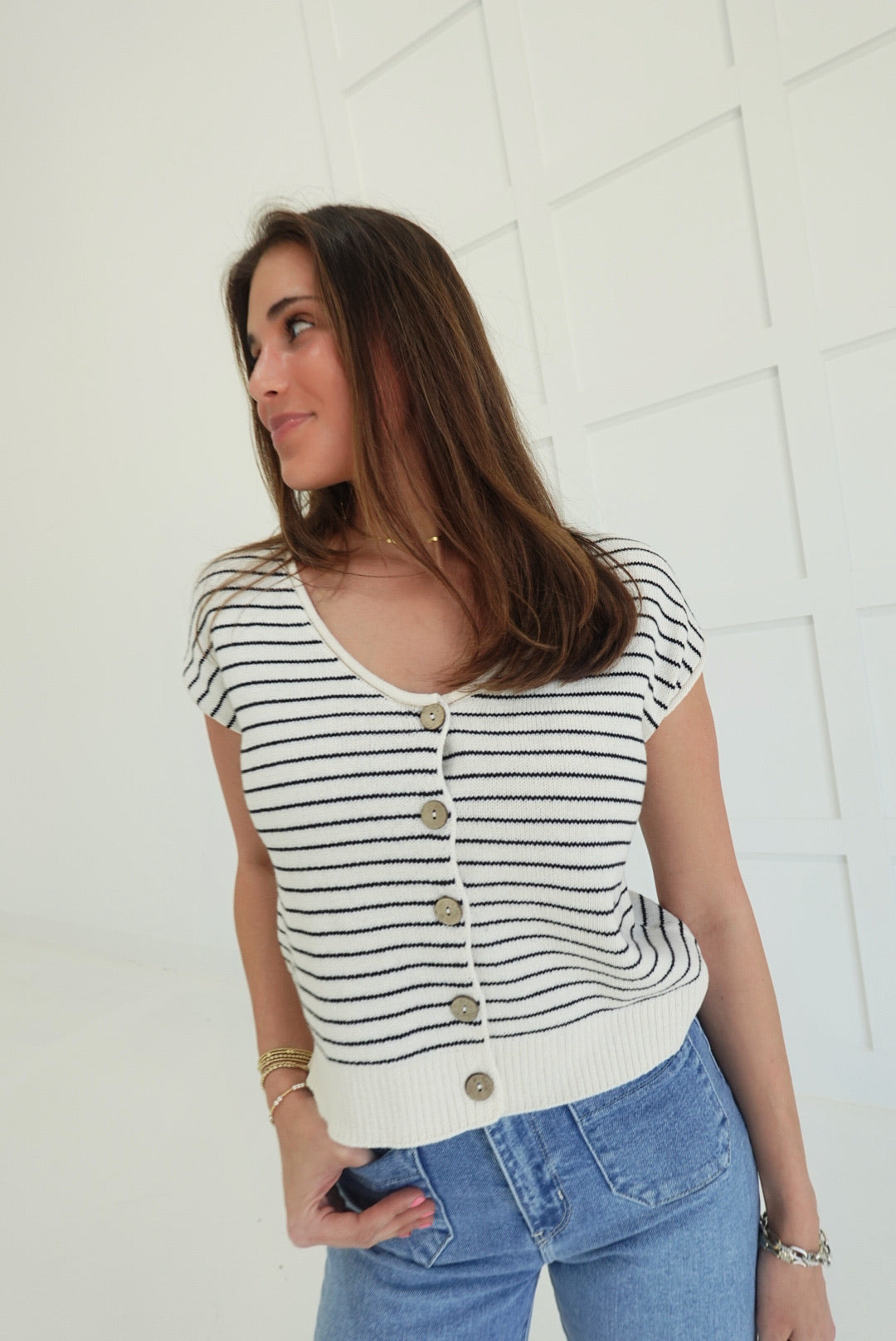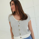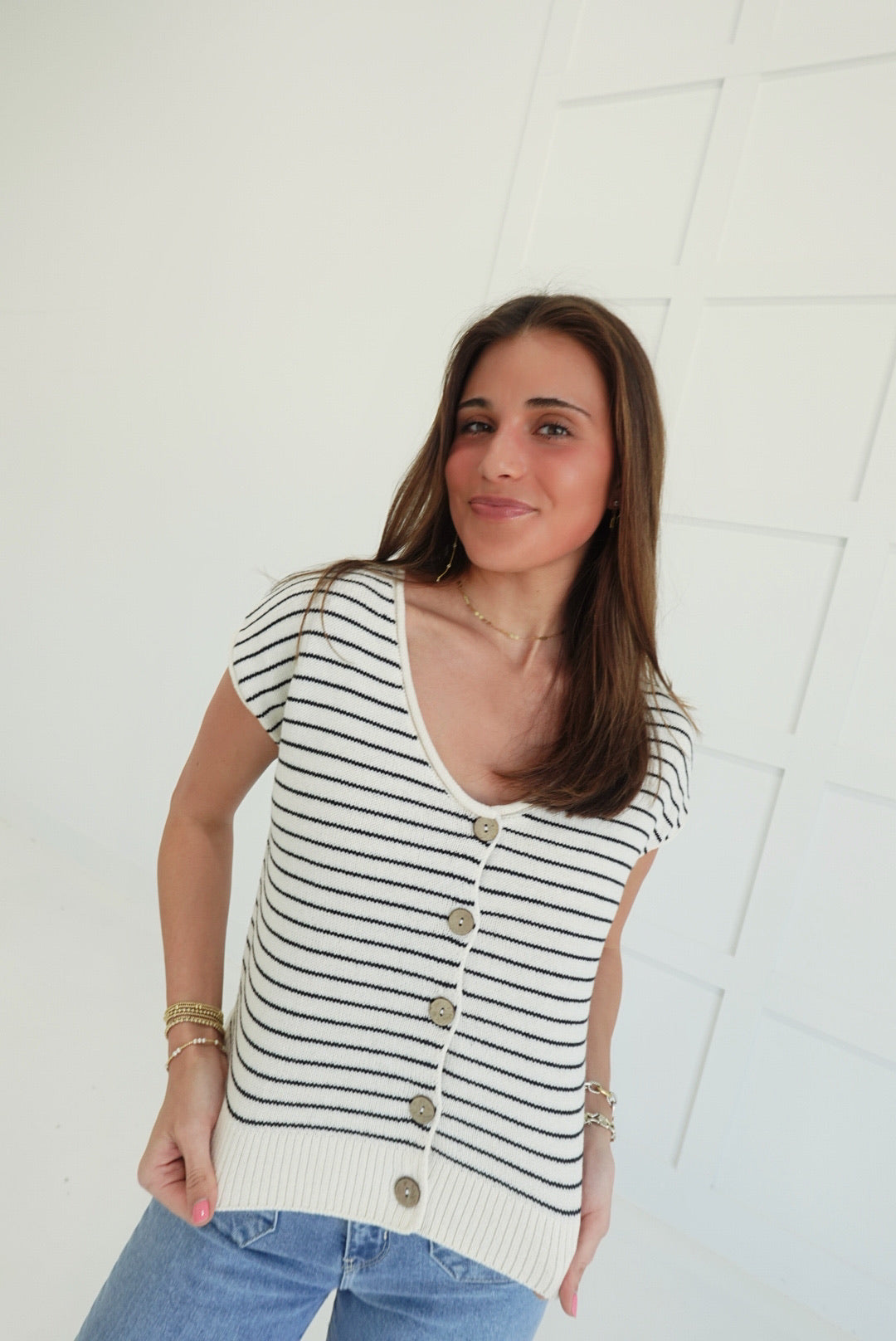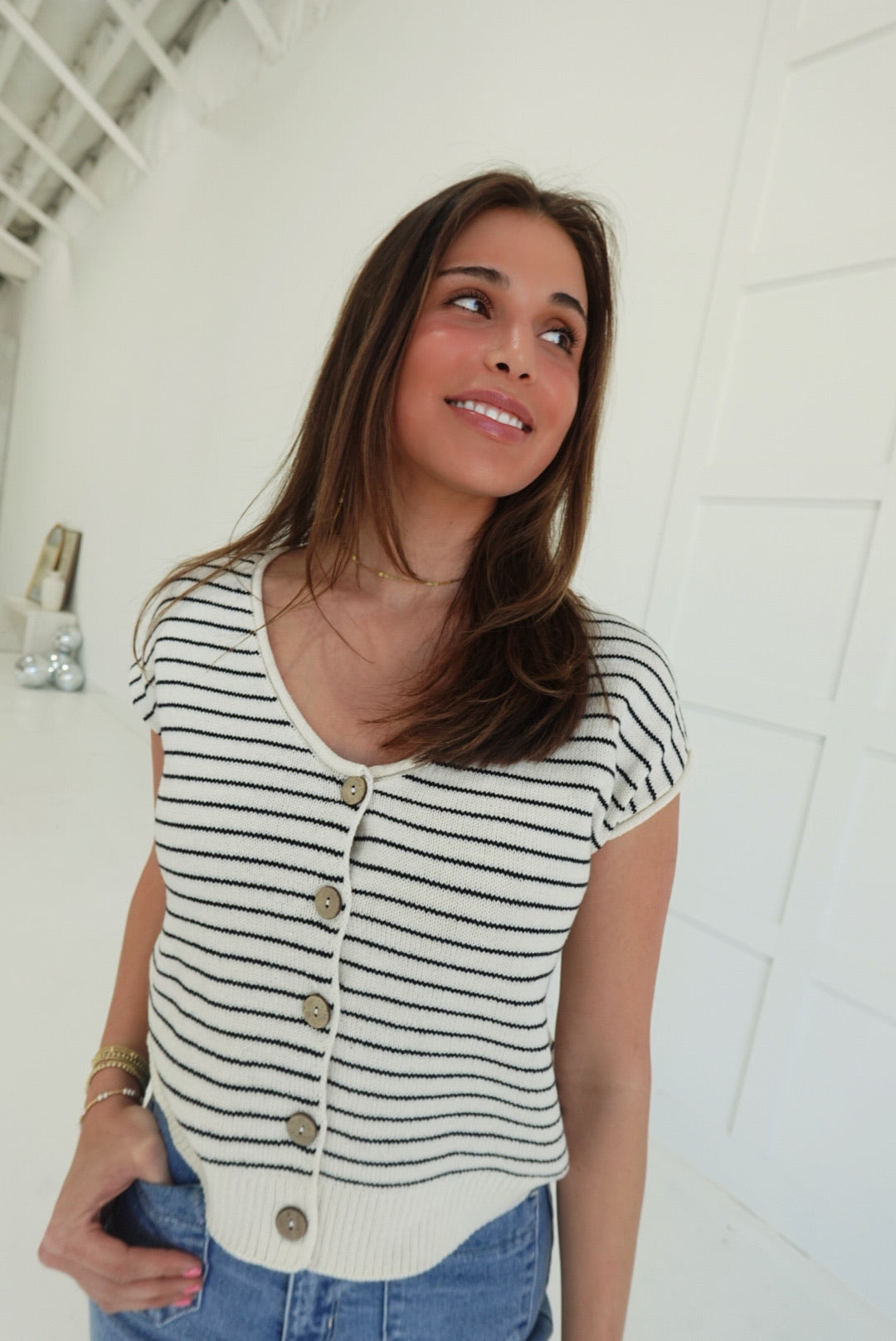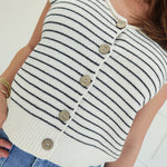 Stripe Scoop Neck Raw Edge Short Sleeve Cardigan Effortless edge meets everyday versatility. This navy cardigan features bold horizontal stripes and a relaxed scoop neckline that demands attention. Raw-edge detailing on the sleeves adds an intentional, undone aesthetic—perfect for layering over basics or wearing solo. Short sleeves keep it light and modern, while the structured yet comfortable fit works for casual outings or dressed-up moments. A piece that refuses to blend in.