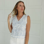 Add some "flower power" to your wardrobe with the Leland Top! This playful blue floral sleeveless top features fun ruffle trim and a stylish button down detail. Perfect for any occasion, this top will keep you looking fresh and fashionable.