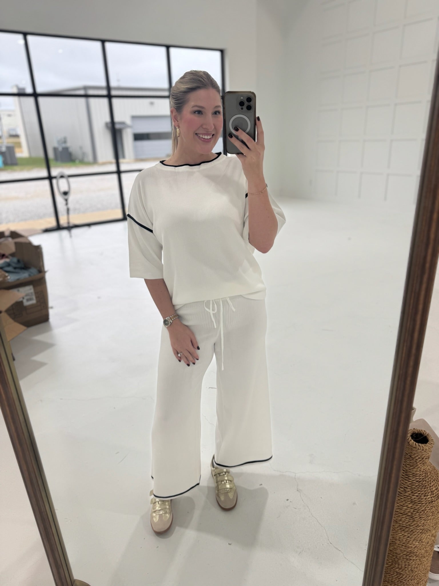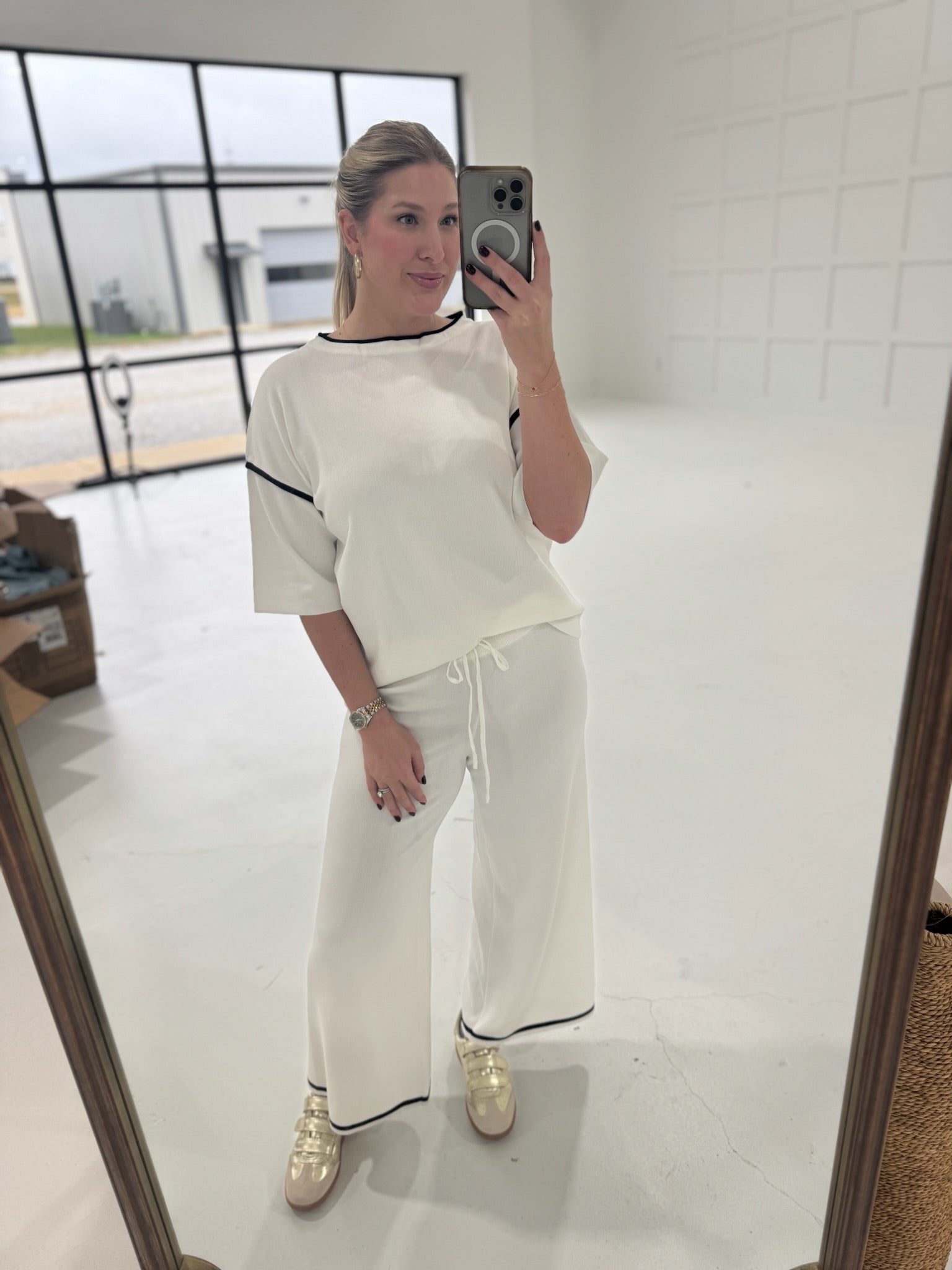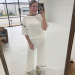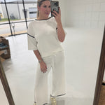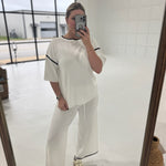Make a bold statement with this daring two-piece ensemble. The white contrast trim half-sleeve top commands attention with its sharp, modern edge, while the loose-fitting drawstring pants deliver effortless comfort without sacrificing style. Perfect for those who refuse to play it safe—layer it, own it, and let your confidence do the talking. This sweater suit breaks the rules and rewrites them.