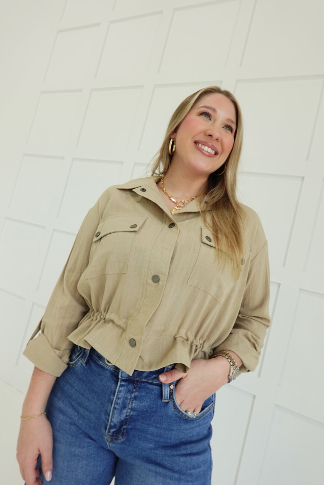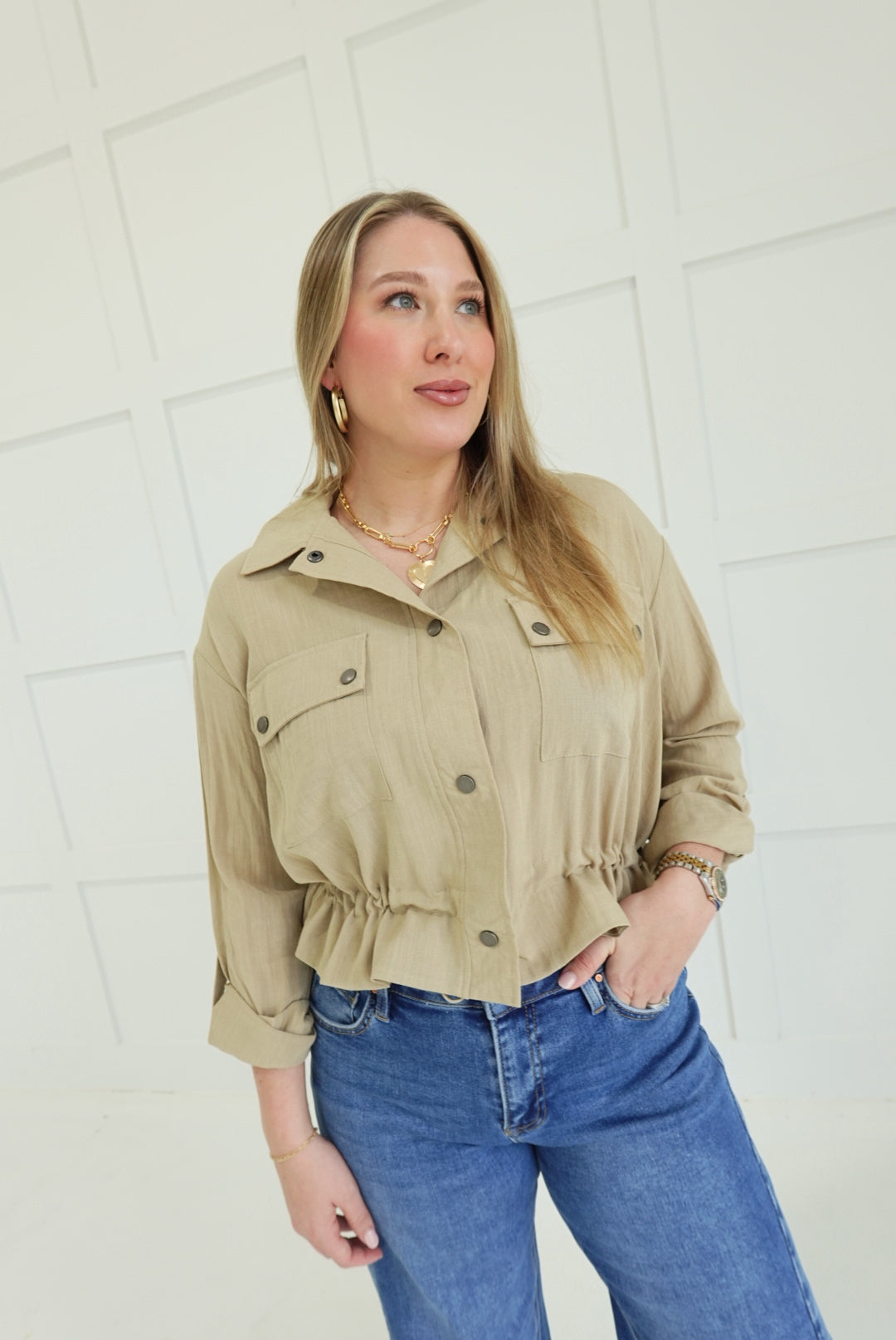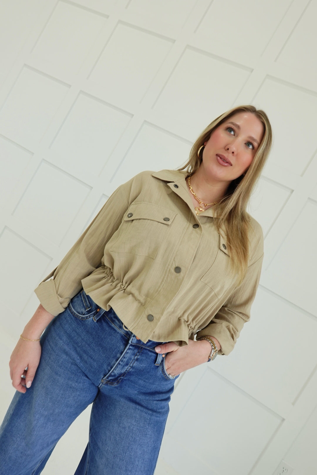 Throw caution to the wind with this fearless Lighter Layer Jacket. The sharp collared neckline commands attention while three-quarter tab sleeves offer versatile coverage that transitions seamlessly from season to season. A drawstring waist lets you dial in your silhouette with precision, creating a flattering fit that moves with you. In timeless khaki, this jacket pairs with everything in your wardrobe and refuses to play it safe. Bold enough to stand alone, smart enough to layer—this is the piece that makes you feel unstoppable.