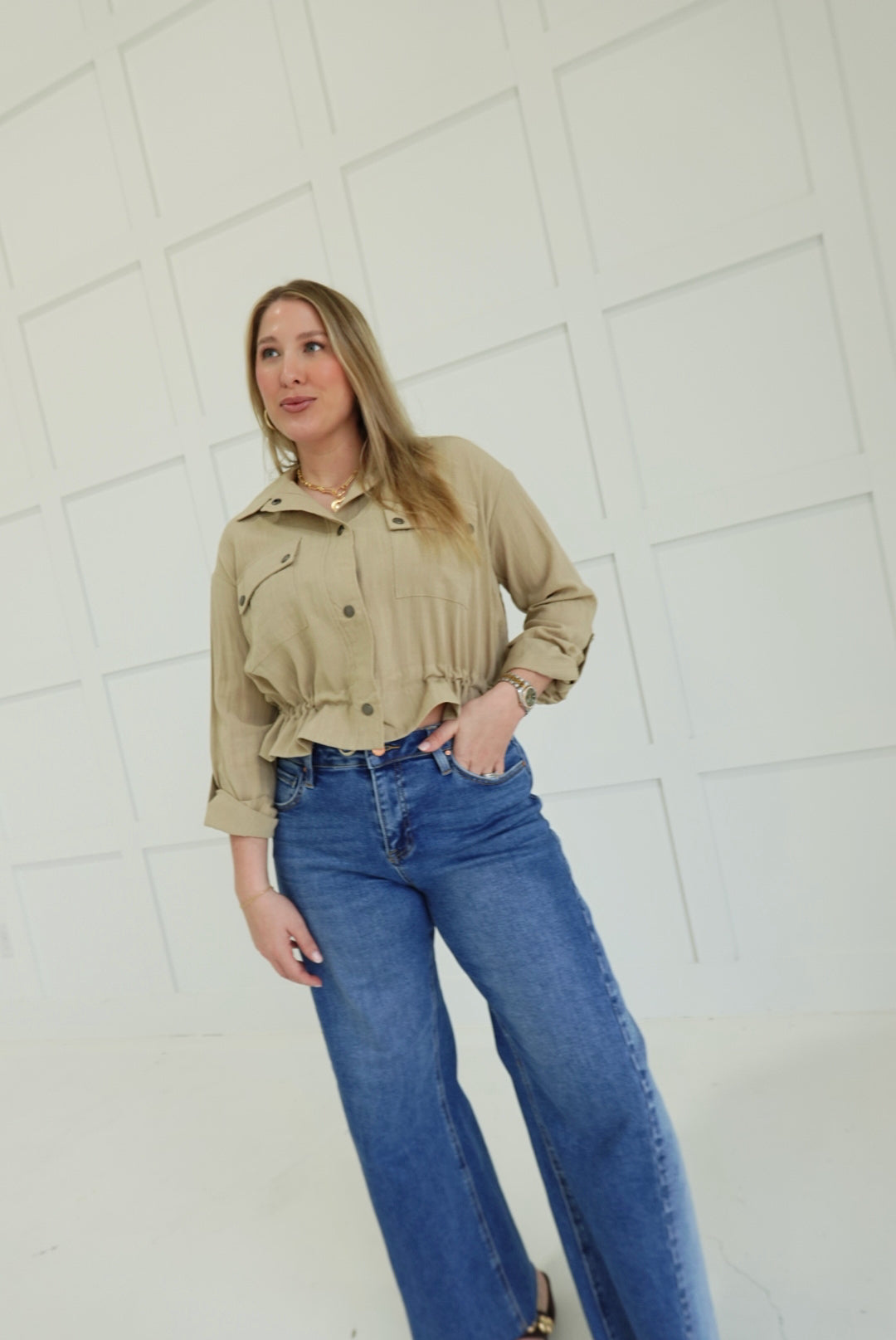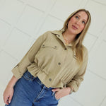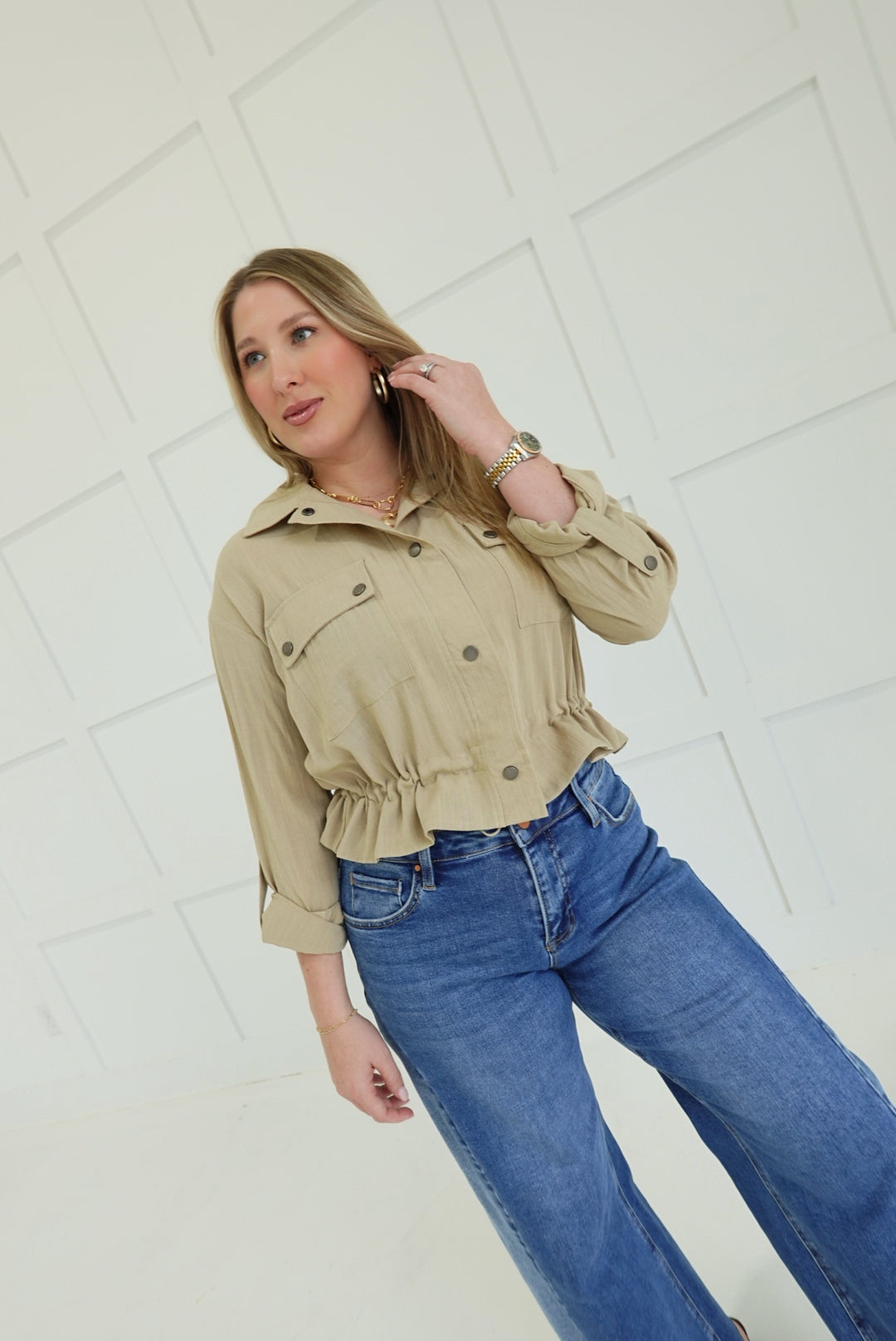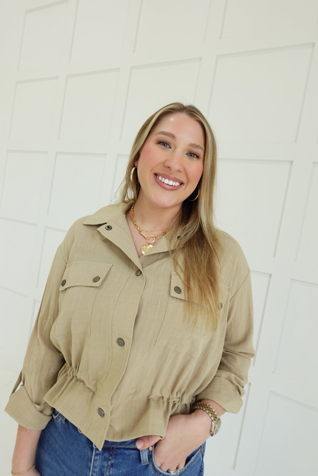 Throw caution to the wind with this fearless Lighter Layer Jacket. The sharp collared neckline commands attention while three-quarter tab sleeves offer versatile coverage that transitions seamlessly from season to season. A drawstring waist lets you dial in your silhouette with precision, creating a flattering fit that moves with you. In timeless khaki, this jacket pairs with everything in your wardrobe and refuses to play it safe. Bold enough to stand alone, smart enough to layer—this is the piece that makes you feel unstoppable.