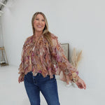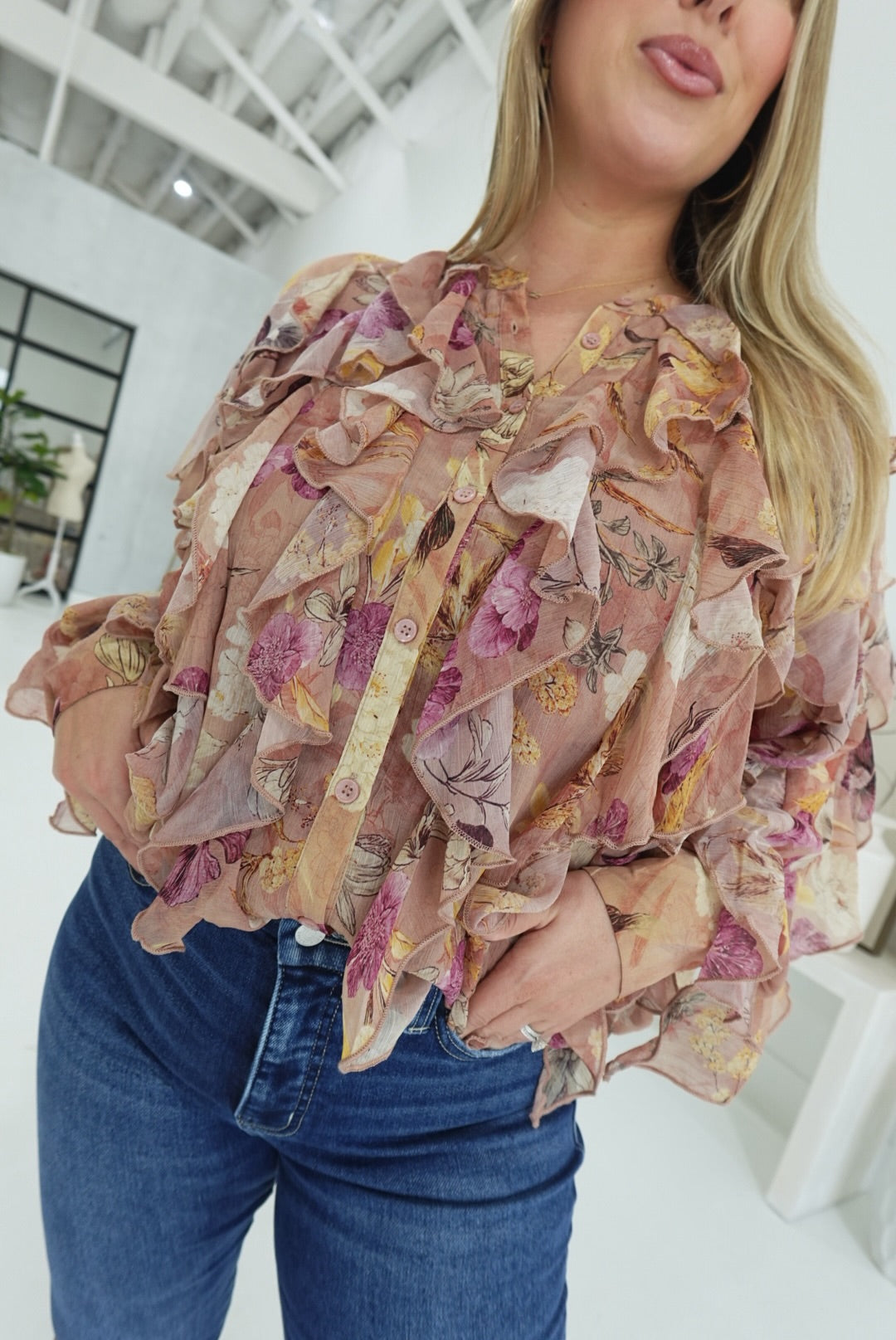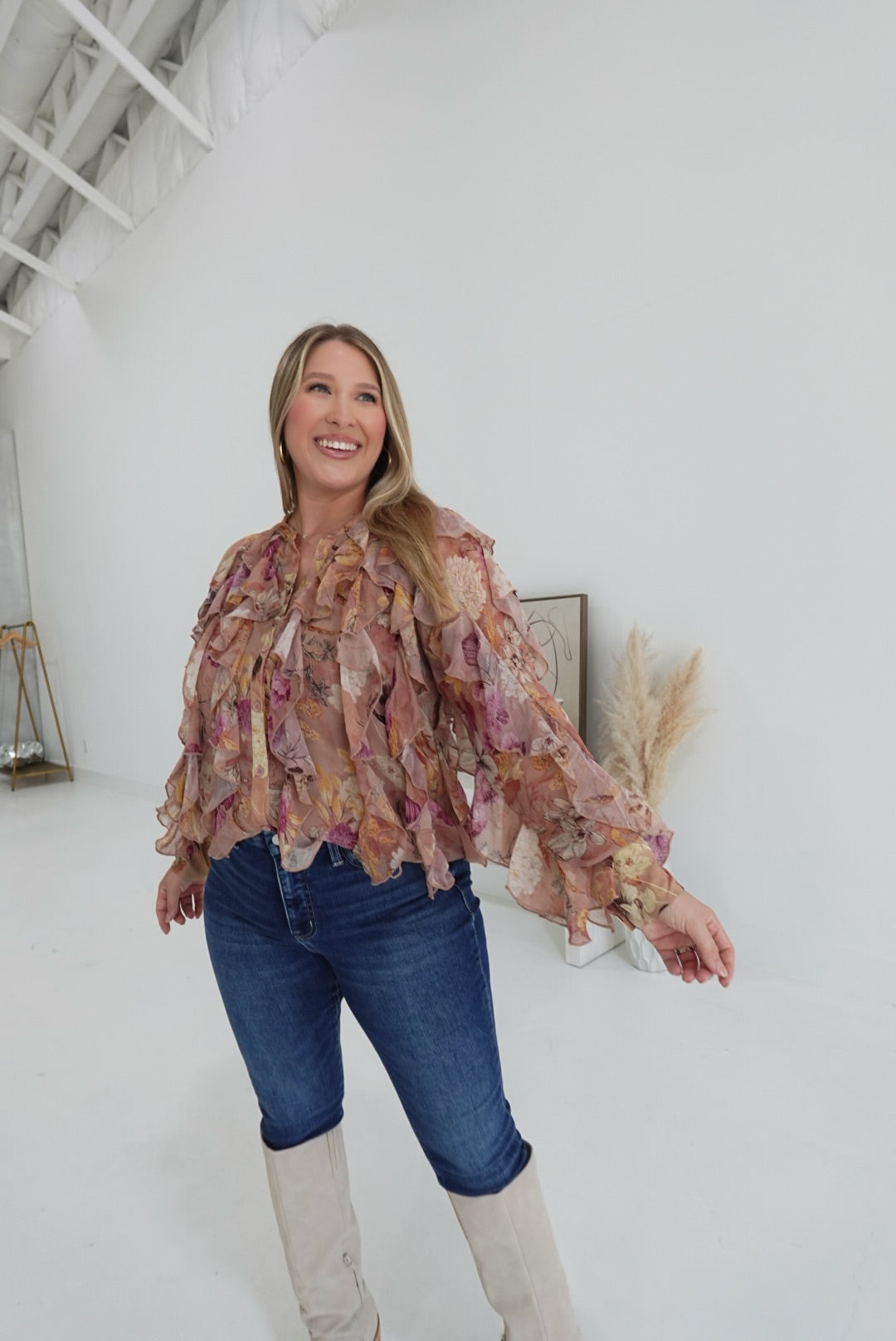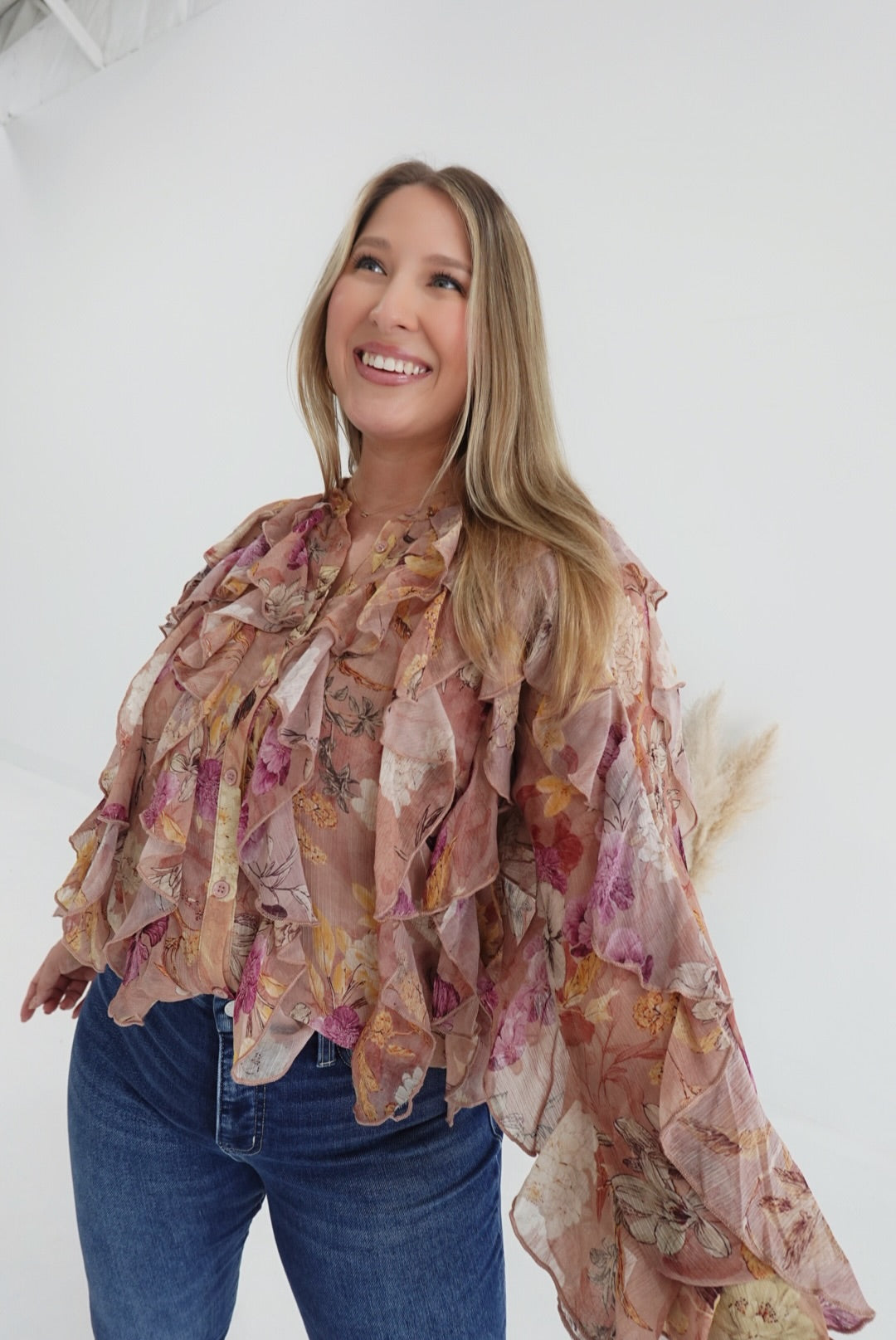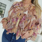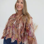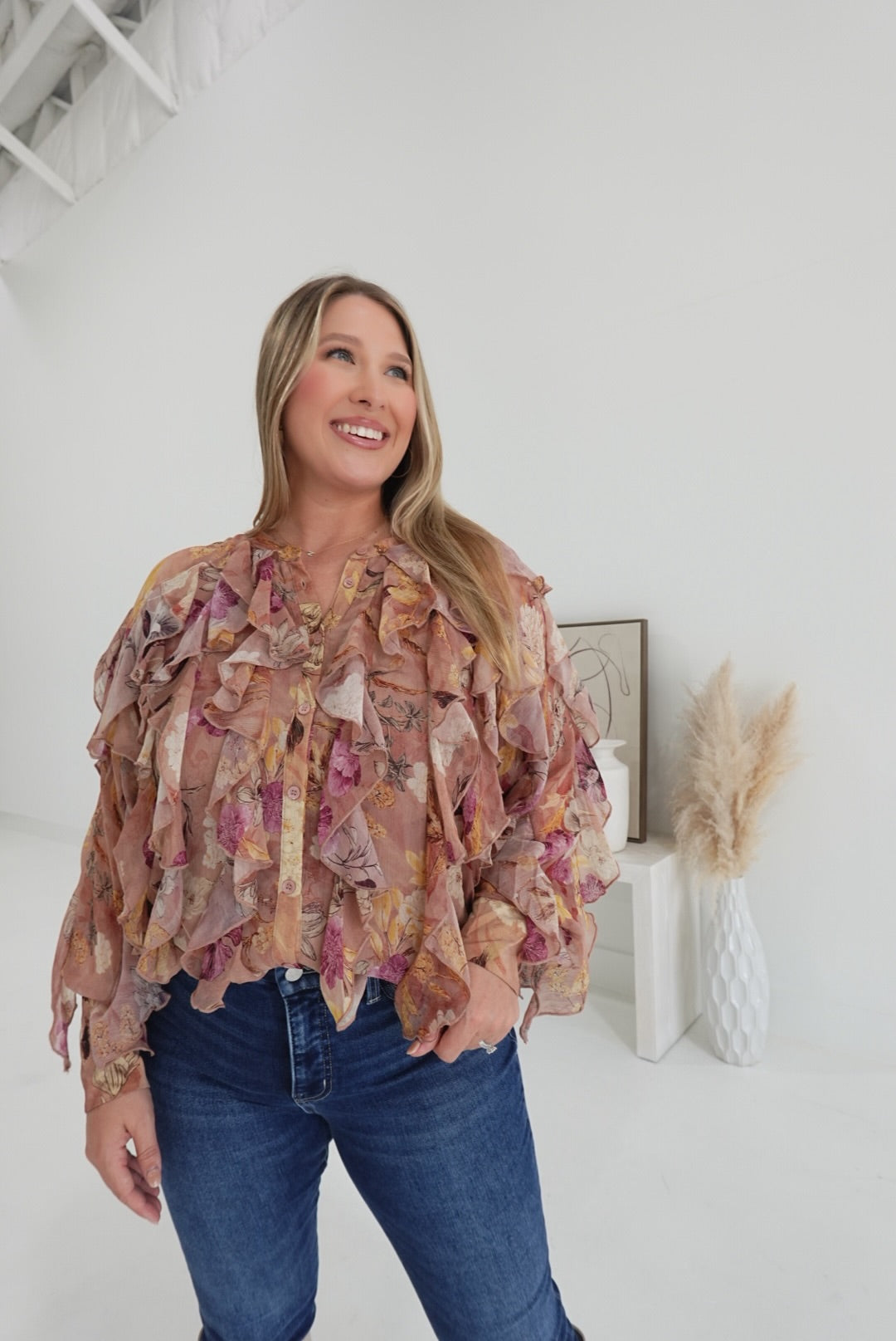 The Lindsey Cascading Top features a delicate floral print on lightweight chiffon, enhanced by cascading ruffle details that add graceful movement and feminine charm. Its soft fabric and flowing design offer all-day comfort while creating an effortlessly elegant look. Perfect for layering or wearing on its own, this blouse brings a touch of sophistication to your wardrobe with a gentle, flattering silhouette.