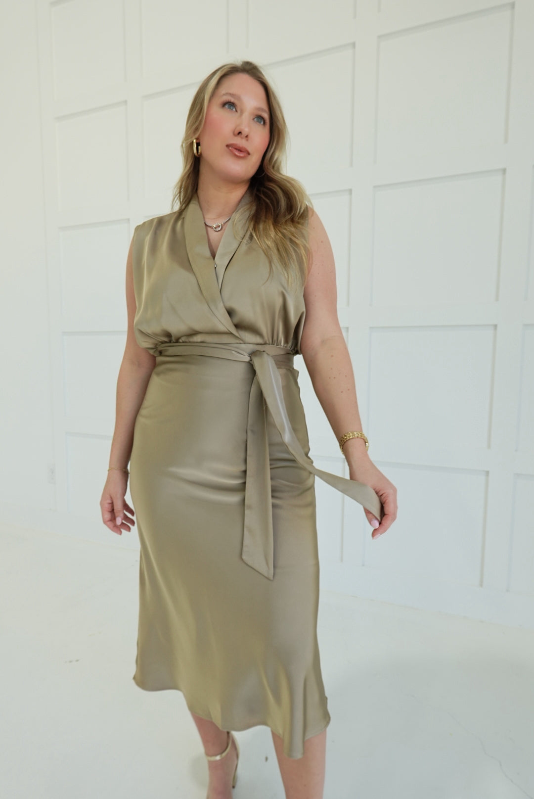 Live A Little Midi Dress Embrace bold confidence in this striking surplice sleeveless midi dress. The flattering wrap neckline and cinched waist tie create an effortlessly chic silhouette that commands attention. Perfect for those ready to take risks—wear it to dinner, brunch, or anywhere you want to make a statement. The midi length offers sophistication with an edge, ideal for the woman who refuses to play it safe.