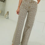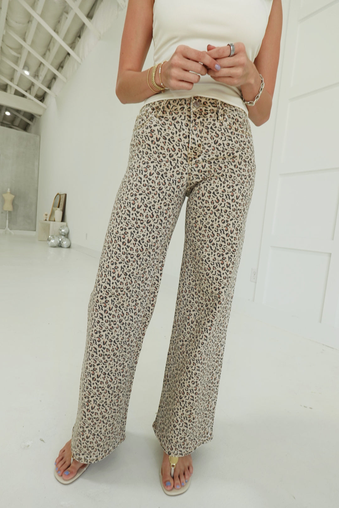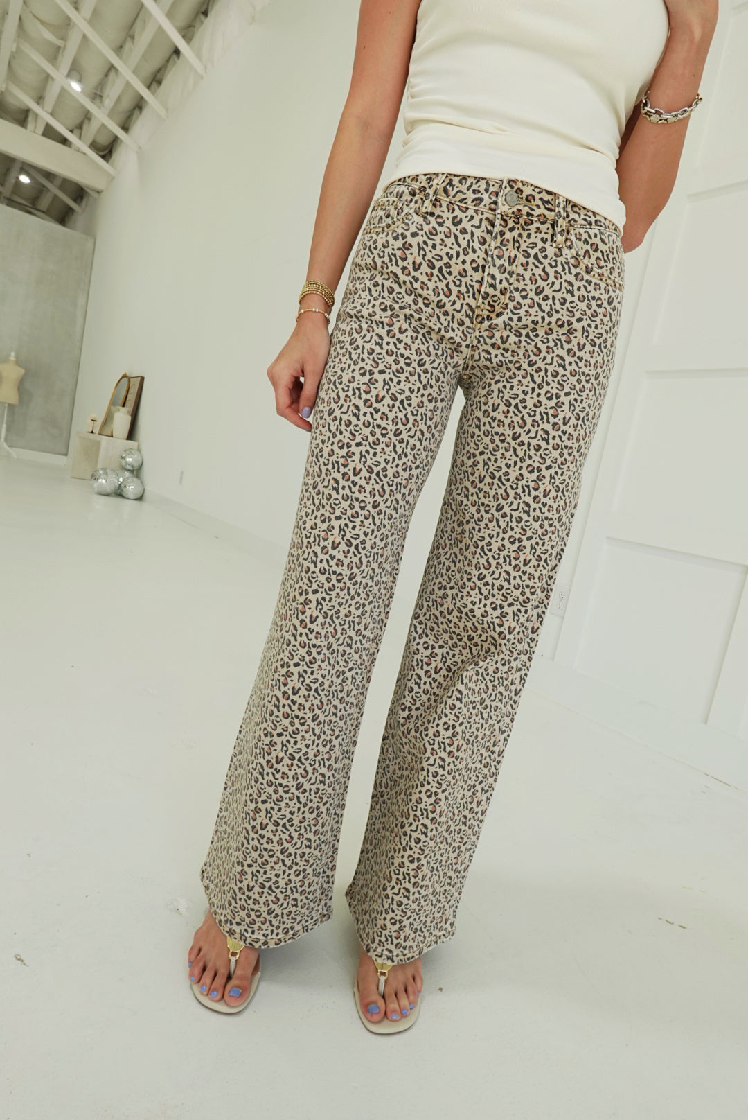 Bold leopard print meets timeless denim silhouette in these statement-making wide leg jeans. The mid-rise cut offers a flattering, modern fit that works with everything from crop tops to oversized sweaters. Crafted for confident style, these jeans transform any outfit into an instant fashion moment. Perfect for those ready to take risks and stand out.