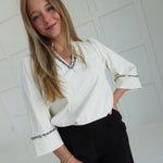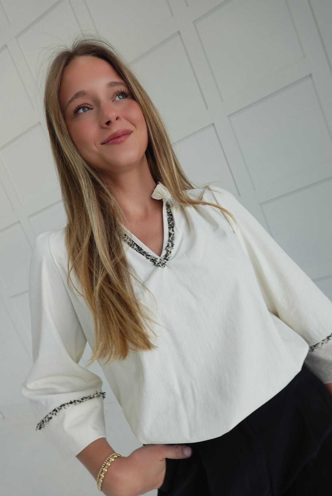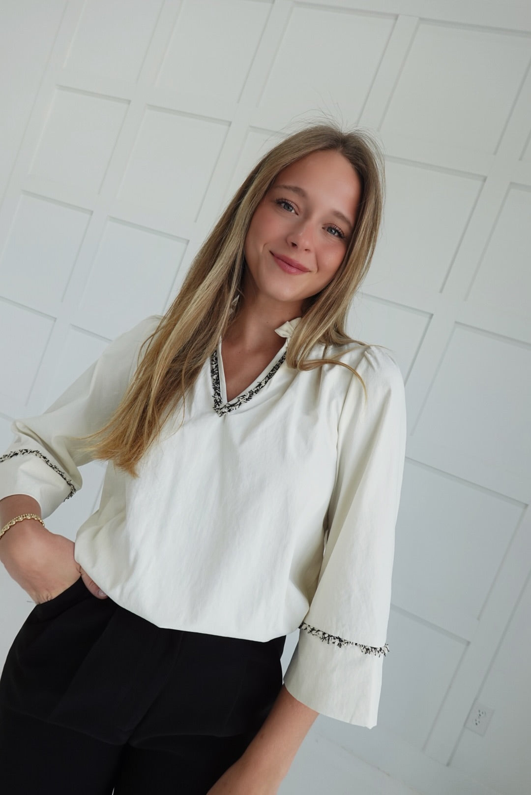 The Lois Embellished Blouse features a charming ruffled neck and 3/4 length wide sleeves, offering both comfort and style. Its delicate frayed fringe trim adds a unique touch, making it perfect for elevating your everyday wardrobe with ease. This blouse combines elegance and ease, supporting your desire for a versatile, flattering piece.