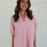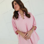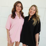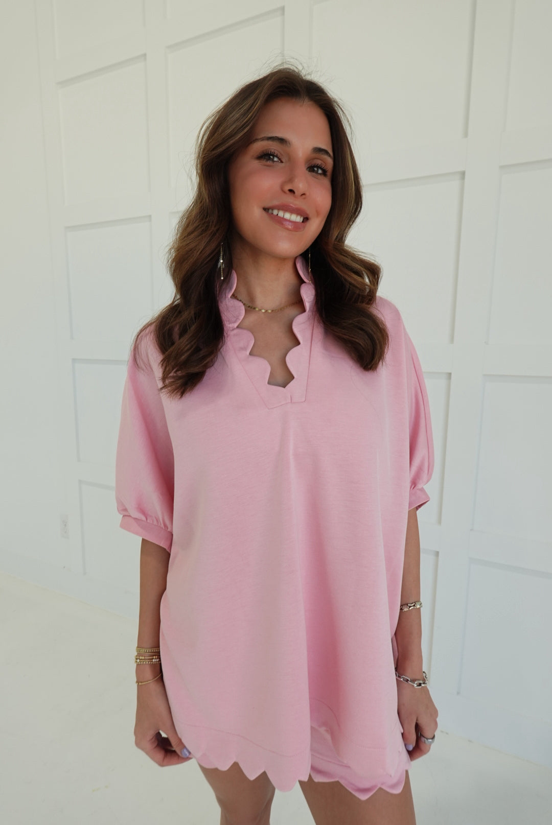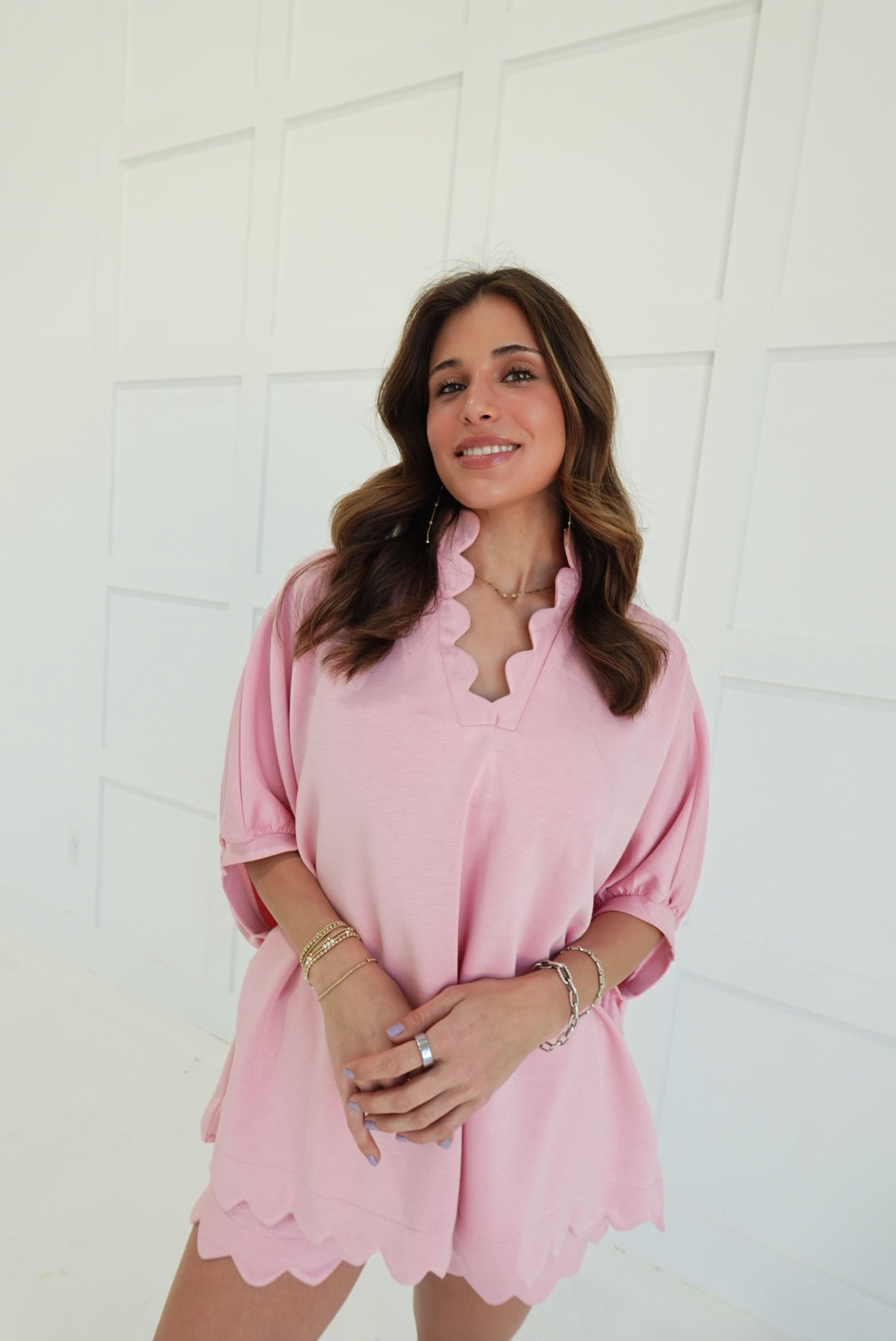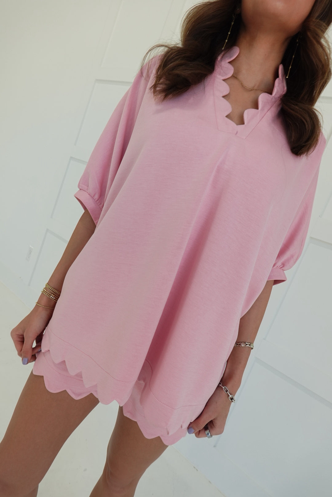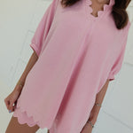 Embrace bold confidence in the Lorelai Scalloped Set. This daring two-piece combines an oversized top with a scalloped neckline that frames the collarbone with playful edge, paired with elastic waist shorts featuring matching scalloped detailing. The relaxed silhouette moves with you while the signature scallop trim adds unexpected sophistication. Perfect for those who refuse to blend in—wear it as a statement set or style the pieces separately for versatile, head-turning looks.