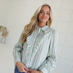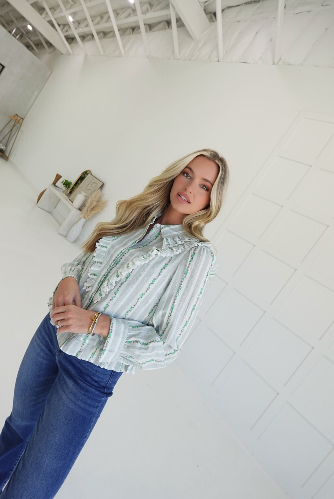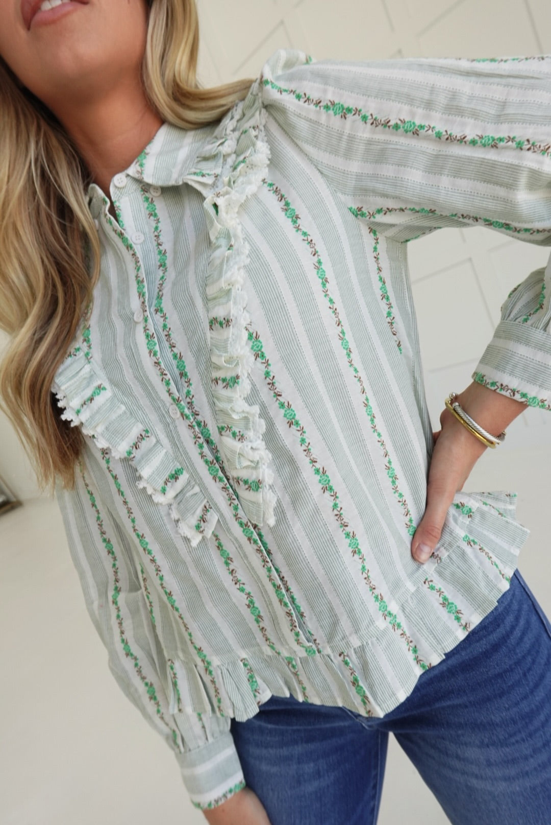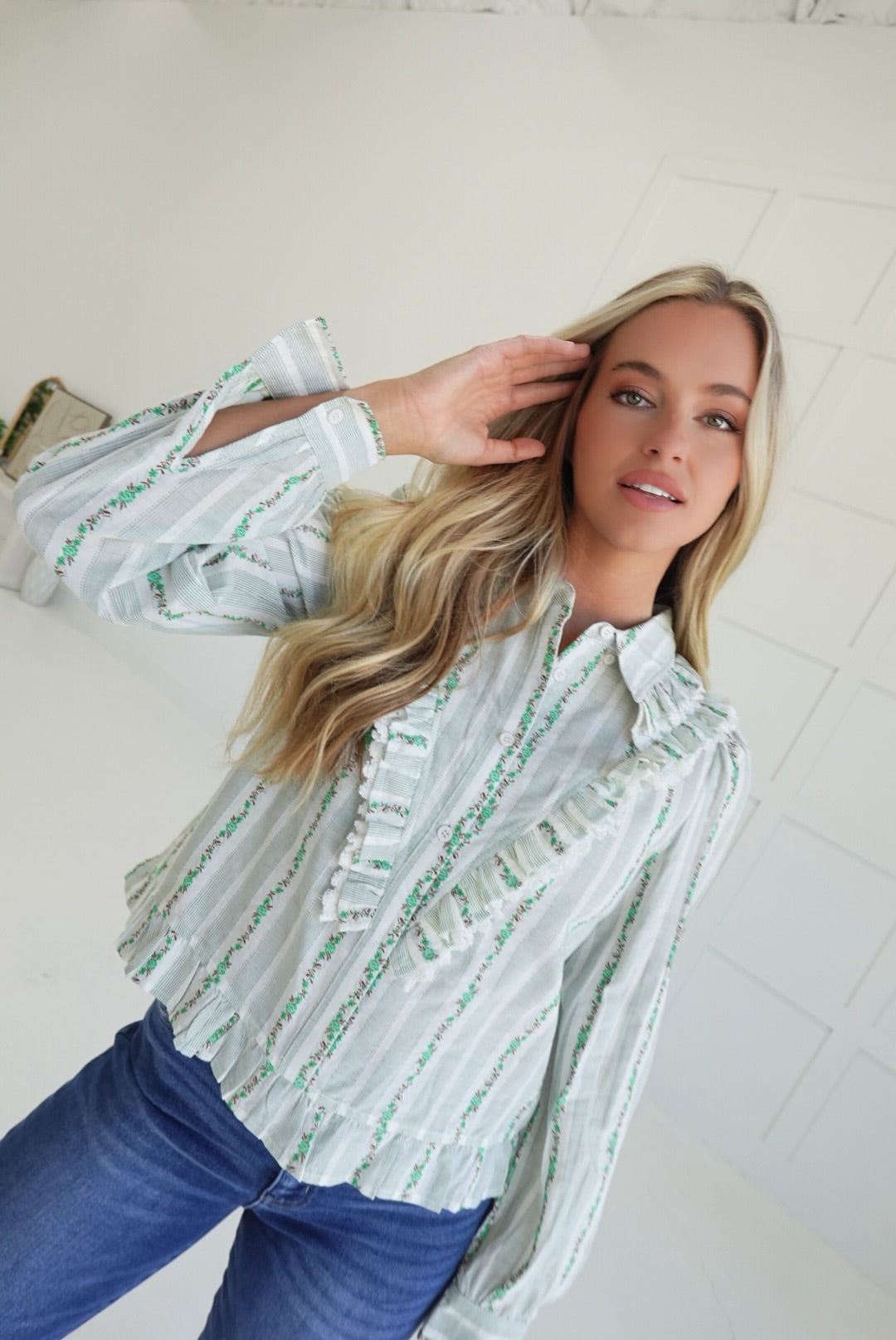The Lorraine Ruffled Top in Green features delicate embroidery and a vintage-inspired floral design, enhanced by soft ruffles for a touch of feminine charm. Crafted to offer both comfort and elegance, this blouse pairs beautifully with your favorite jeans or skirts, making it a versatile addition to your wardrobe. Embrace a timeless look that supports your style with subtle details that stand out gracefully.