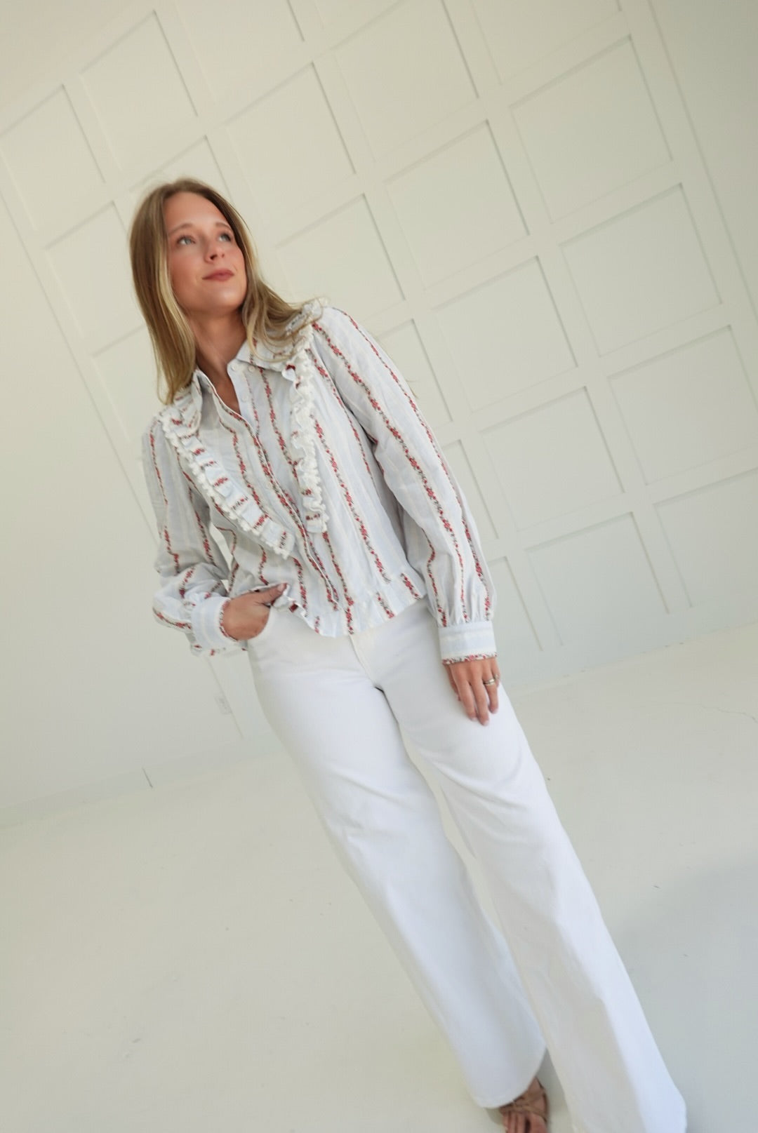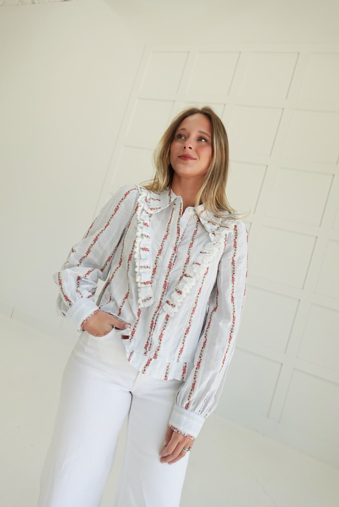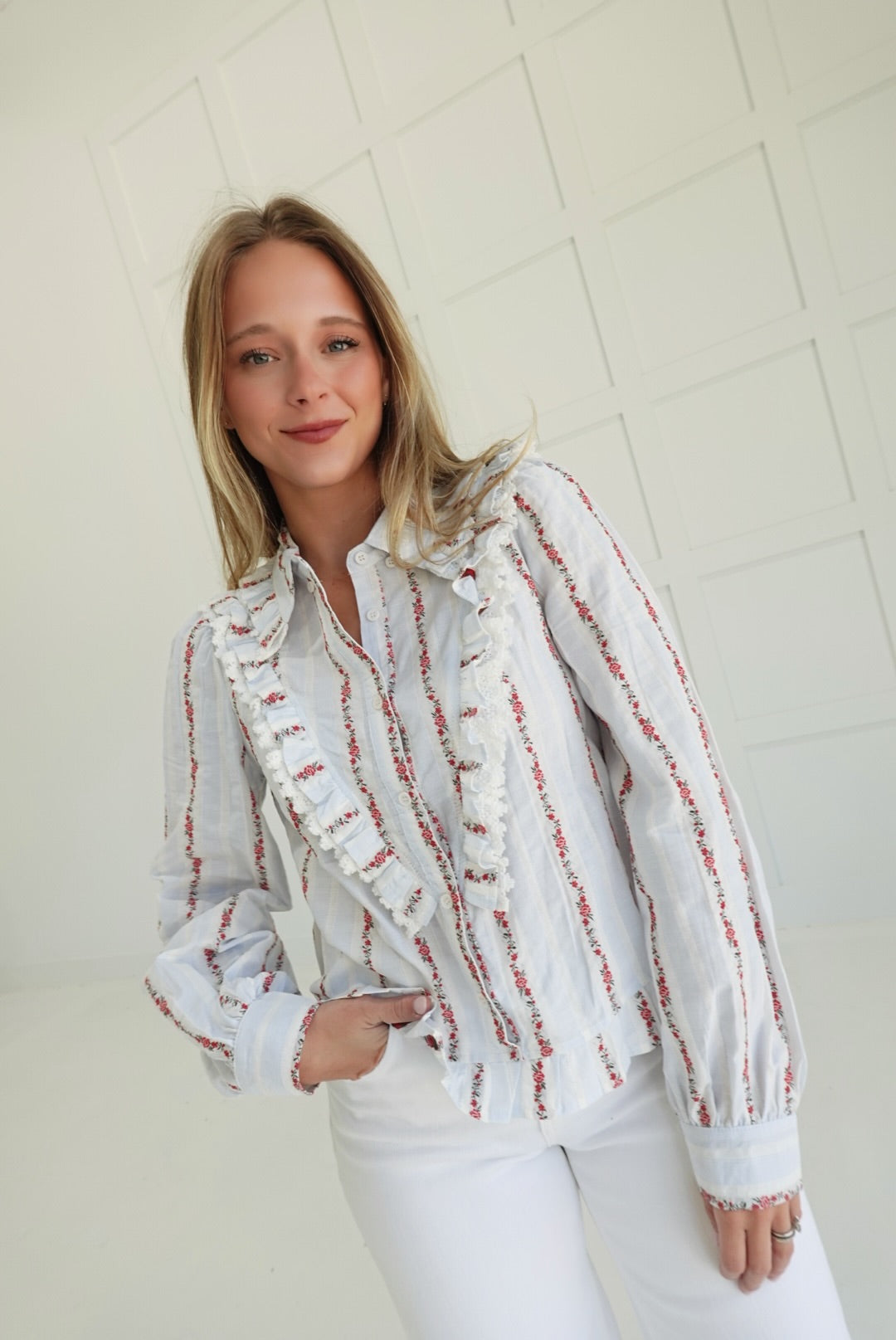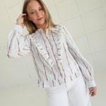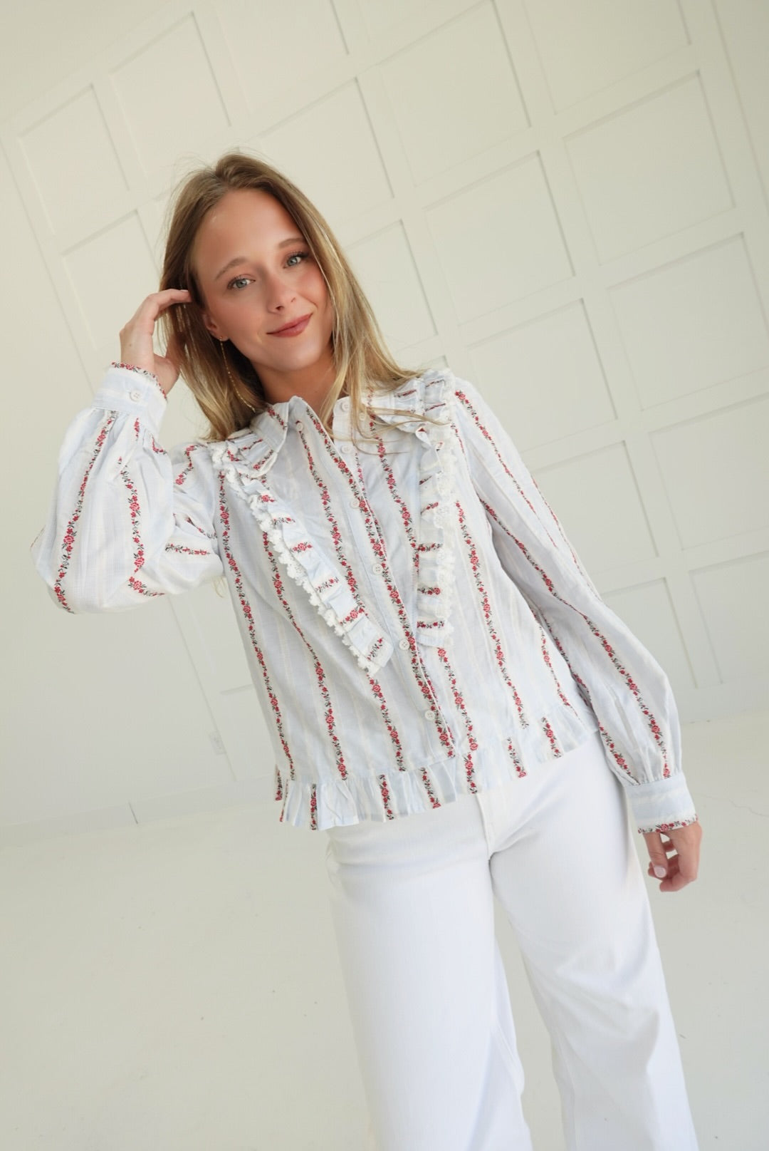 The Lorraine Ruffled Top features delicate embroidery and a vintage-inspired floral design, enhanced by soft ruffles for a touch of feminine charm. Crafted to offer both comfort and elegance, this blouse pairs beautifully with your favorite jeans or skirts, making it a versatile addition to your wardrobe. Embrace a timeless look that supports your style with subtle details that stand out gracefully.