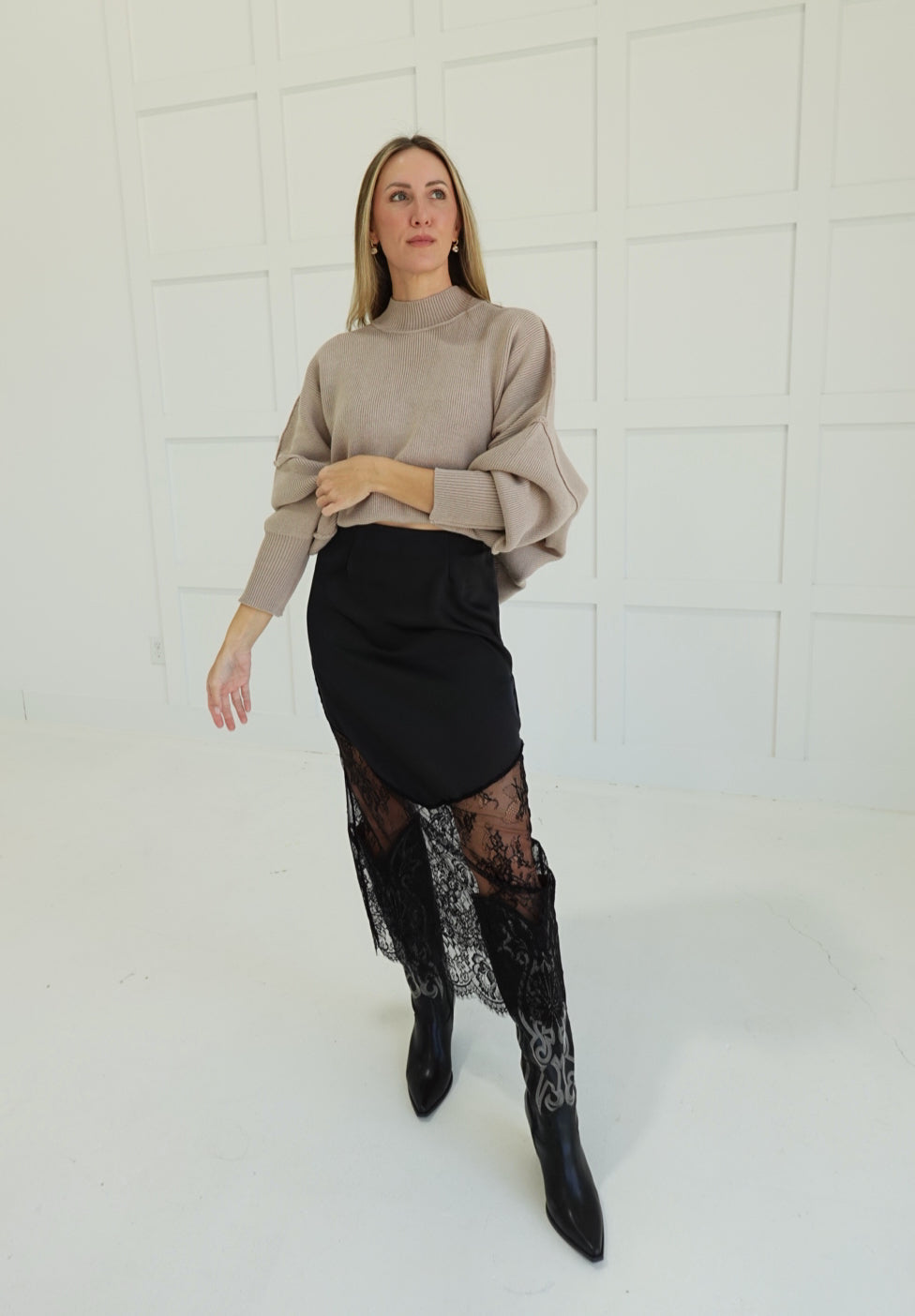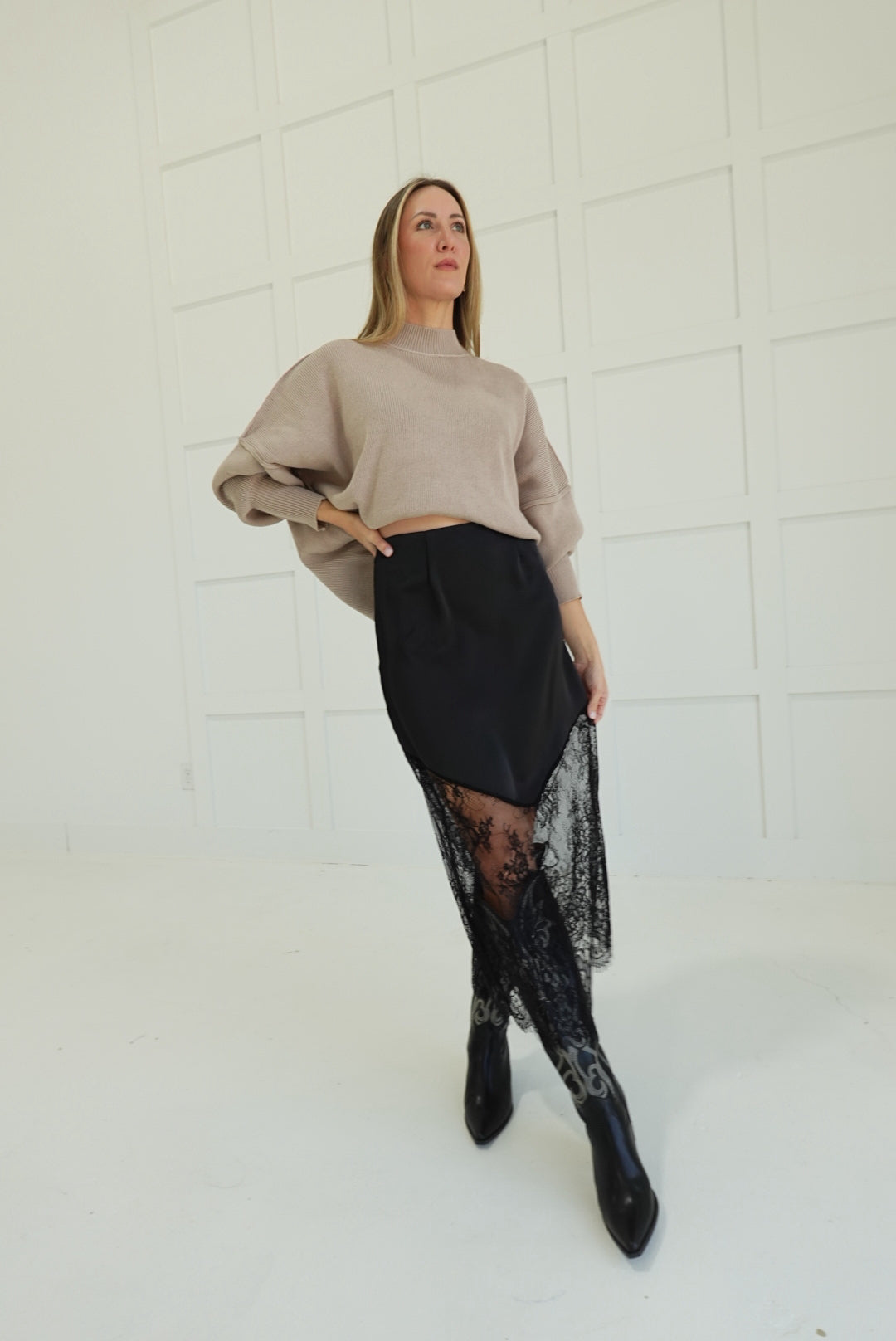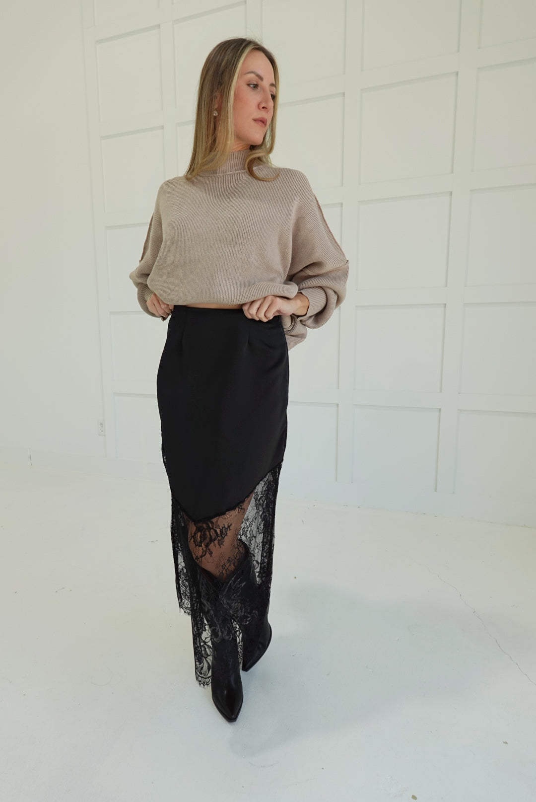 Slip into pure seduction with this satin lace trim midi skirt—a bold statement piece that commands attention. Luxurious satin drapes with precision while delicate lace detailing adds an irresistible edge of sophistication. The midi length strikes the perfect balance between allure and elegance, making it versatile enough for a night out or a confident everyday moment. Pair it with heels and attitude for an unforgettable look.