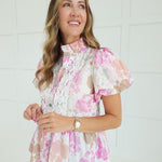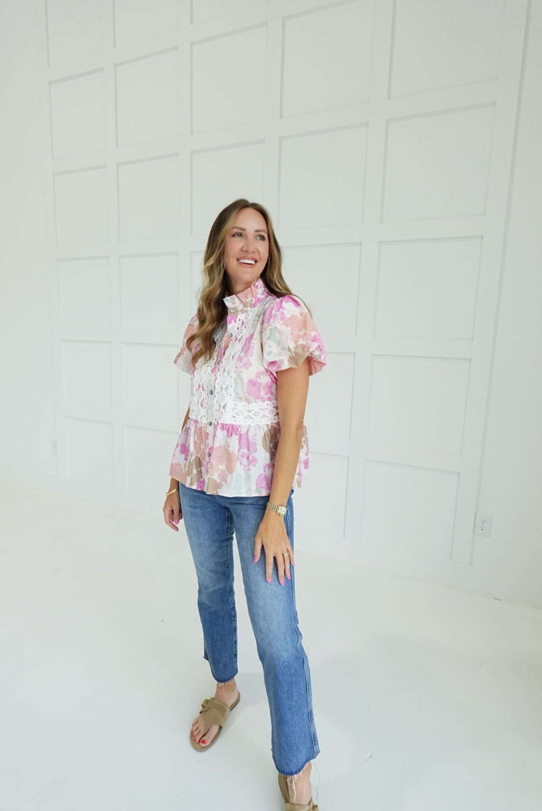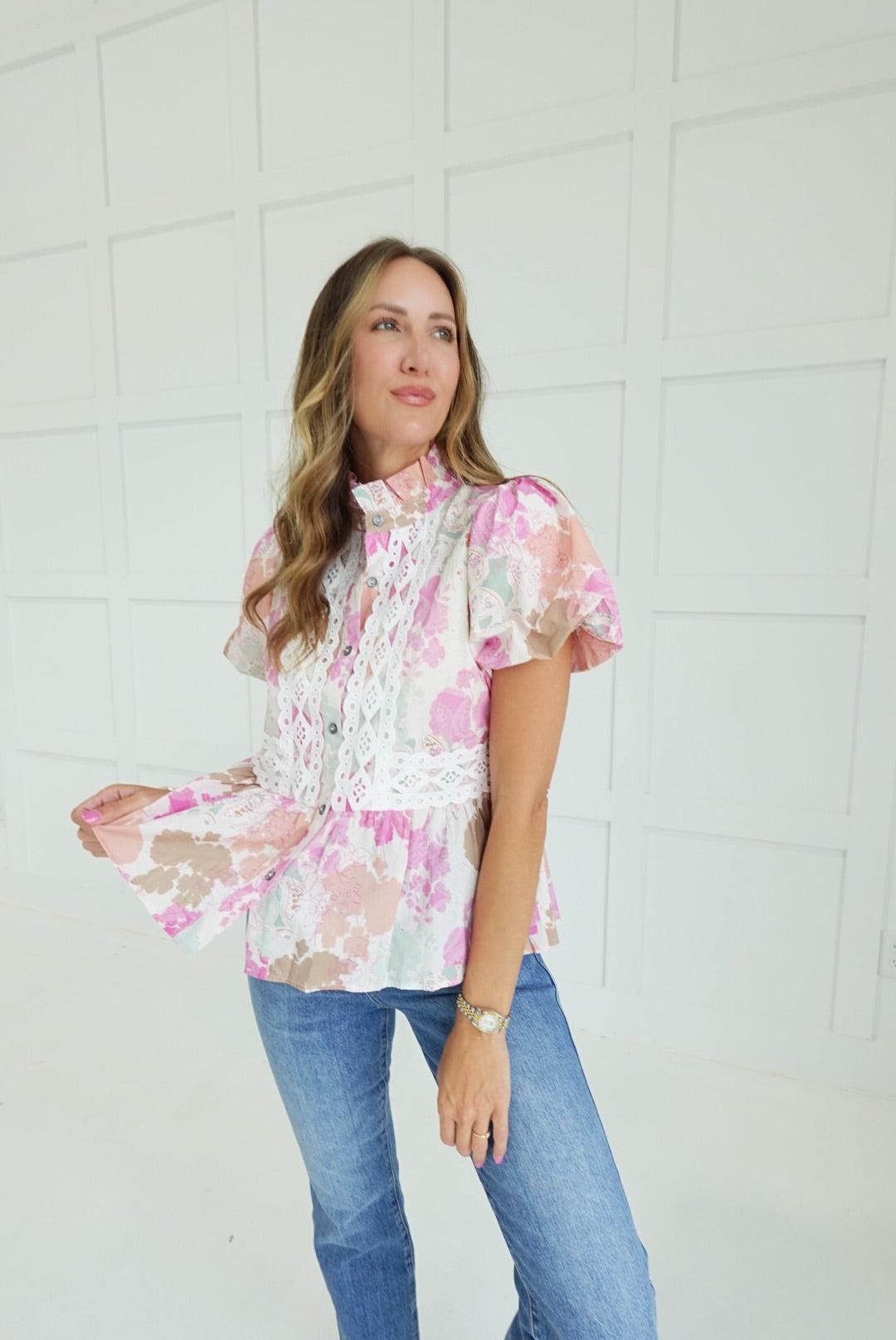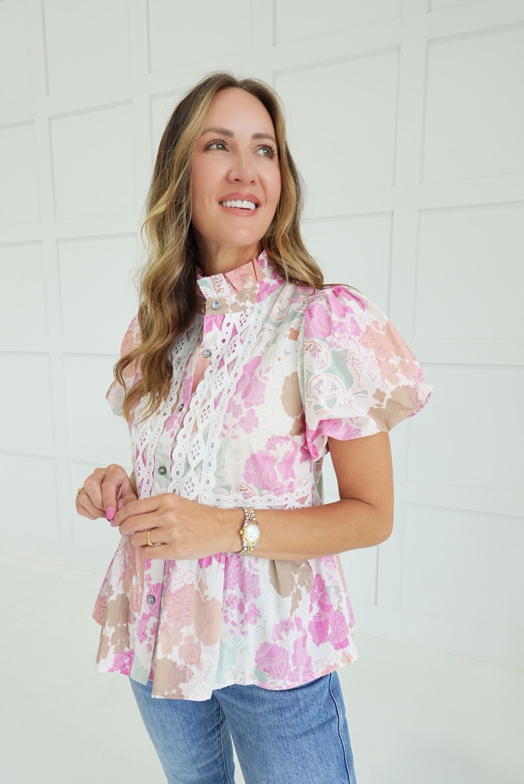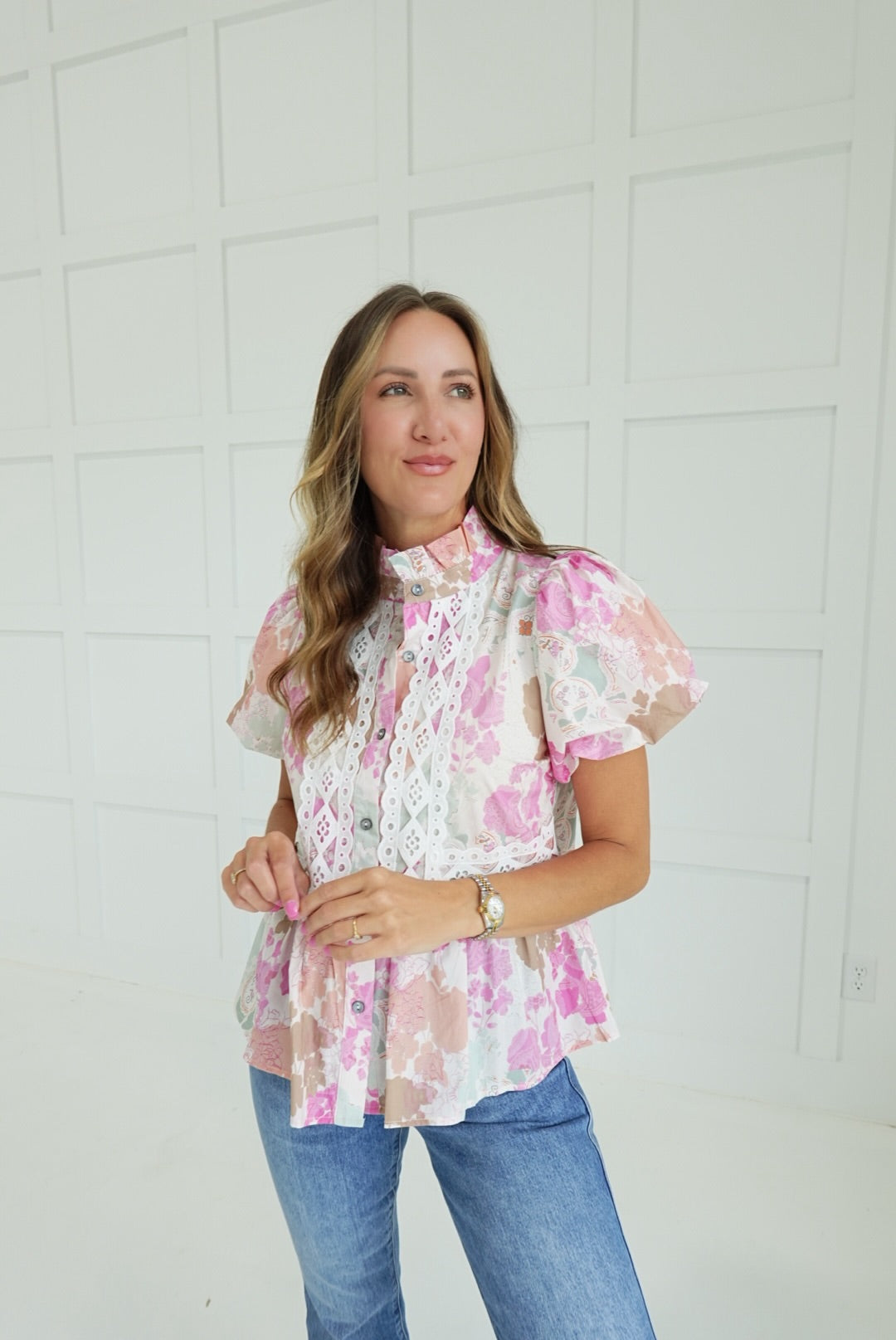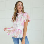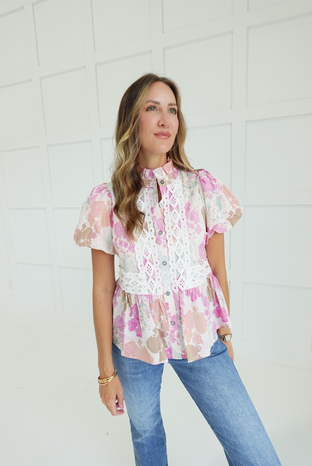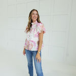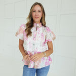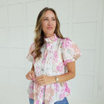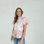 The Lucky Lady Top combines a charming floral print with delicate bubble sleeves and a ruffle hem for a feminine touch. Its high ruffle band collar and button-front closure add elegant detail, while the contrast diamond pattern trim offers a unique accent. Crafted from lightweight woven fabric, this unlined, non-sheer top ensures comfortable wear throughout the day. Perfect for adding a graceful, stylish layer to your wardrobe.