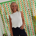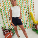 The Lyric Scalloped Hem Top elevates your game day attire with its sophisticated design. This sleeveless white top features an eye-catching navy blue scalloped hem that adds a touch of elegance to your spirit wear. Made from lightweight knit fabric, it offers both comfort and breathability while maintaining a polished, classy appearance that transitions seamlessly from stadium to social gatherings.
