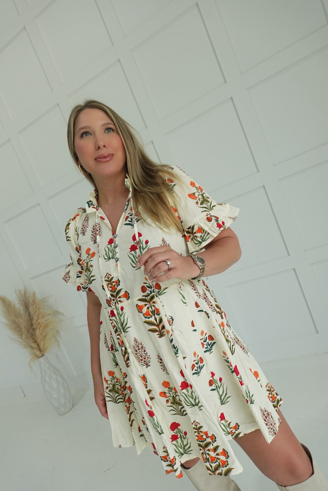 - Floral Mini Flare Dress With Ruffle Finishes