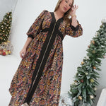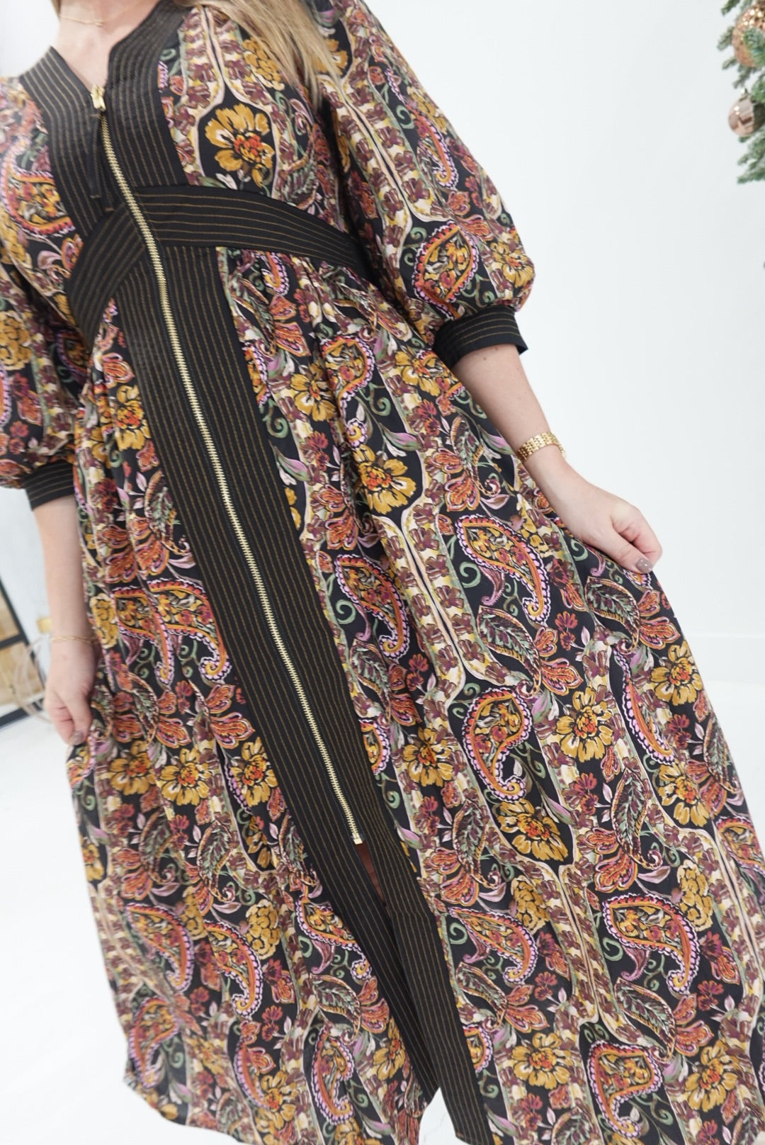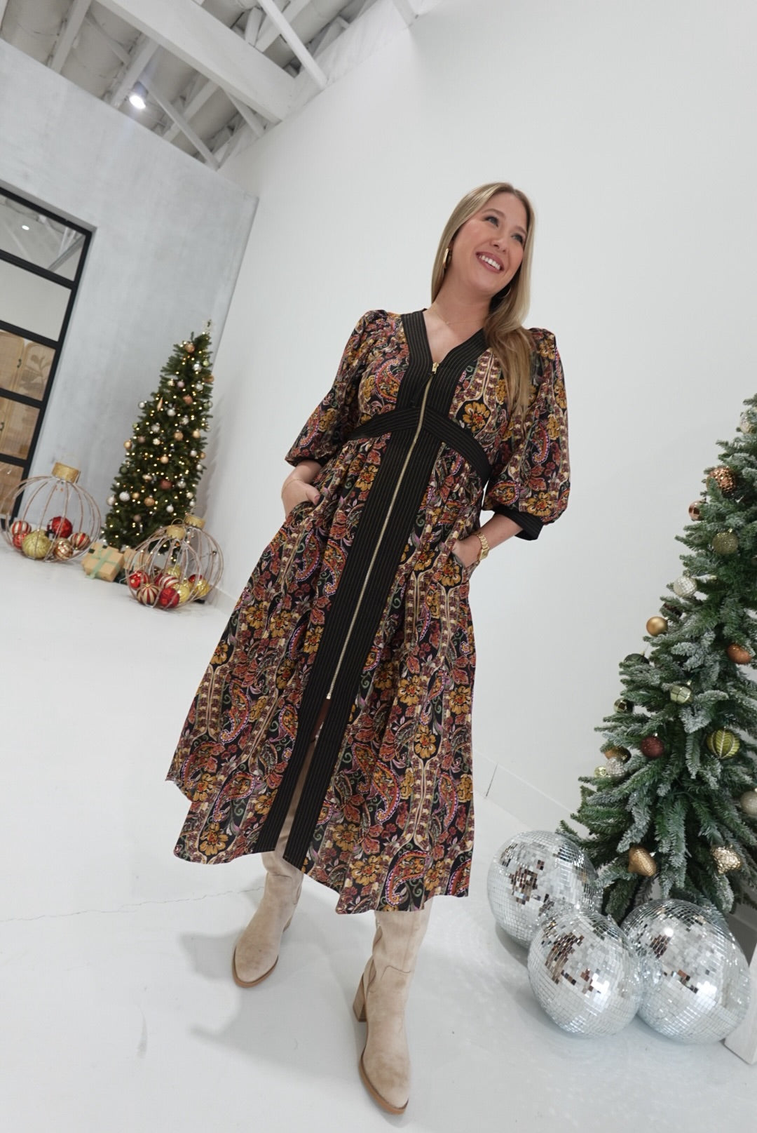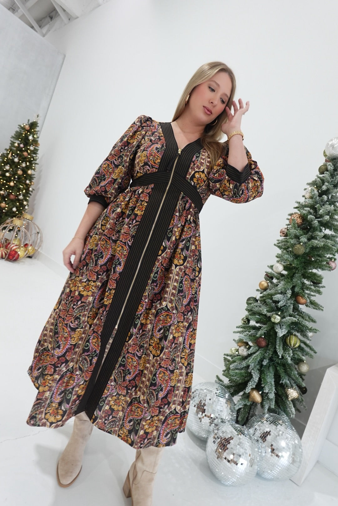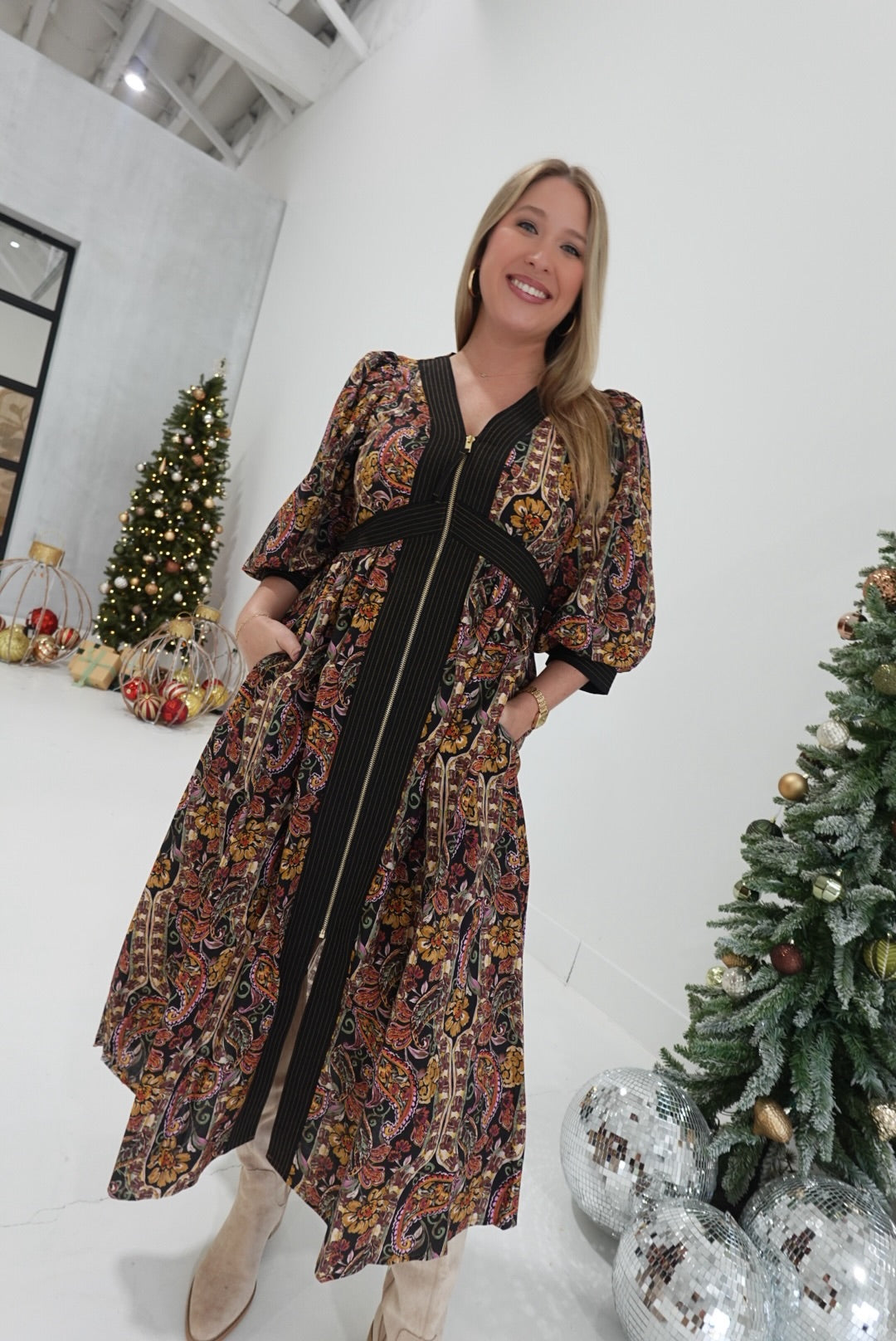 The Margaret Midi Dress combines elegance with comfort, featuring a charming paisley print and stylish puff sleeves. Its striped trim and partial front zipper add subtle detail, while side pockets offer practical convenience. Fully lined and woven from lightweight fabric, this non-sheer dress ensures comfort and confidence throughout your day. Ideal for any occasion, it’s a versatile addition to your wardrobe that supports both style and ease.