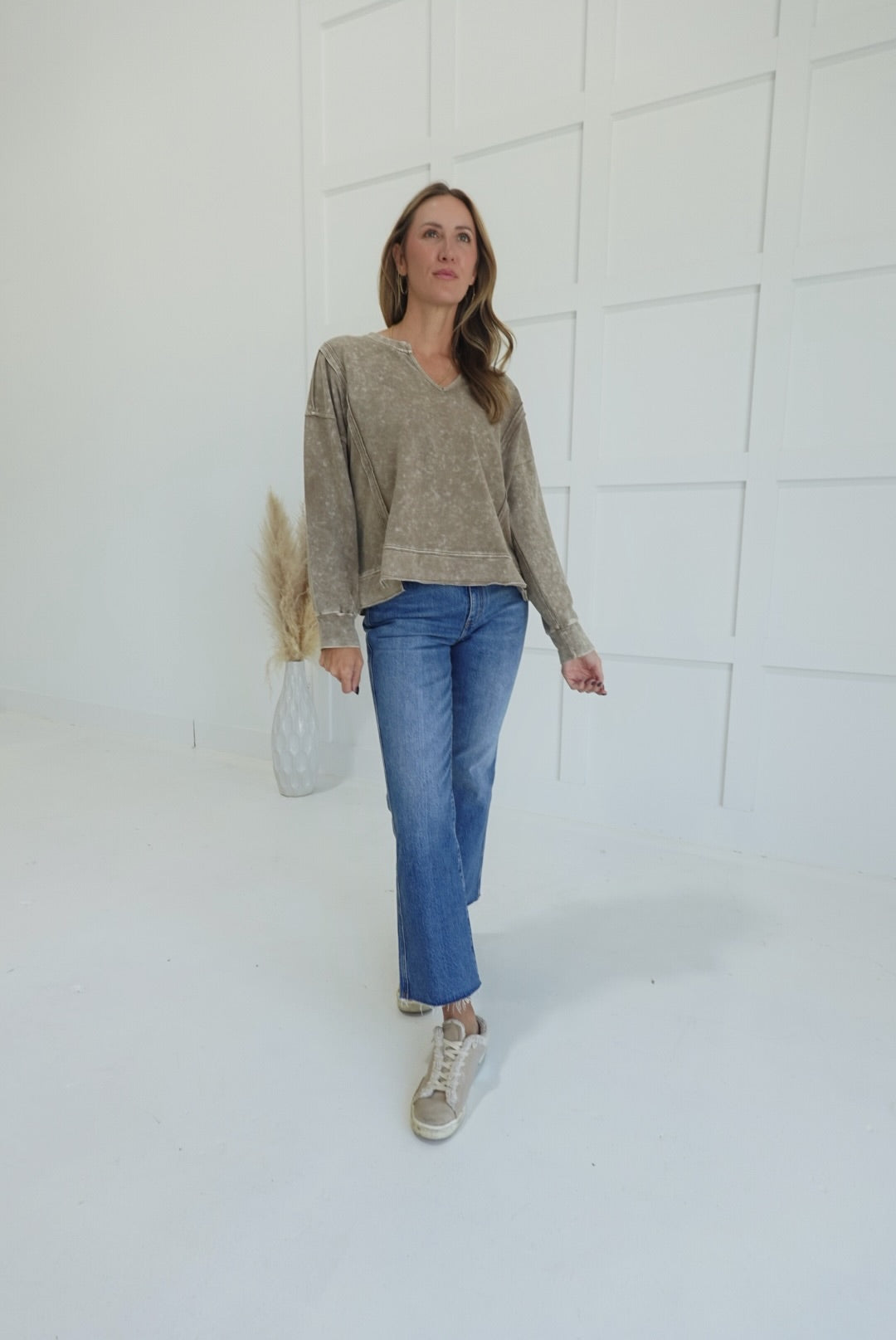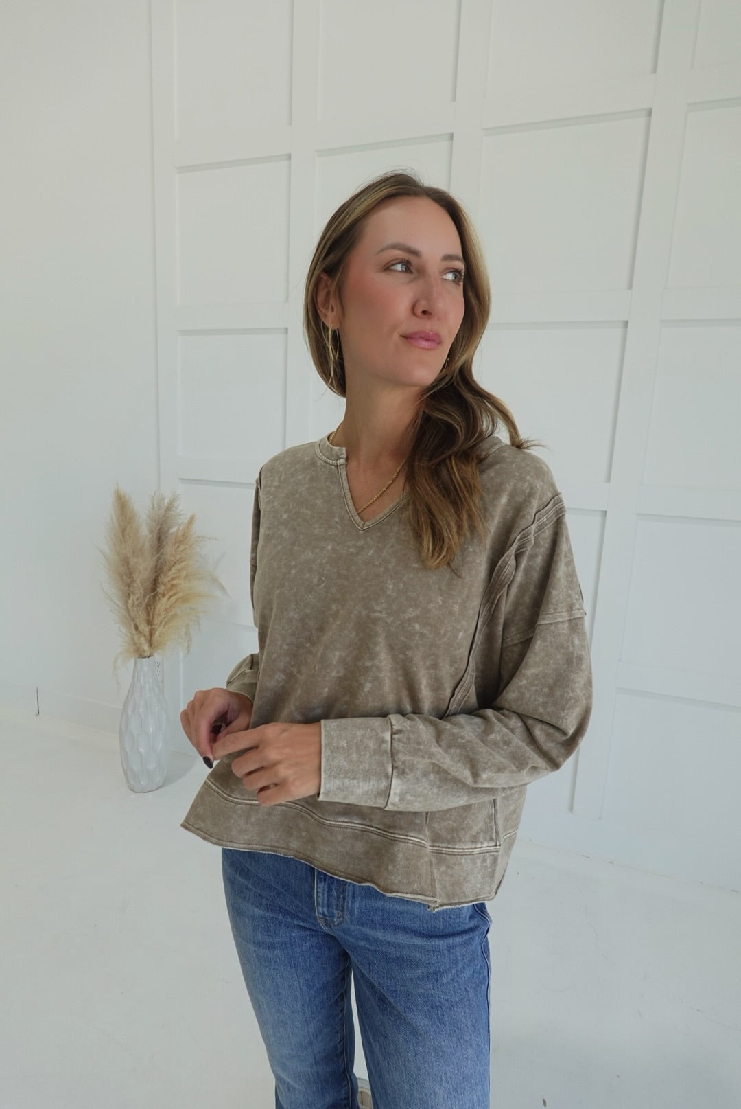 The Micah Exposed Seam Top in tan offers a comfortable long sleeve fit made from a soft knit fabric. Its washed finish enhances softness, while the exposed seams add subtle, stylish detail. Designed for everyday wear, this top provides both comfort and a unique touch that complements any casual wardrobe.