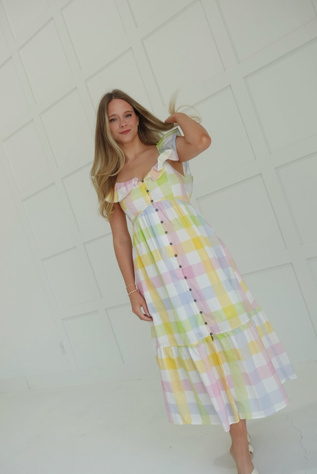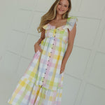 Dare to captivate in the Mira Midi Dress – a rebellious twist on feminine style with its eye-catching plaid pattern. The provocative ruffle neckline frames your décolletage while the button-down front invites playful possibilities. Its smocked back hugs your curves unapologetically, and hidden functional pockets hold your secrets. Lightweight and fully lined, this woven stunner demands attention at summer gatherings and vacation escapes where ordinary simply won't do.
