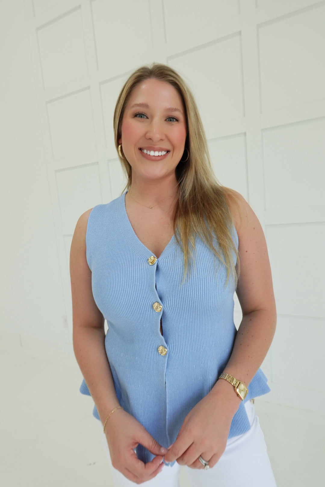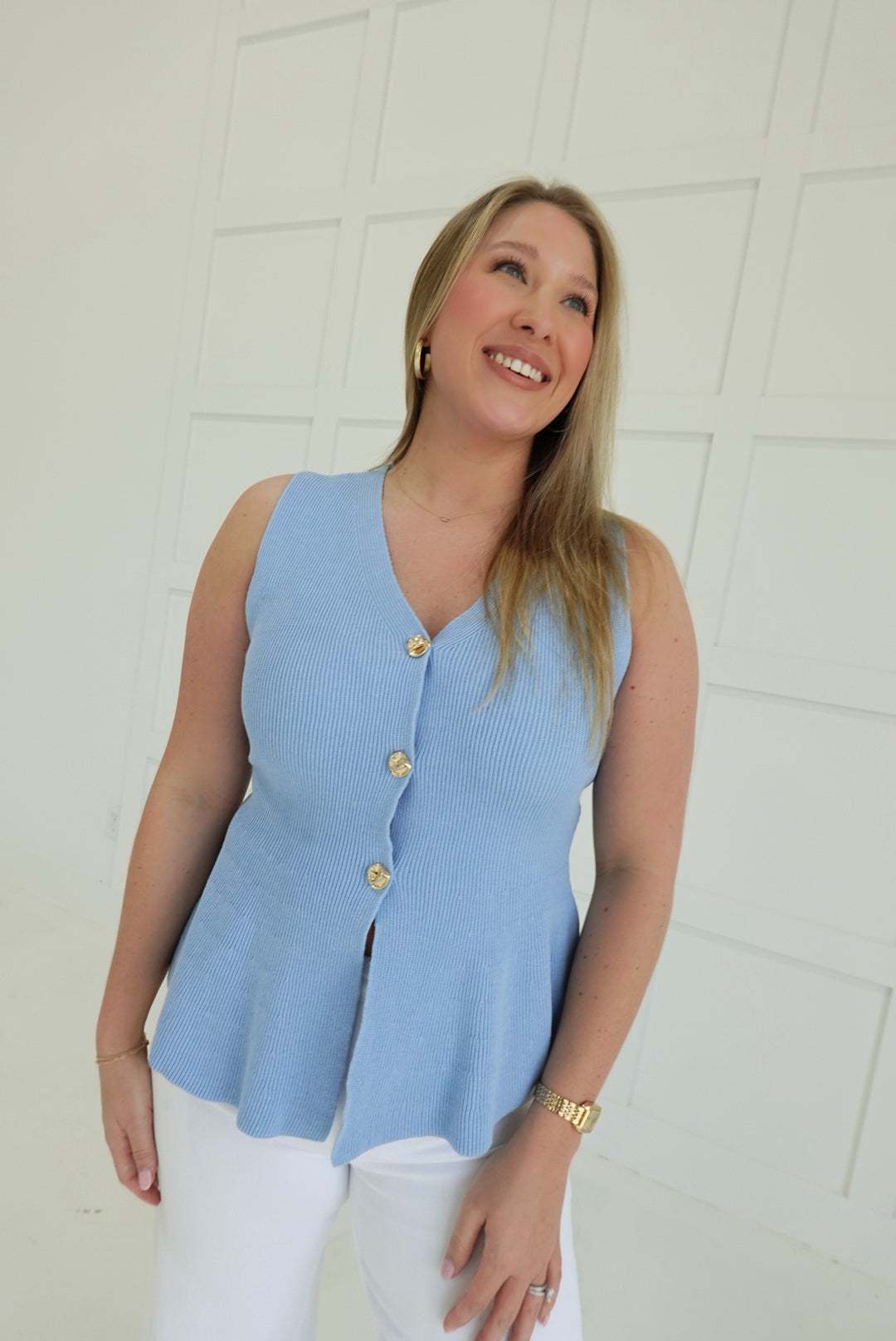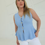 Dare to stand out in this striking v-neck sleeveless peplum sweater. The sculpted peplum waist creates instant dimension and movement, while the clean neckline and sleek silhouette deliver modern edge. Layer it over a crisp white shirt for boardroom confidence, or wear solo for an evening that demands attention. Versatile enough for day, bold enough for night—this is the piece that transforms your entire look.