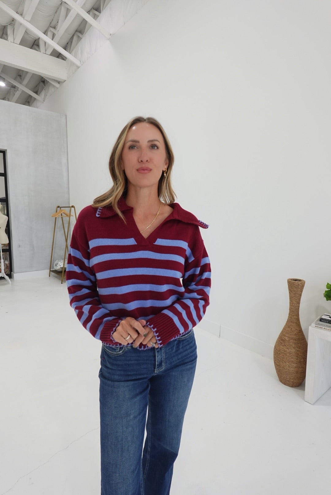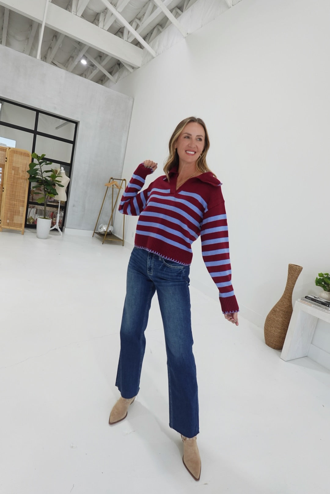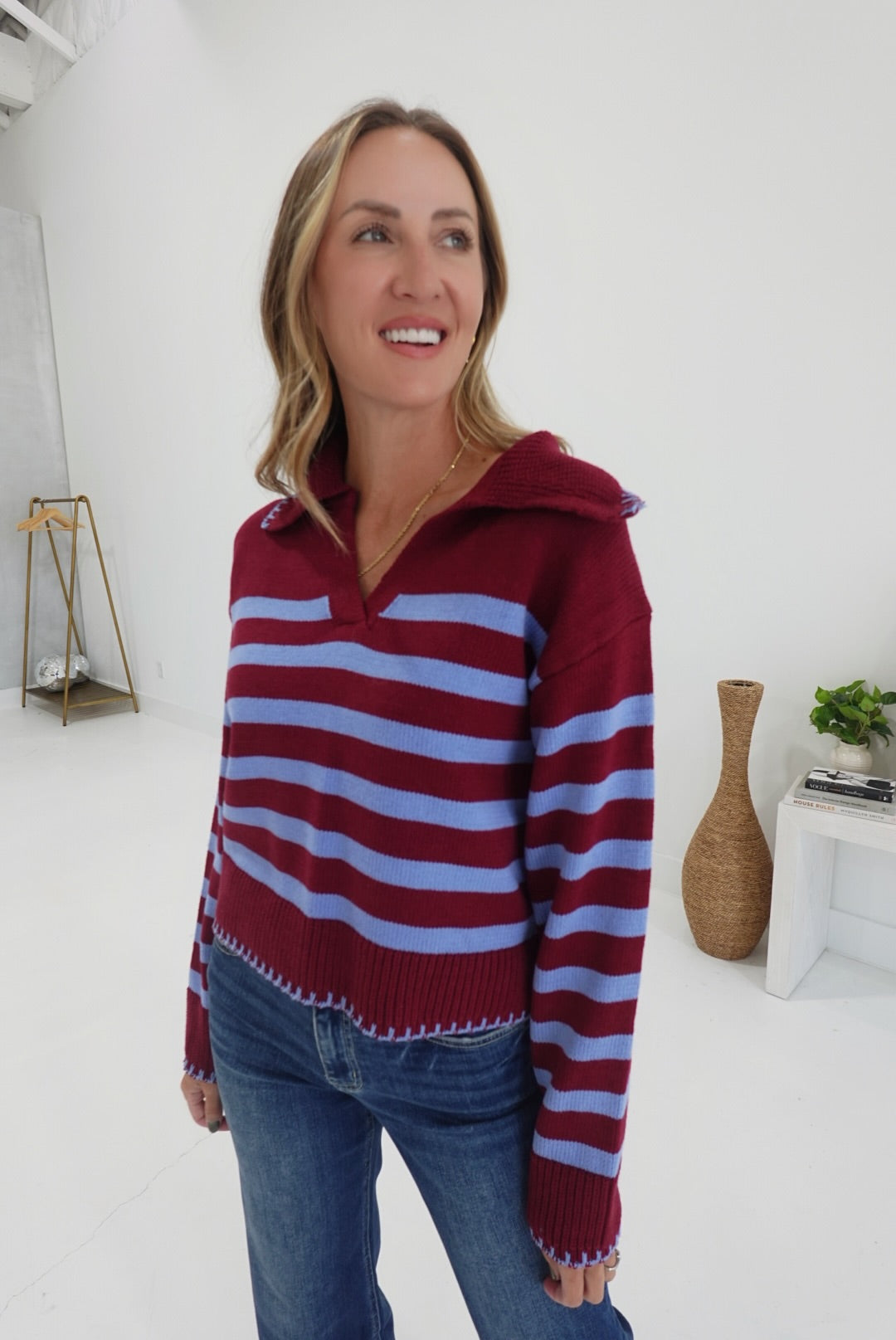 Stay cozy and stylish in the Mix It Up Sweater, featuring classic stripes and a charming blanket stitch detail along the collar. This sweater offers a comfortable fit that keeps you warm while adding a touch of timeless texture to your look. Perfect for layering on cooler days, it’s a versatile addition to your wardrobe that supports both casual and polished outfits.