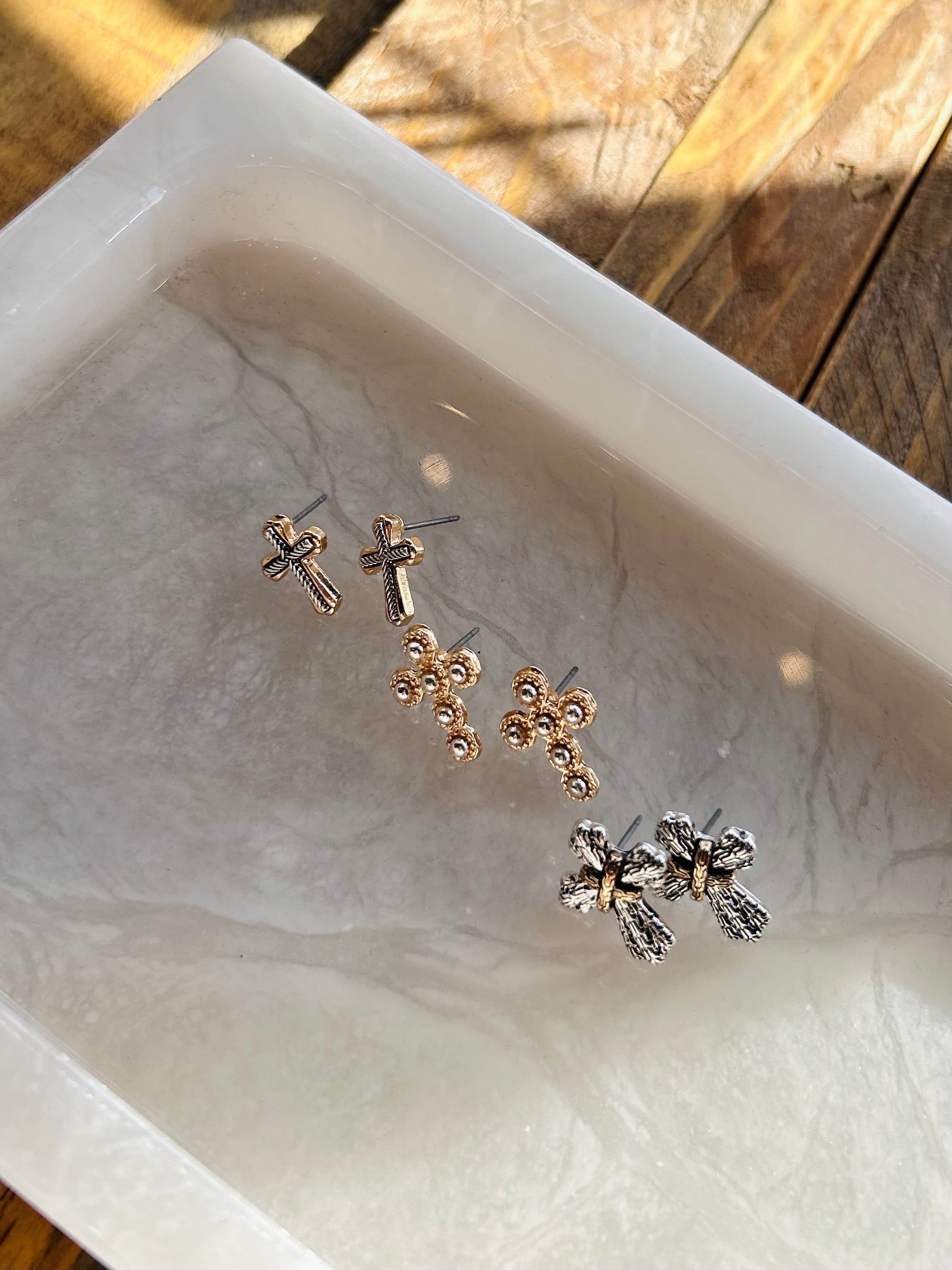 Elevate your everyday look with this versatile mixed cross stud earring set. Featuring multiple cross designs in varying finishes and metals, these studs offer effortless style for any occasion. Perfect for stacking, mixing, and matching to create your own unique combinations. Lightweight and comfortable for all-day wear, this set gives you the flexibility to express your personal aesthetic while maintaining a polished, put-together appearance.
