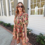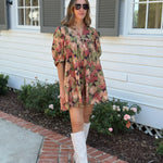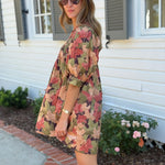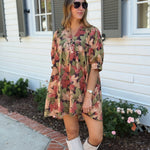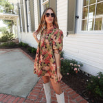 This lightweight woven mini dress features a charming floral pattern and a flattering ¾ sleeve design. The pleated accent neck ruffle adds a delicate touch, while convenient side pockets enhance practicality. Fully lined and non-sheer, it offers comfortable coverage perfect for autumn days.