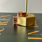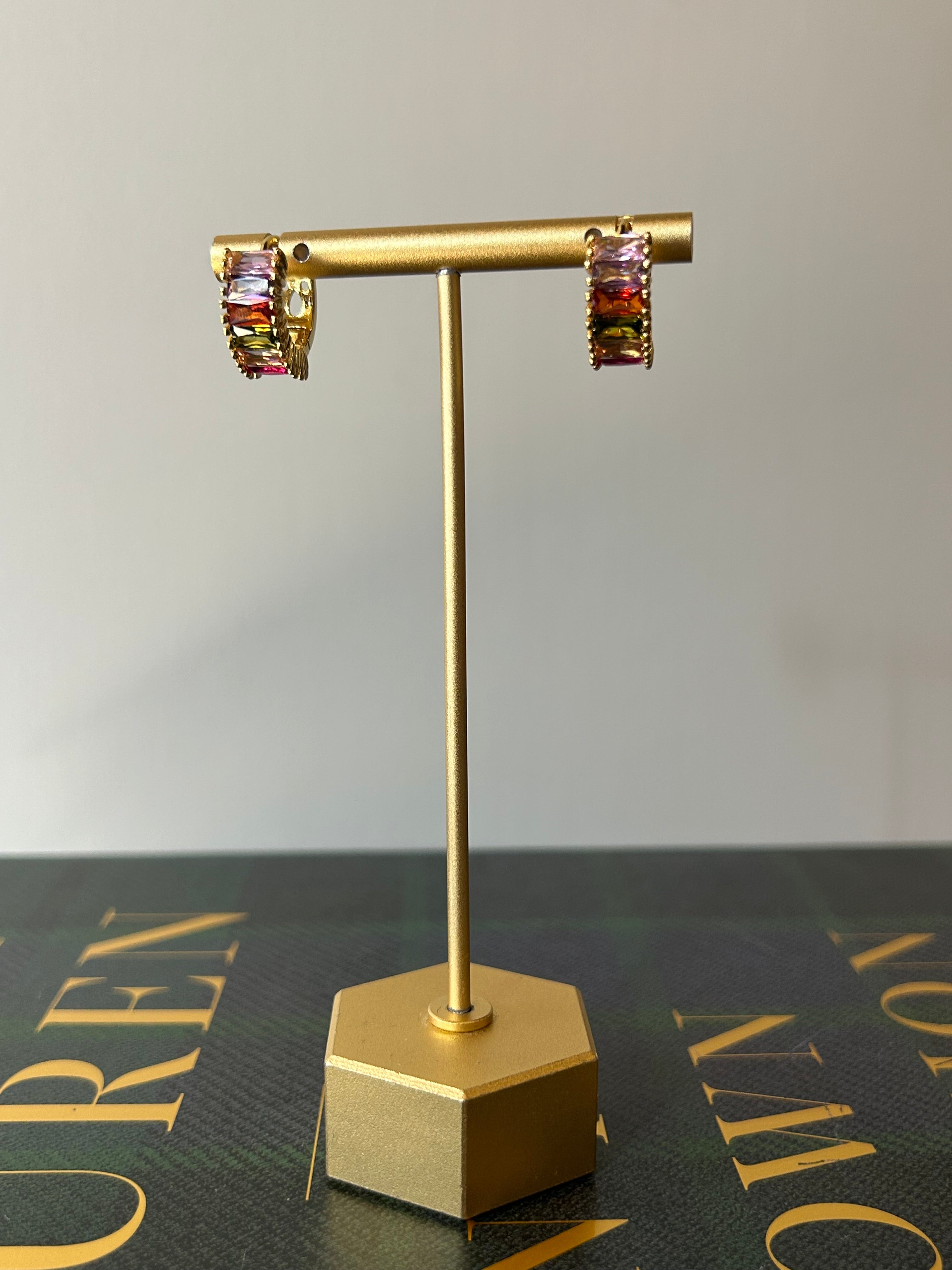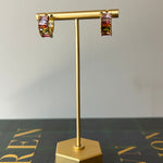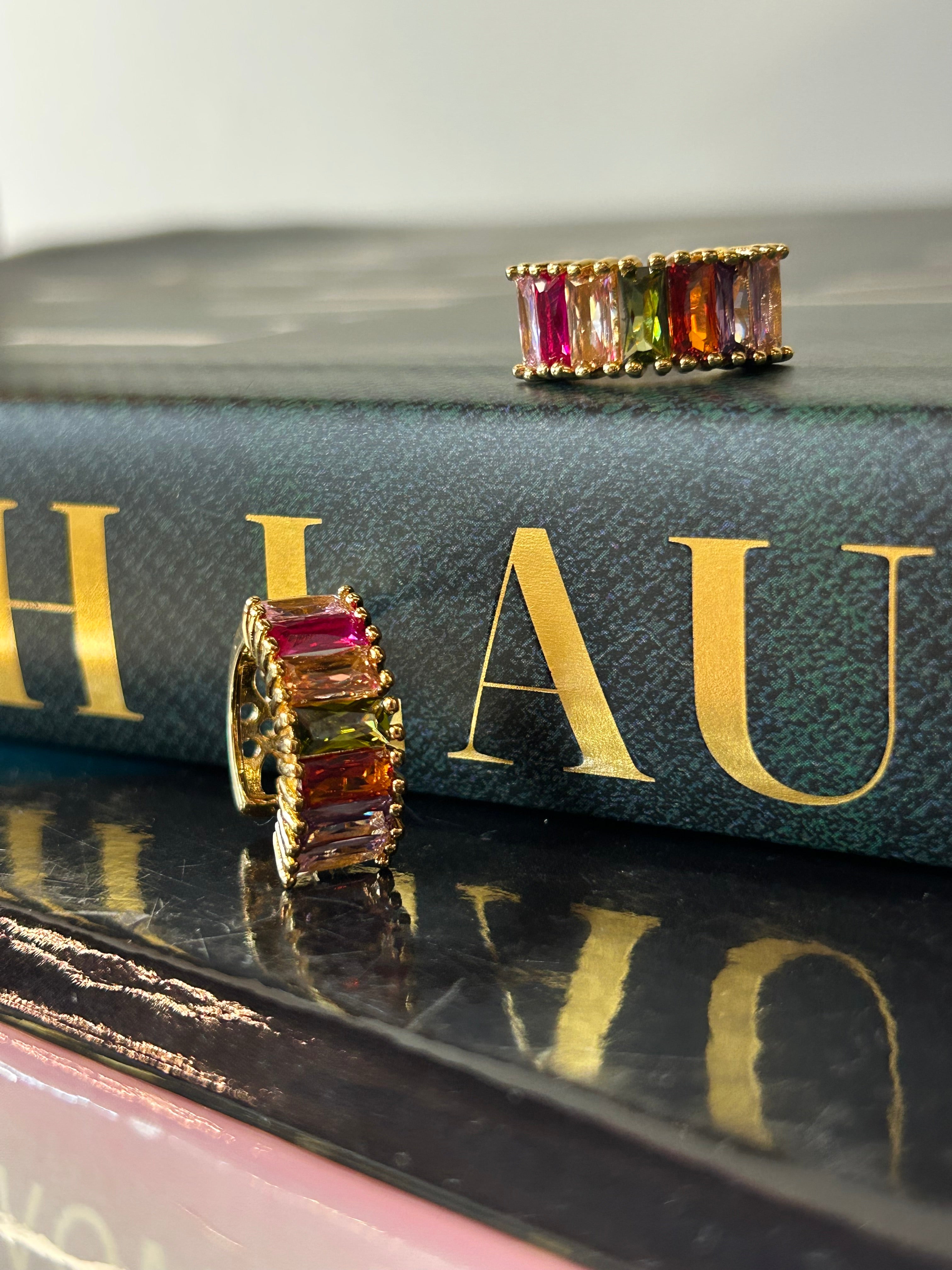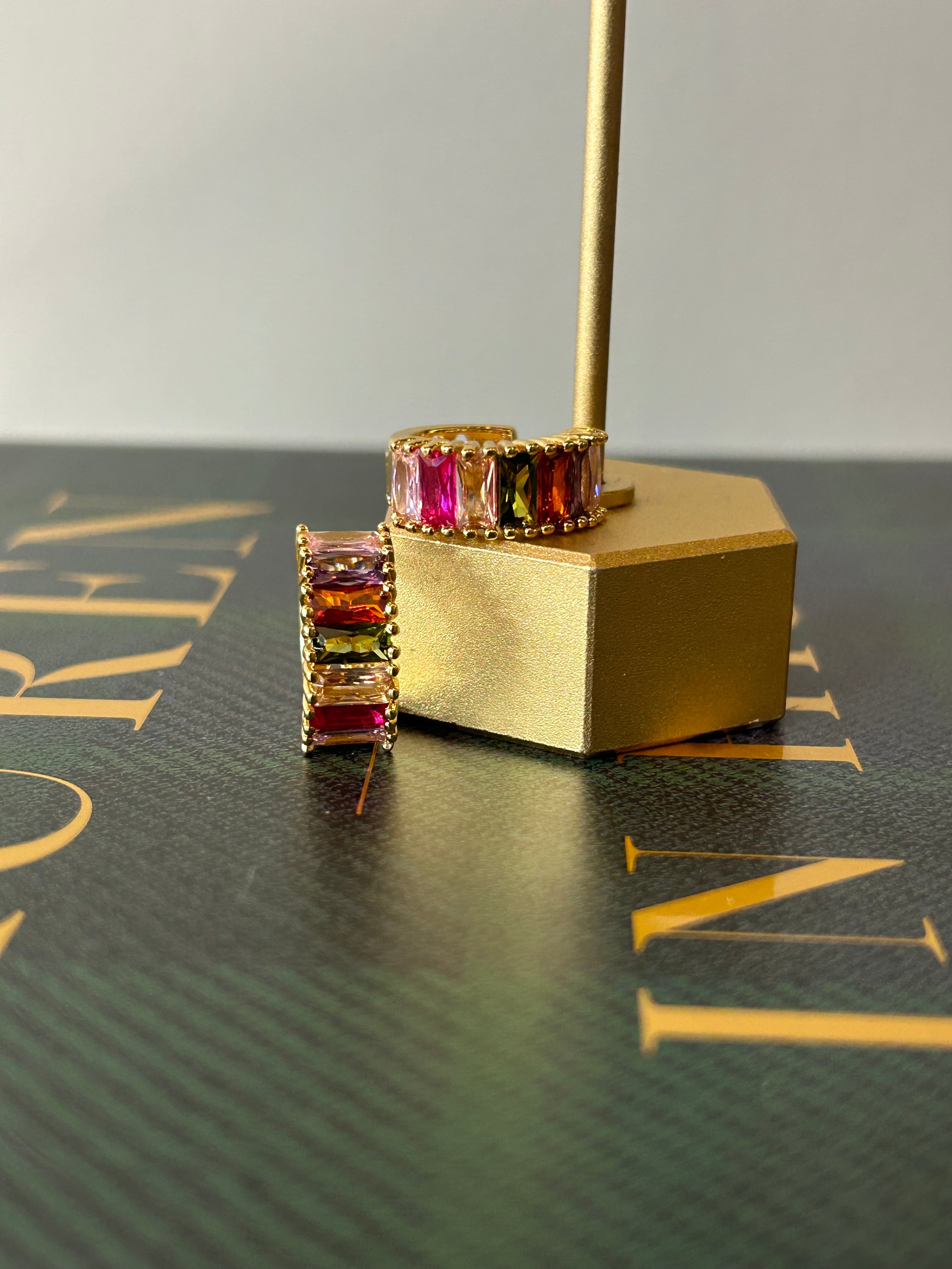 Multicolor Baguette Huggies Add a pop of sparkle to your everyday look with these stunning multicolor baguette huggies. Each pair features precisely cut cubic zirconia stones arranged in a sleek baguette design, delivering brilliant shine that catches the light beautifully. The vibrant mix of colors brings playful energy to any outfit, whether you're dressing up for a special occasion or elevating your casual style. Lightweight and comfortable for all-day wear, these huggies sit perfectly against your ear. A versatile accessory that supports your confidence and personal expression.