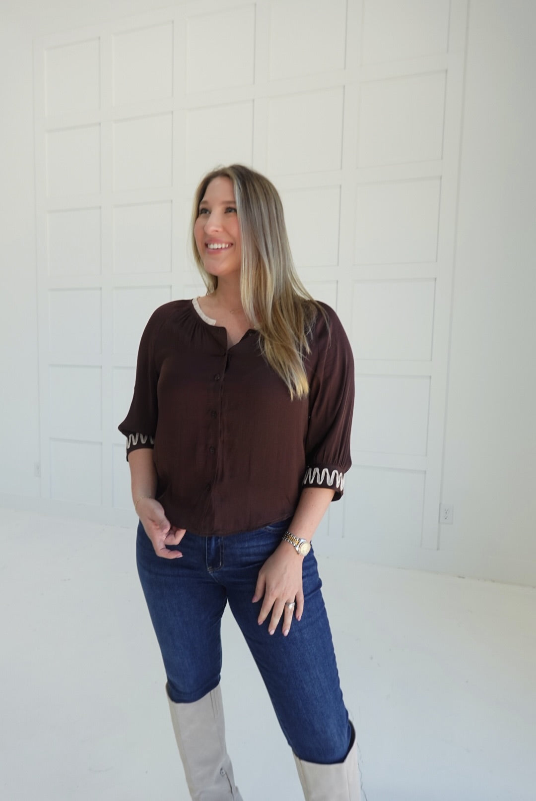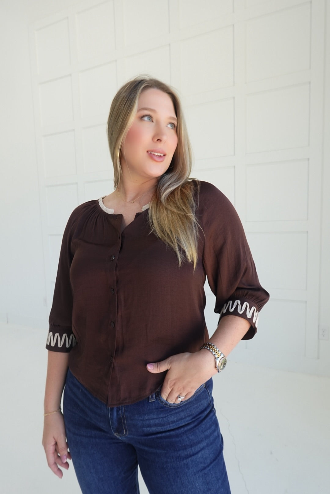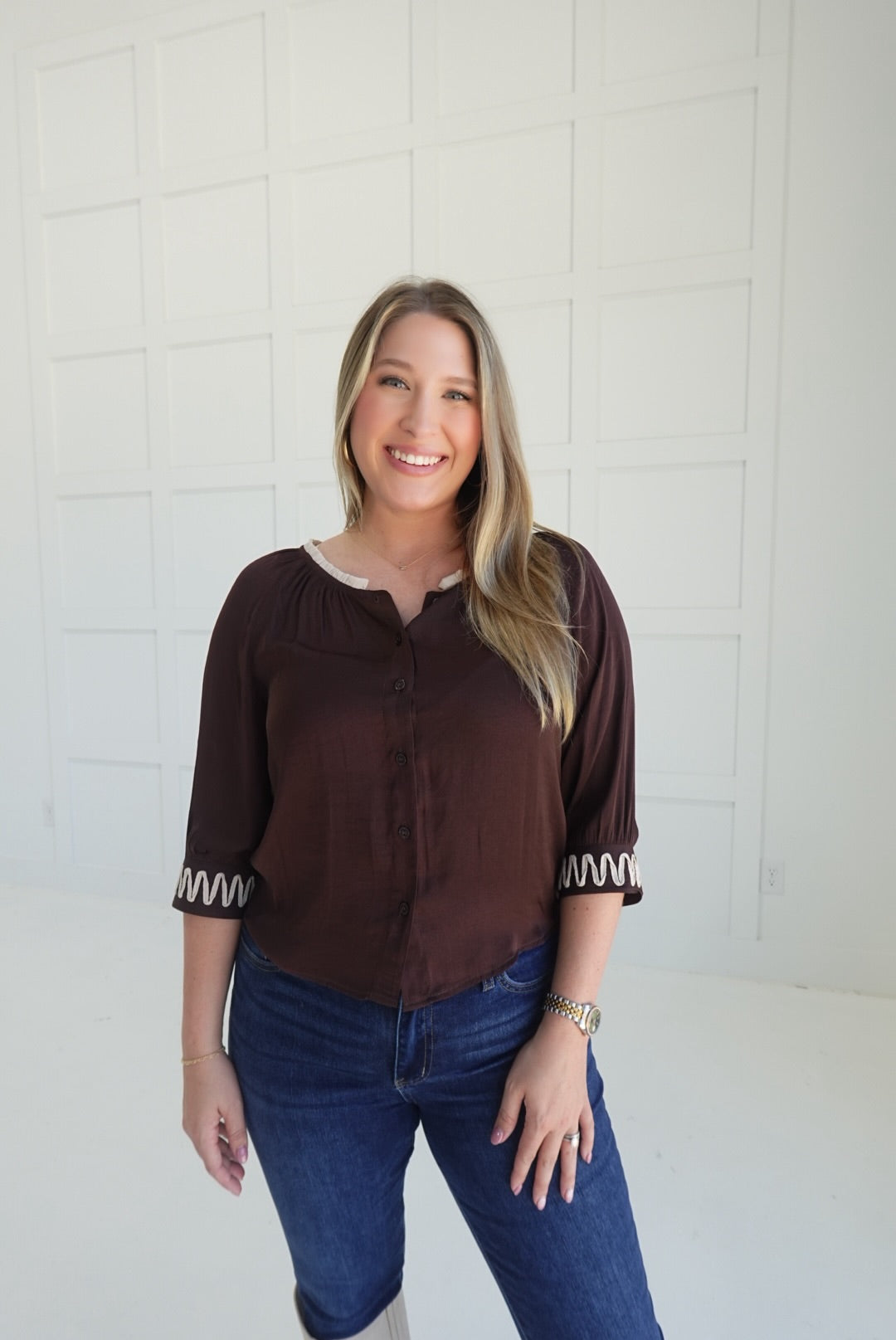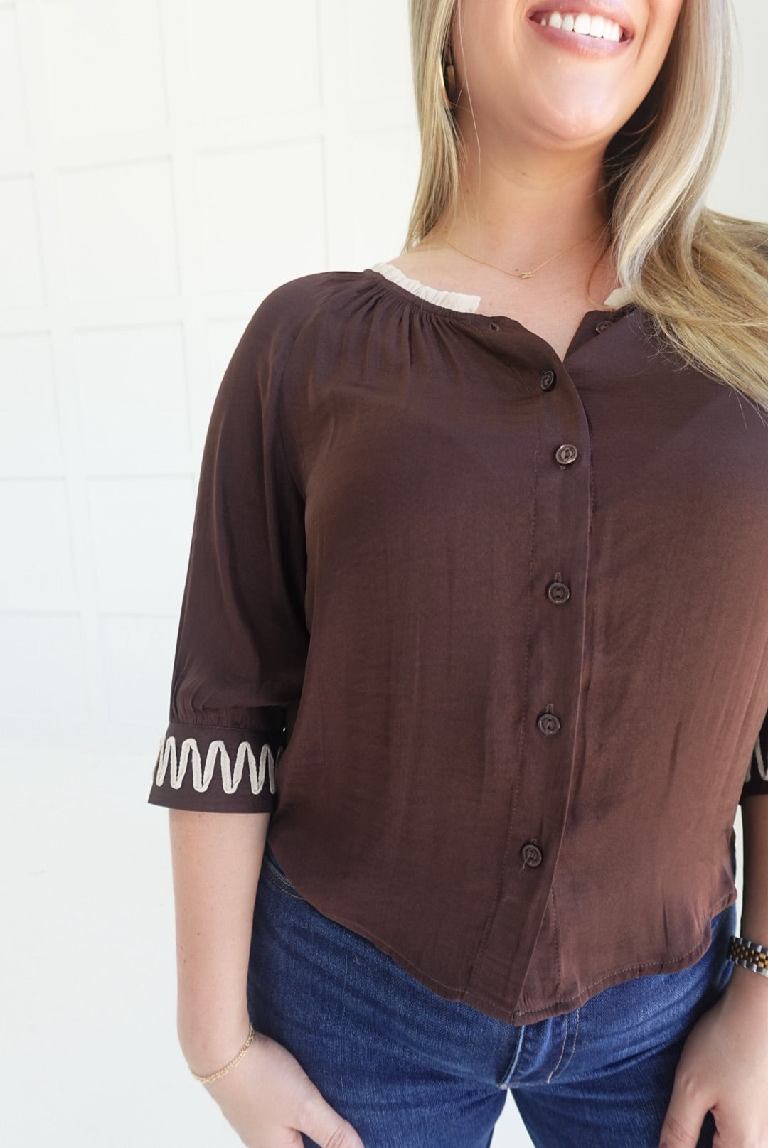 - Button Front Top With Applique Detailing on Sleeve Cuffs
