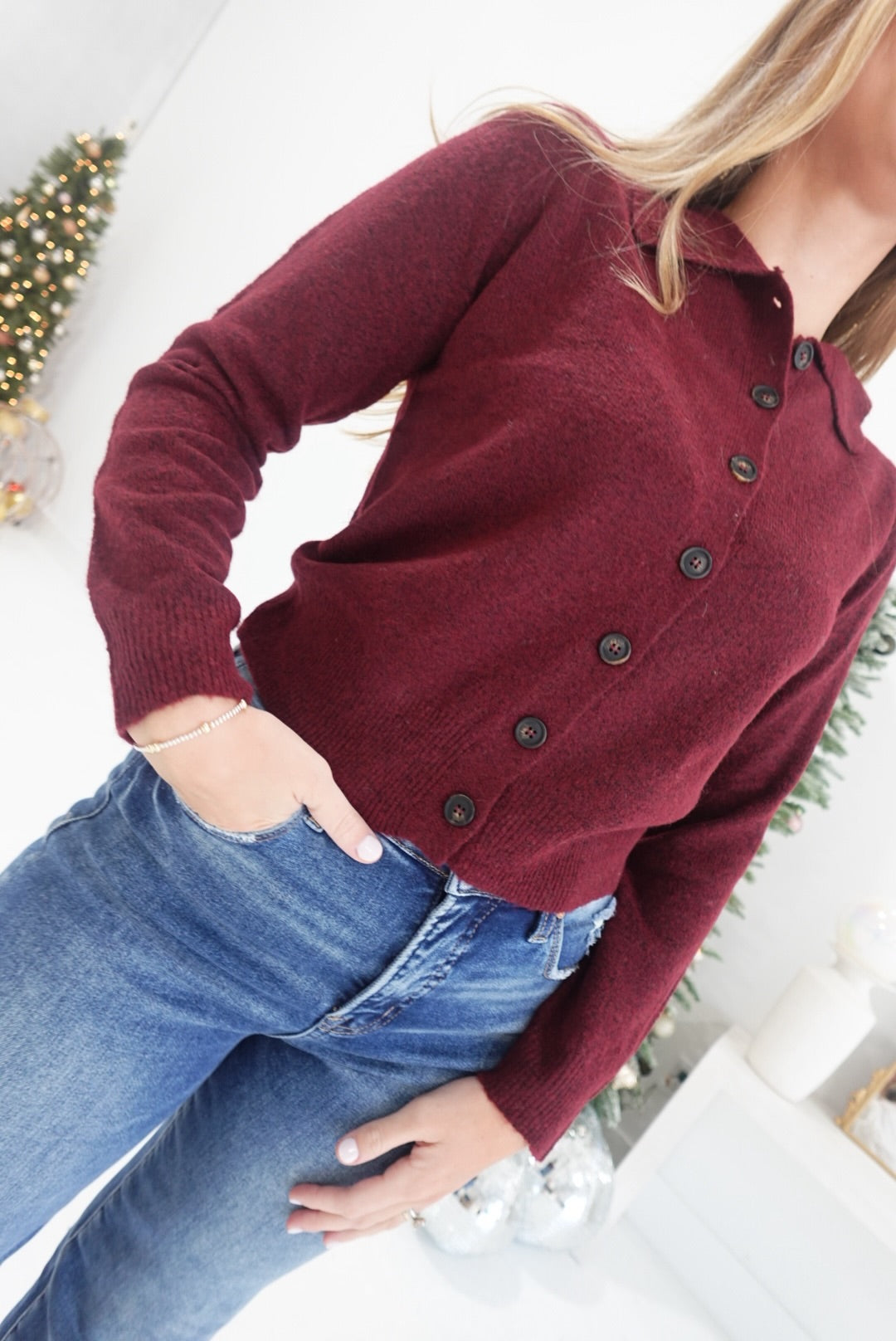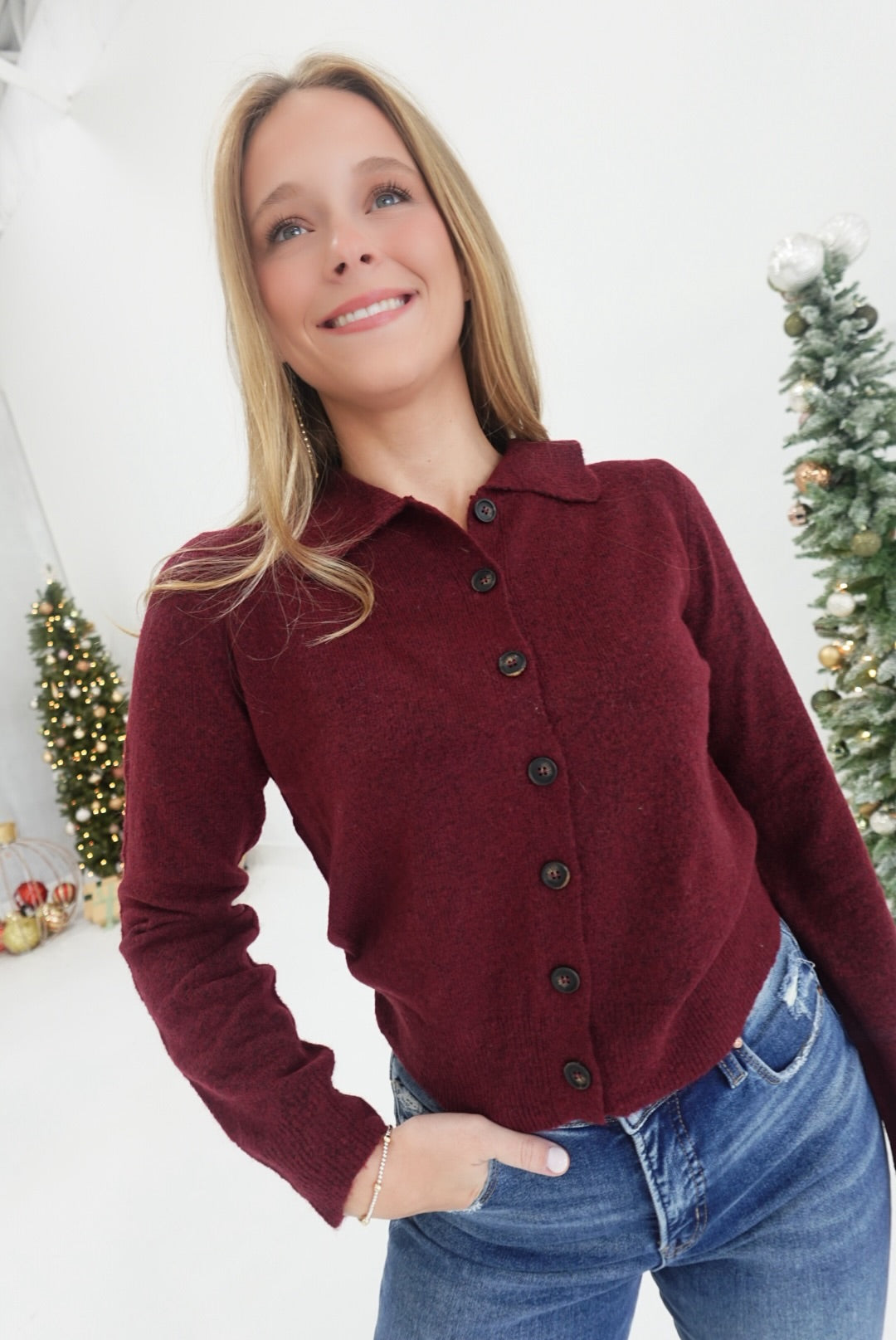 Embrace cozy elegance with the My Favorites Cardigan in Deep Red. This collared, button-down long sleeve knit cardigan offers warmth and comfort without sacrificing style. Its soft fabric and classic design make it perfect for layering on cooler days, providing a flattering fit that complements any outfit. Stay comfortable and polished, no matter where your day takes you.