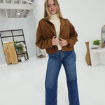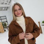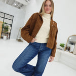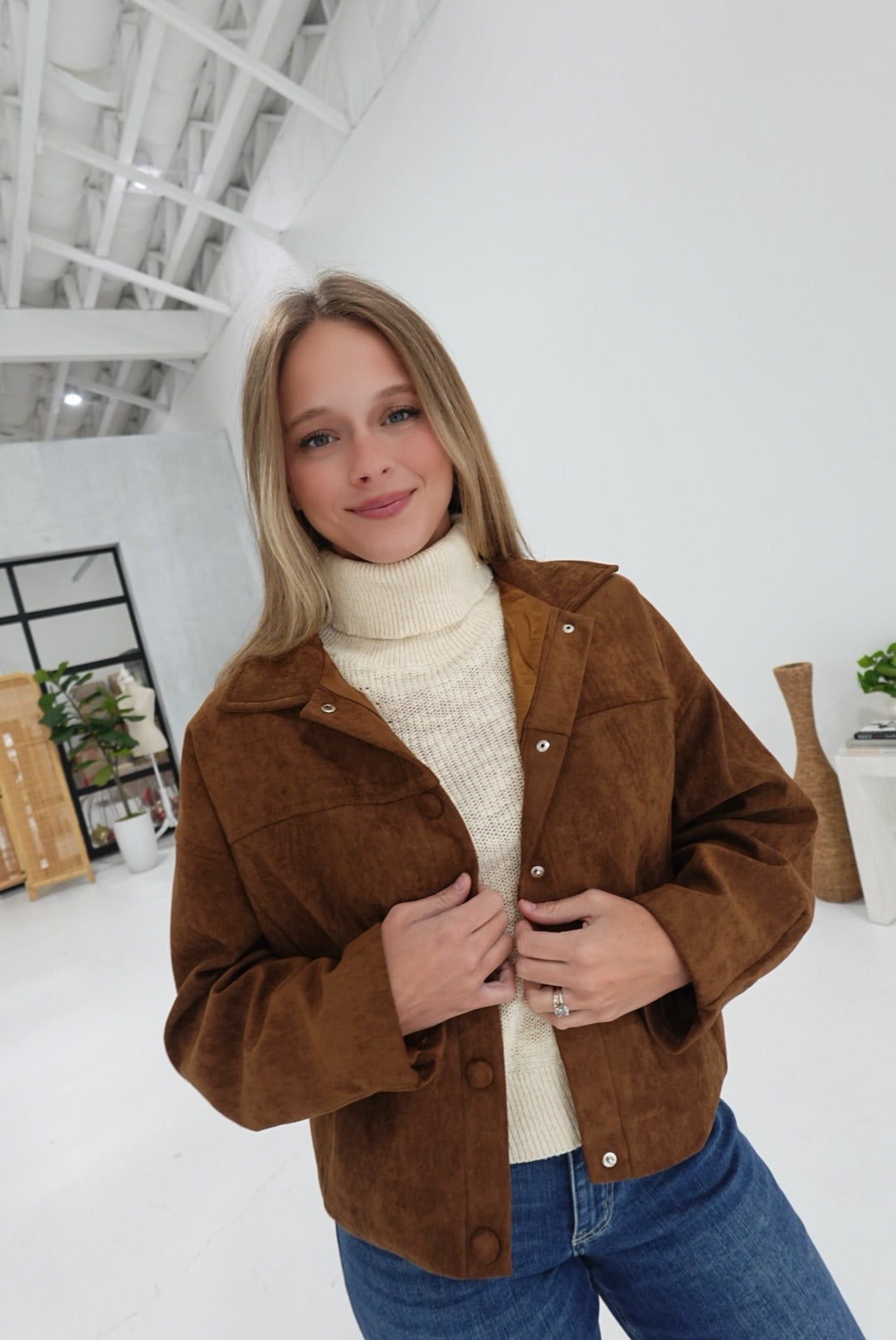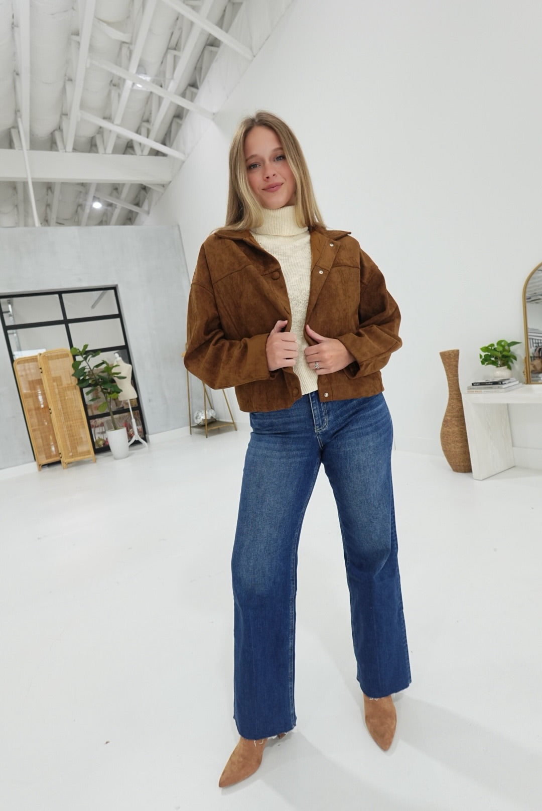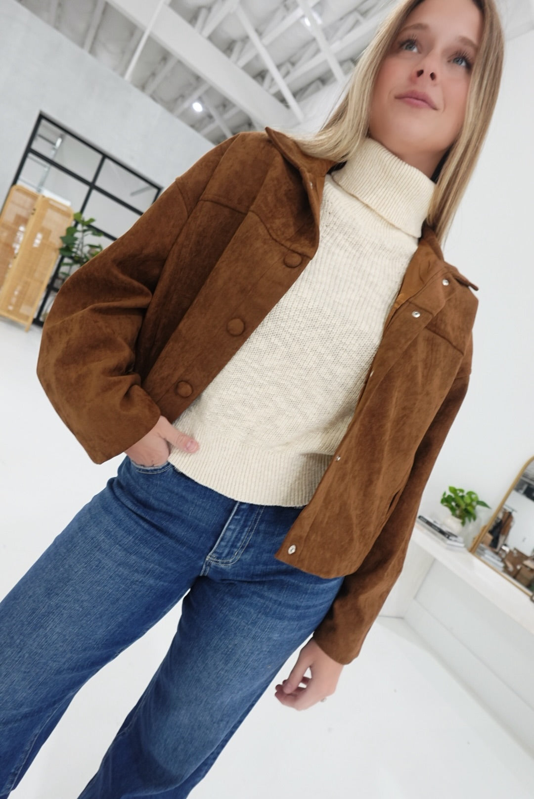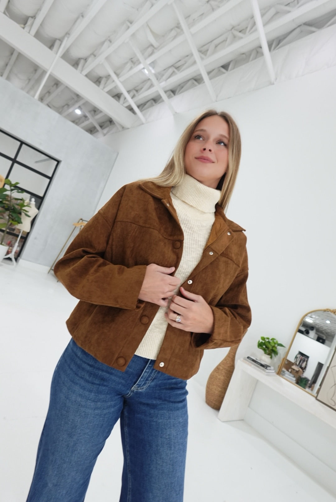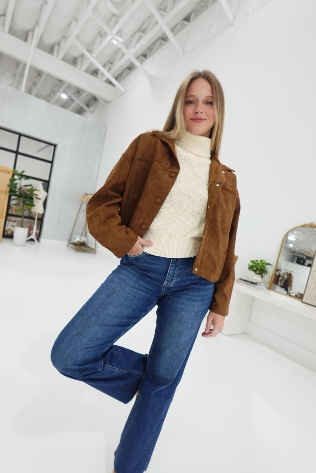 The Mystic Suede Jacket combines style and comfort with its cropped silhouette and soft suede look. Featuring snap buttons for easy wear, this jacket is perfect for layering during cooler days. Its versatile design adds a touch of sophistication to any outfit while providing a cozy, flattering fit you can rely on.
