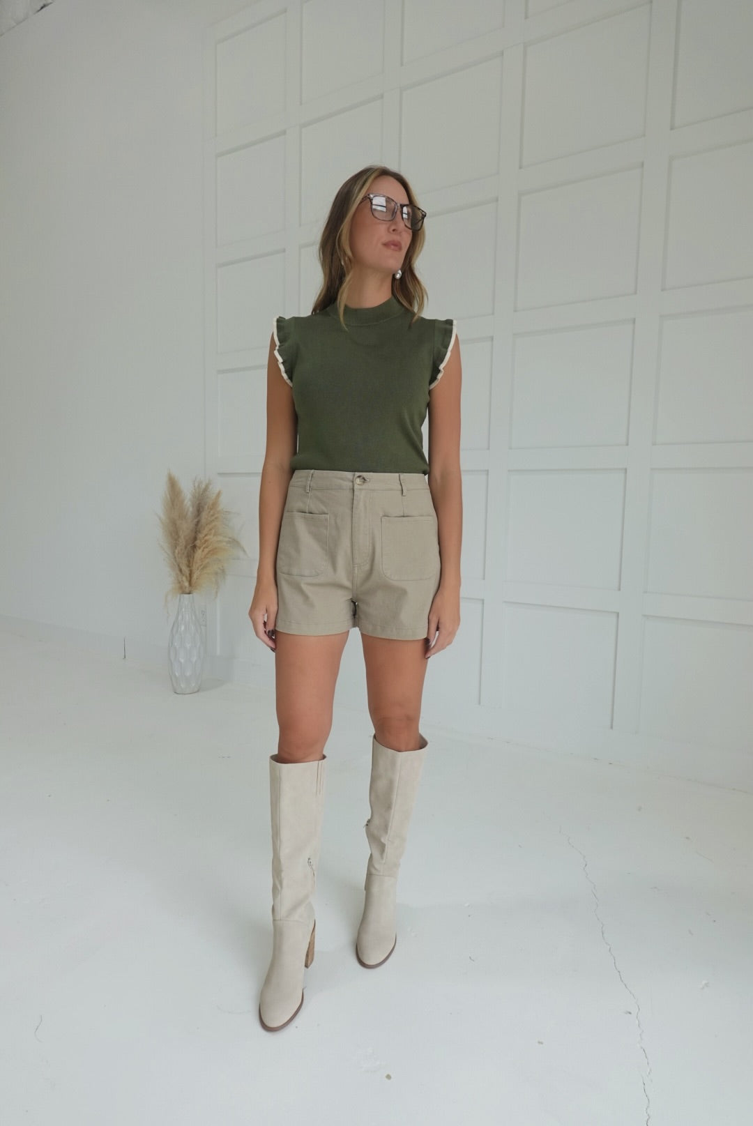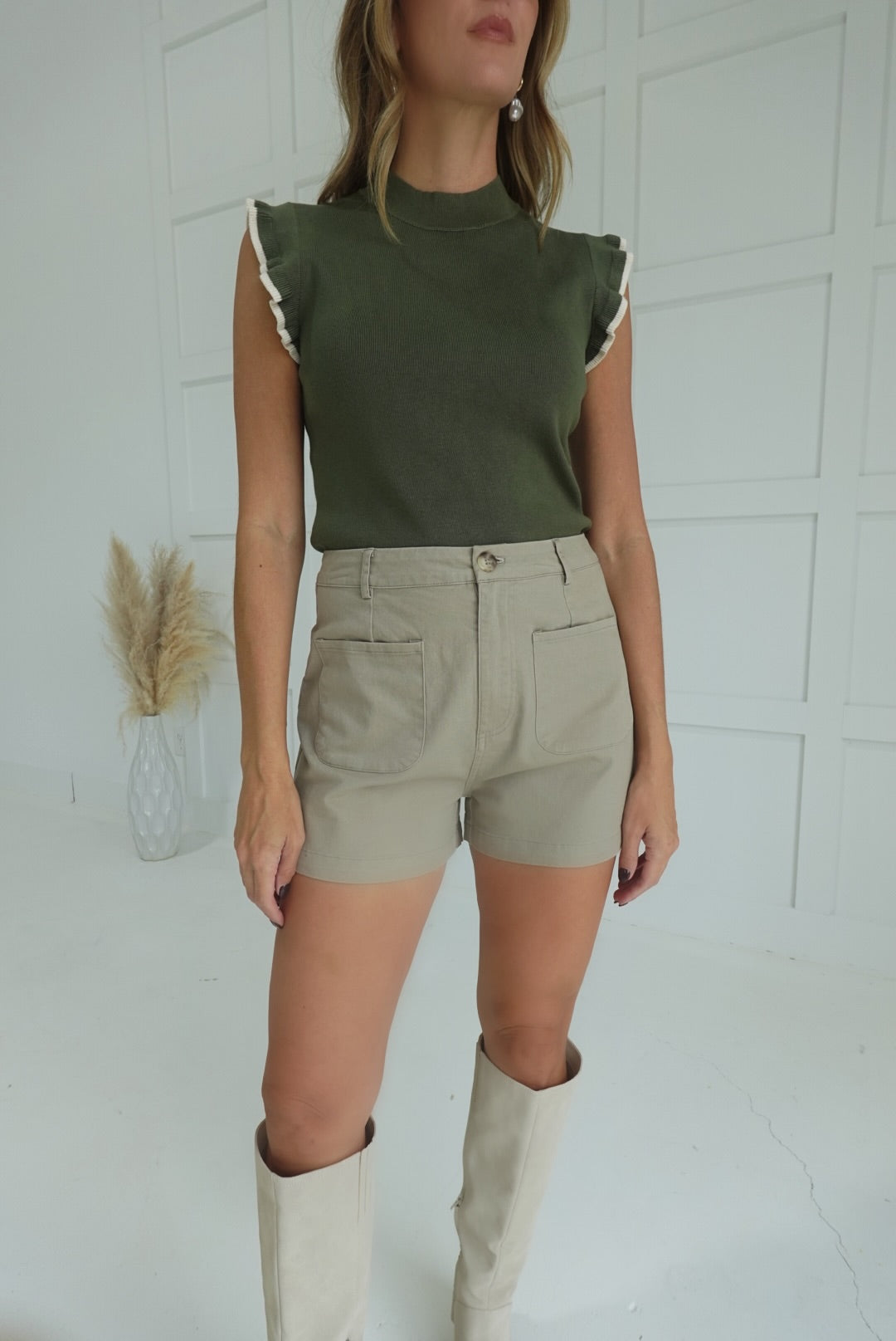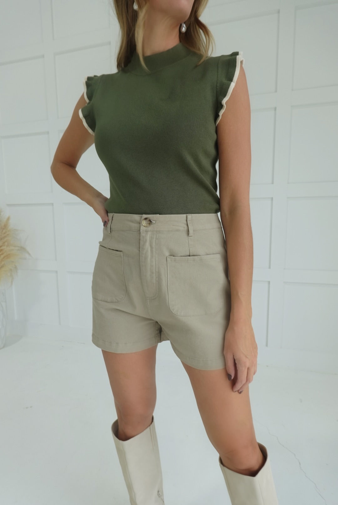 The Natalie High Waisted Shorts provide a comfortable and flattering fit with their solid high-rise design. They feature a classic button and zipper closure for easy wear, along with practical patch pockets in the front and stylish faux welt pockets in the back. Crafted from lightweight, woven fabric that is non-sheer and unlined, these shorts offer breathability and ease, making them an ideal choice for warm days while maintaining a polished look.