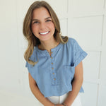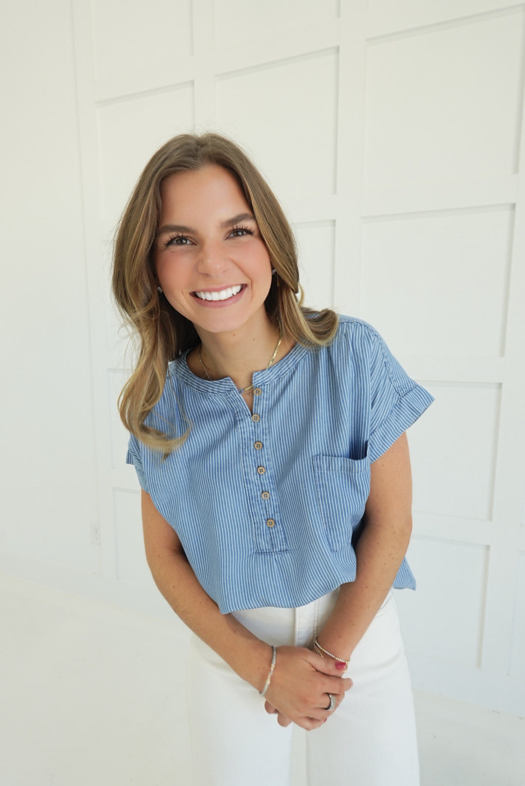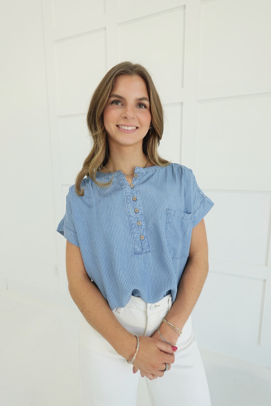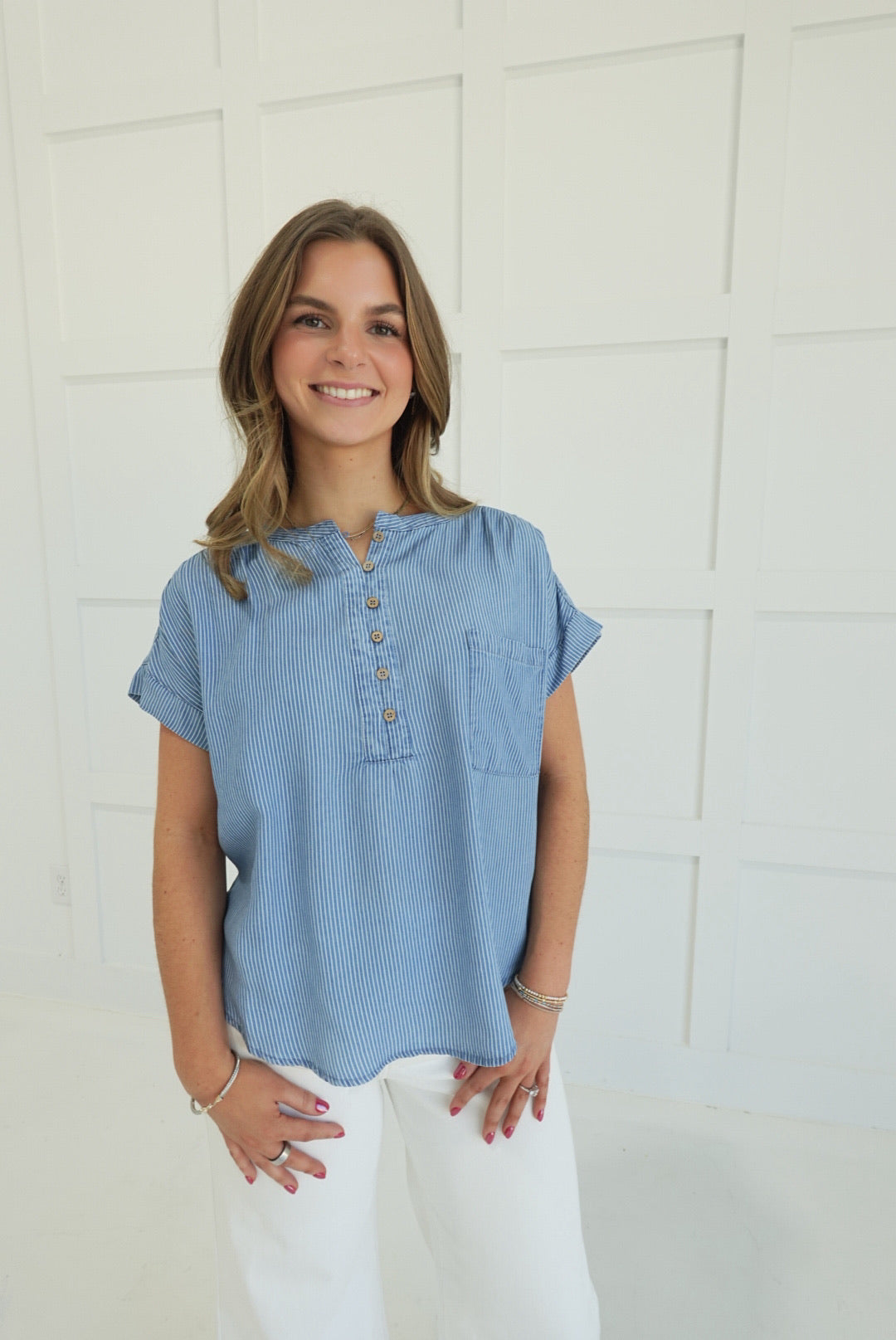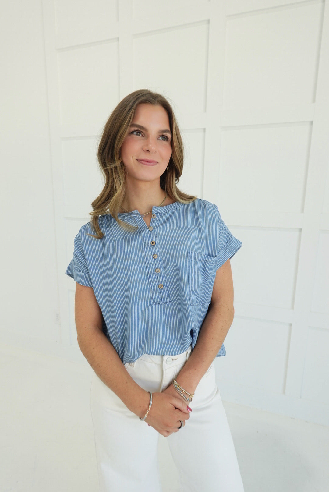 The Nelda Top commands attention with its bold stripe chambray fabric and fearless ruched detailing. This henley-style piece refuses to blend in—sharp vertical stripes create visual impact while strategic ruching adds dimension and edge. Perfect for those who dress with intention, it's a statement piece that transforms any casual look into something undeniably striking. Versatile enough to layer or wear solo, the Nelda Top proves that everyday basics don't have to play it safe.