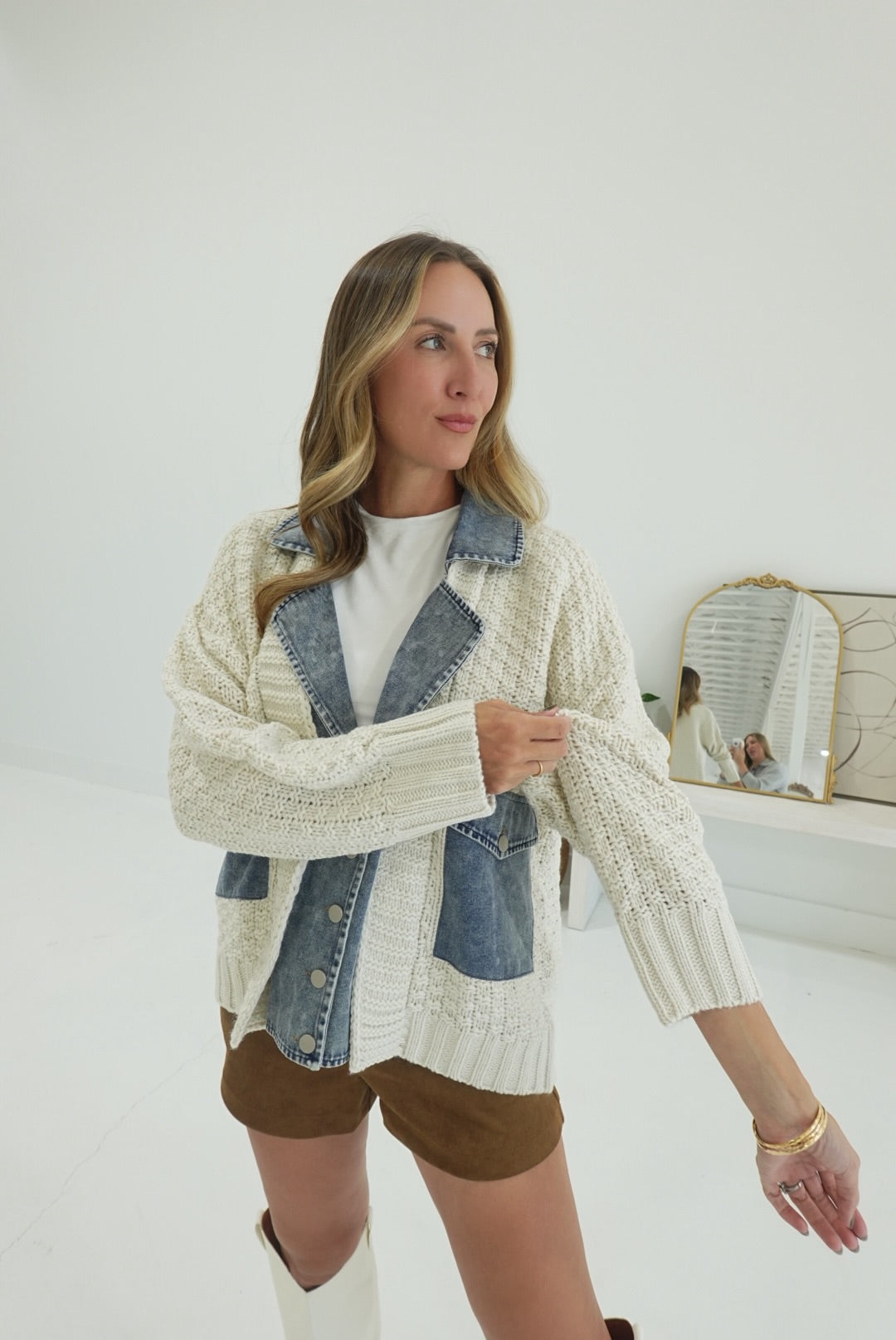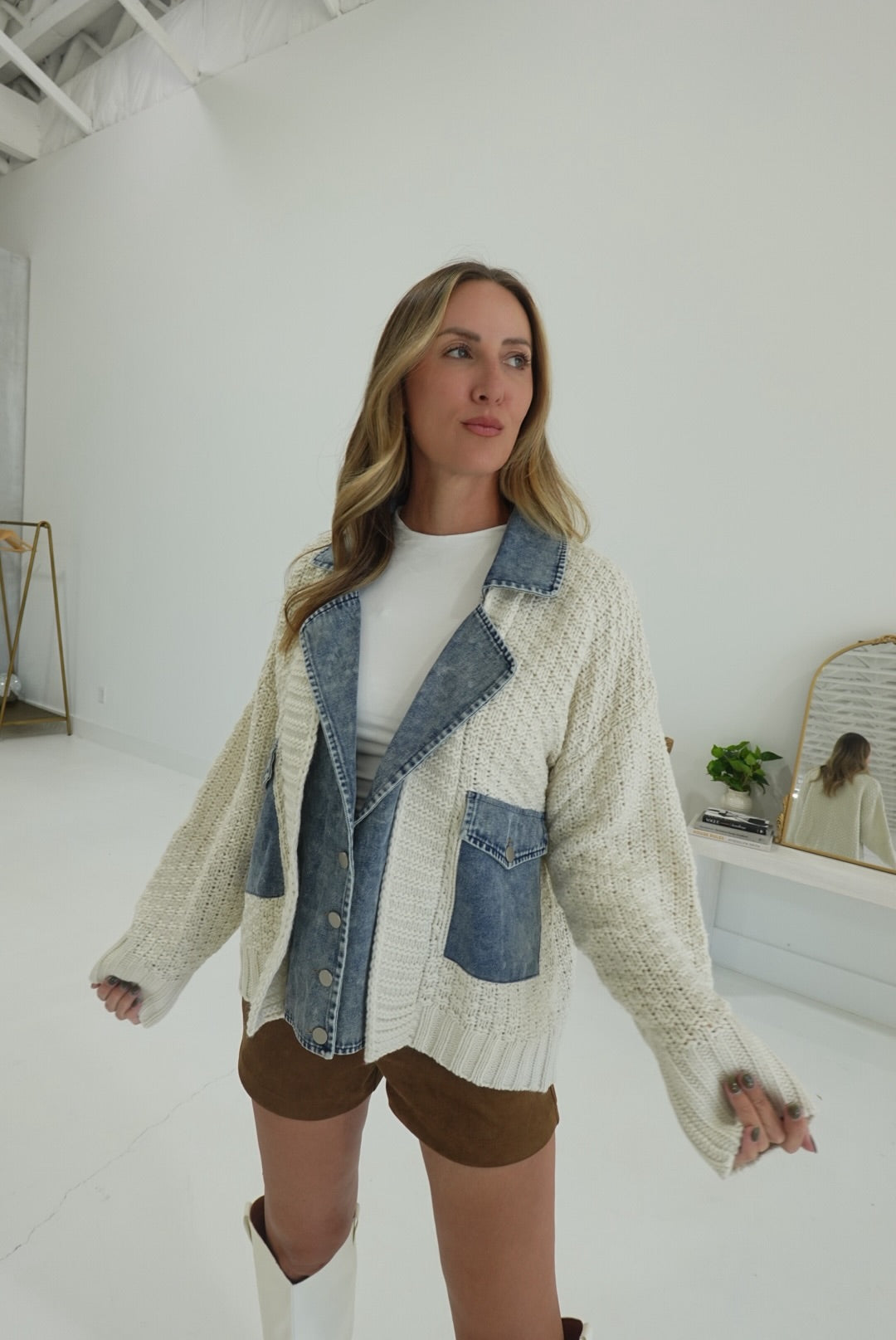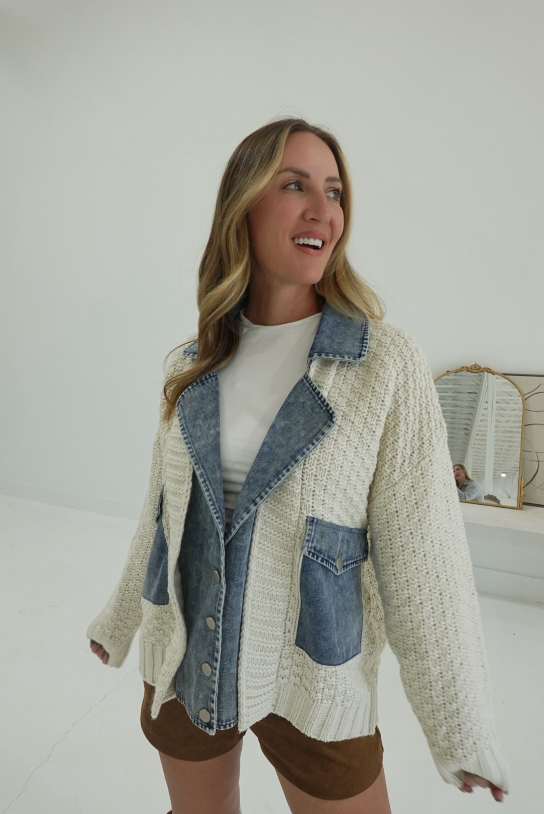 The Nestled Hill Jacket combines cozy mixed media cable knit fabric with stylish denim trim for a unique, comfortable look. Designed to keep you warm and effortlessly fashionable, this jacket adds texture and character to your wardrobe while providing durability and softness. Perfect for layering on cooler days, it supports your style with a touch of timeless charm.