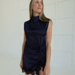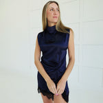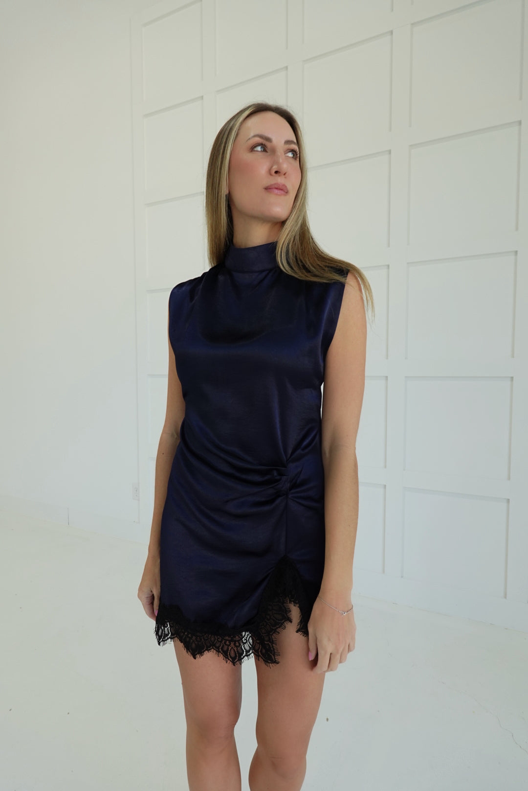 Embrace the night in this daring sleeveless mini dress featuring a sophisticated high neckline and alluring front lace trim. The delicate lace detailing frames the hemline and front slit, creating an effortlessly chic silhouette perfect for evening occasions. A hidden in-seam zip closure at the back ensures a seamless, polished finish. Bold, elegant, and undeniably captivating.