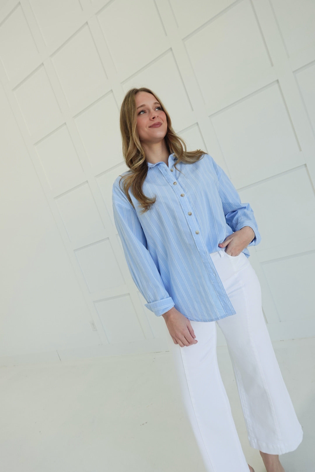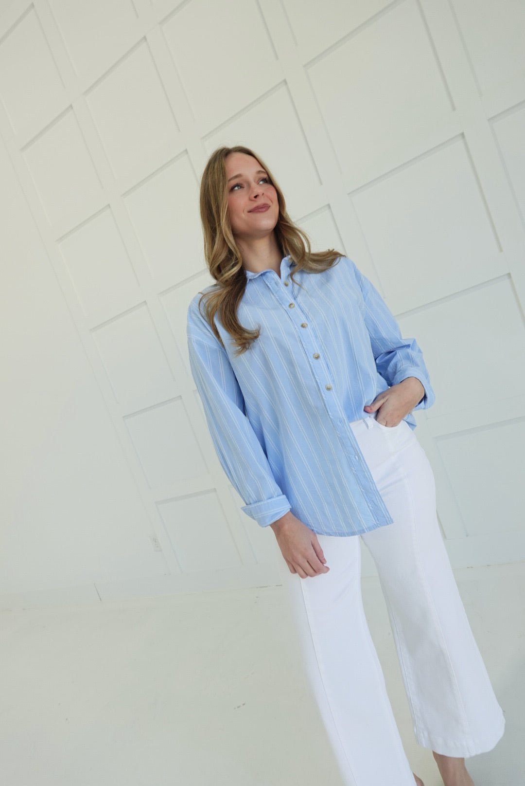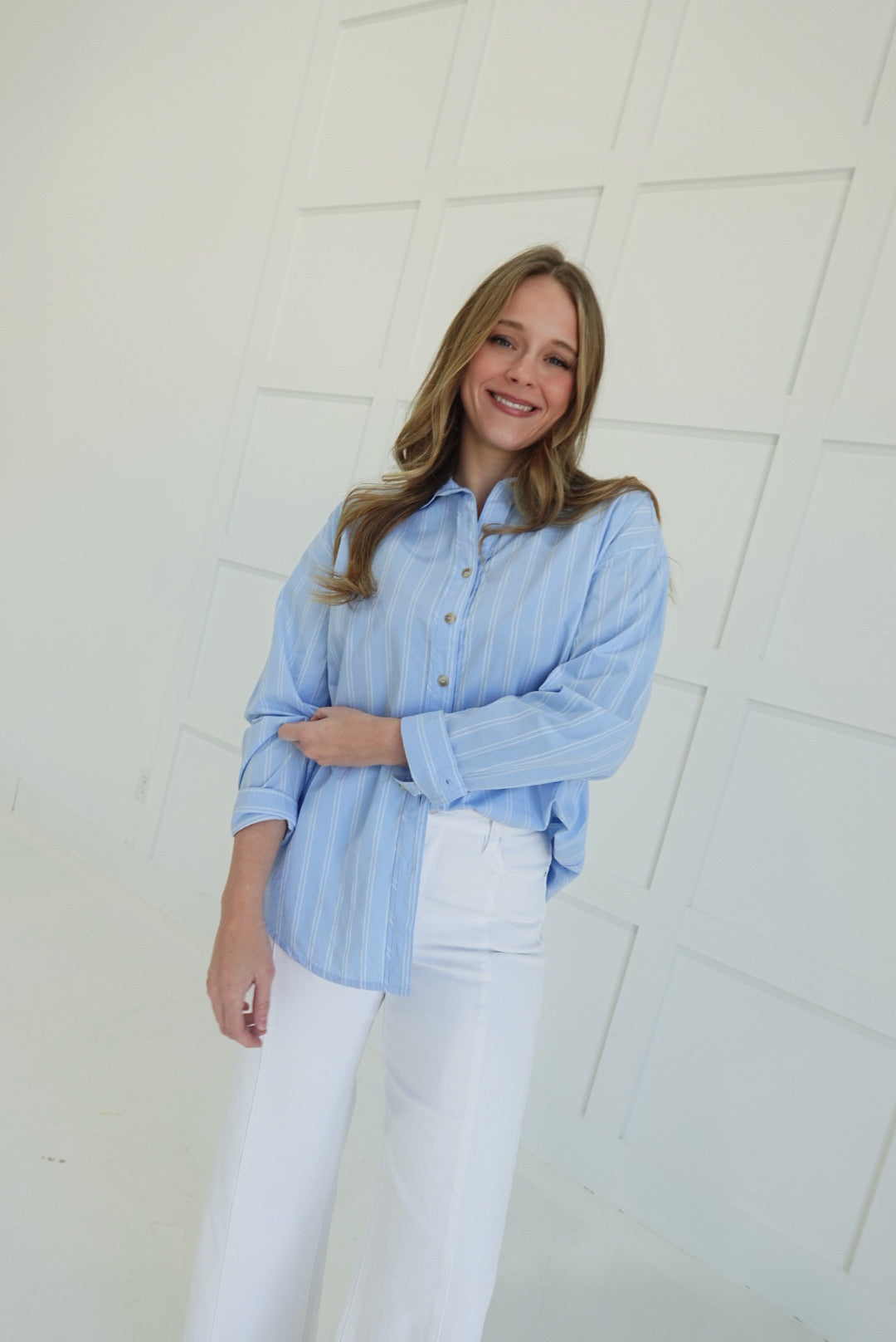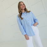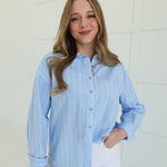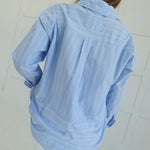Steal the spotlight in this oversized button-down that refuses to play it safe. Crisp light blue stripes cut through the ordinary with bold, unapologetic style—perfect for those who wear menswear on their own terms. The relaxed fit drapes effortlessly over everything from fitted tees to bare skin, while the front buttons let you control the reveal. Layer it, tie it, wear it open—this piece bends to your vision, not the other way around. Confidence looks good on you.