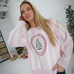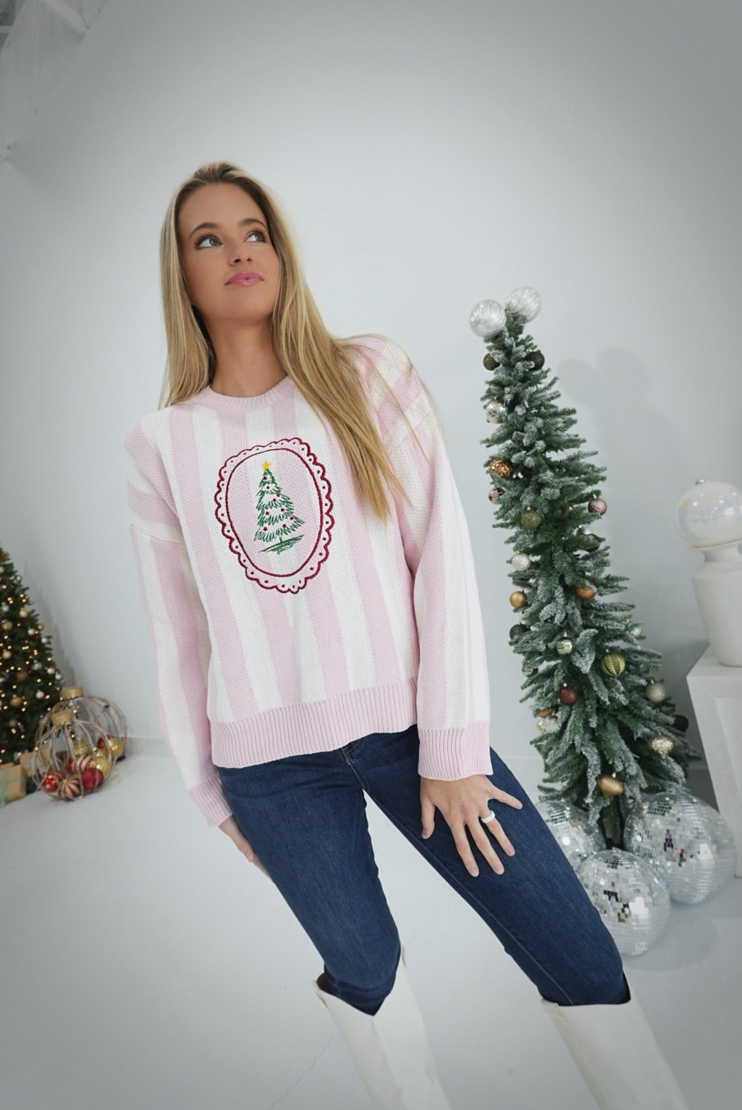- Pink Striped Sweater With Embroidered Christmas Tree Design
