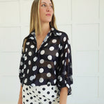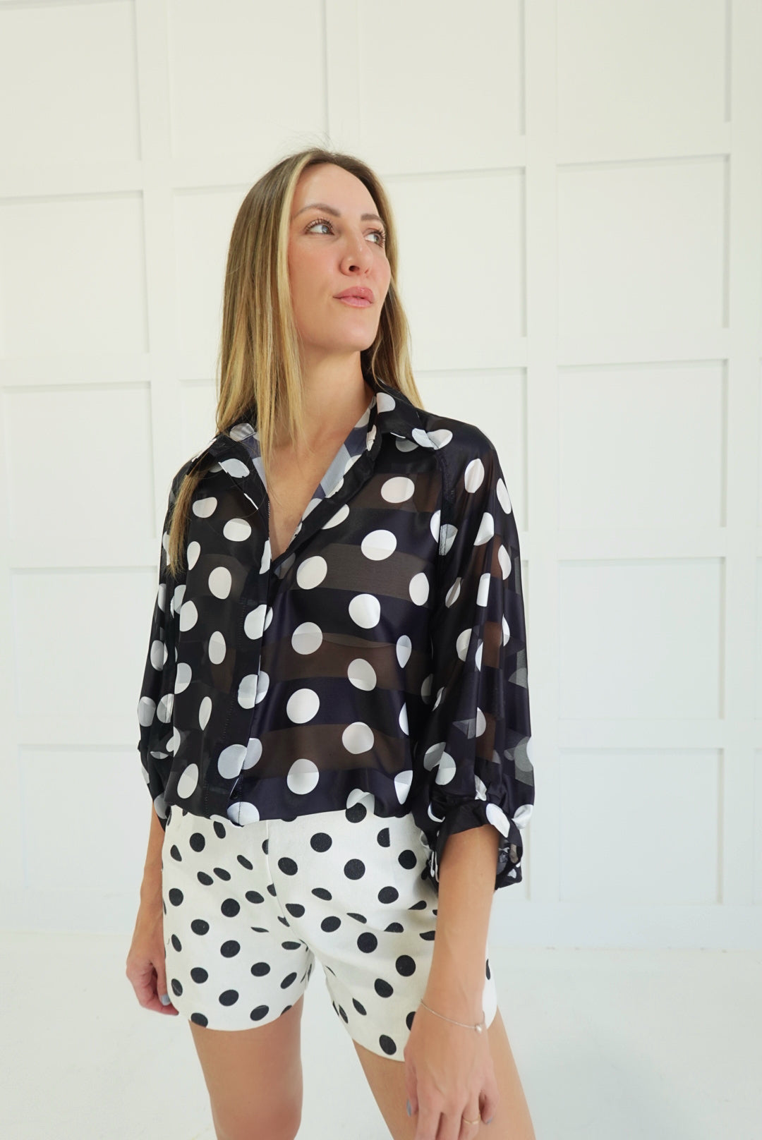 Mix vintage charm with modern edge in this daring two-piece set. The crisp white polka dot blouse pairs boldly with mismatched black polka dot fitted shorts for an effortlessly playful look that breaks the rules. Perfect for those who dare to stand out—layer it, style it solo, or own the unexpected contrast. Retro-inspired with a contemporary twist, this set delivers personality and confidence in every wear.