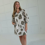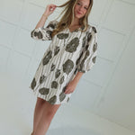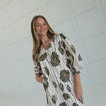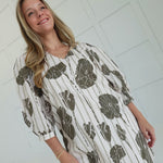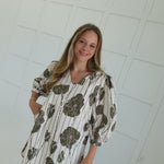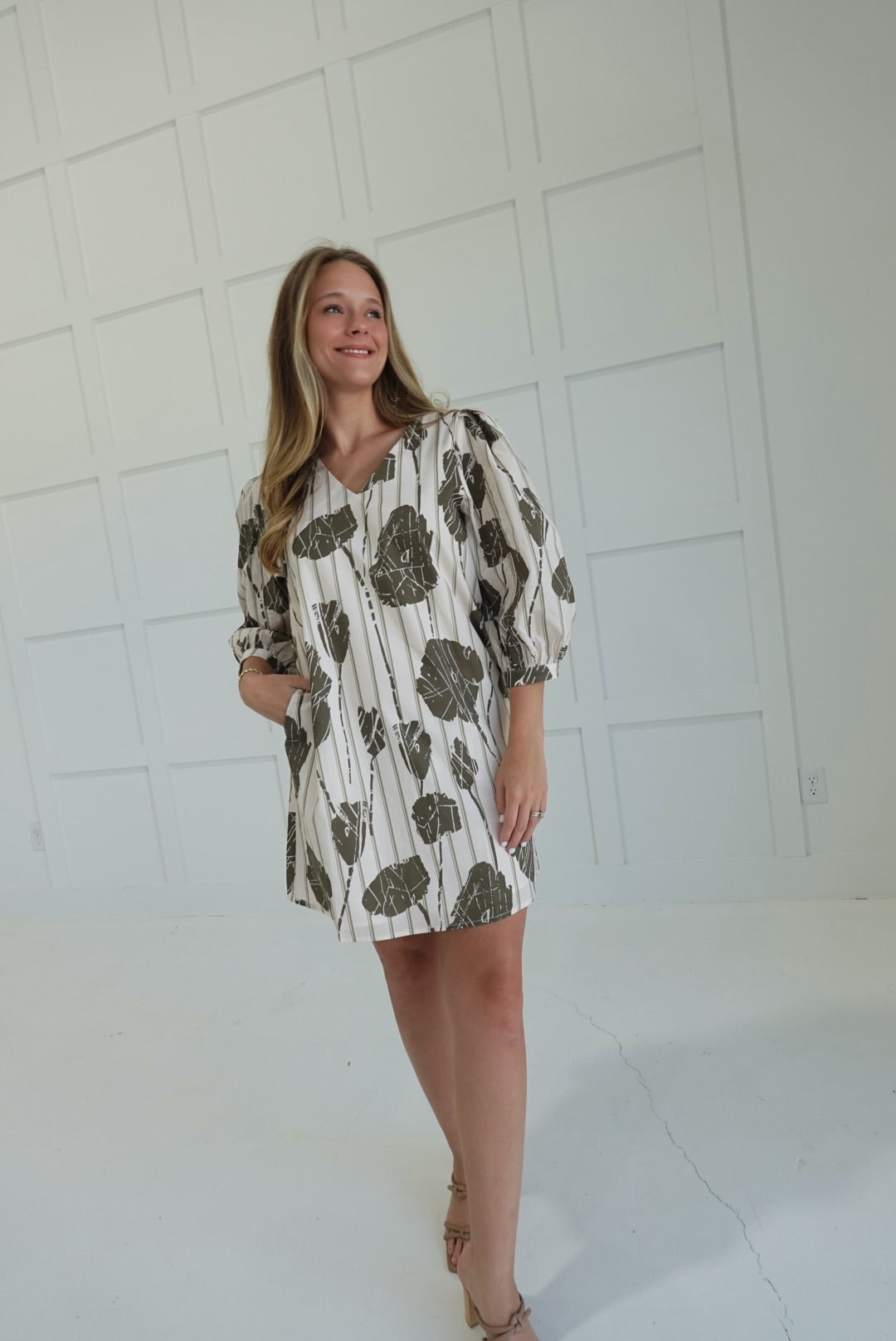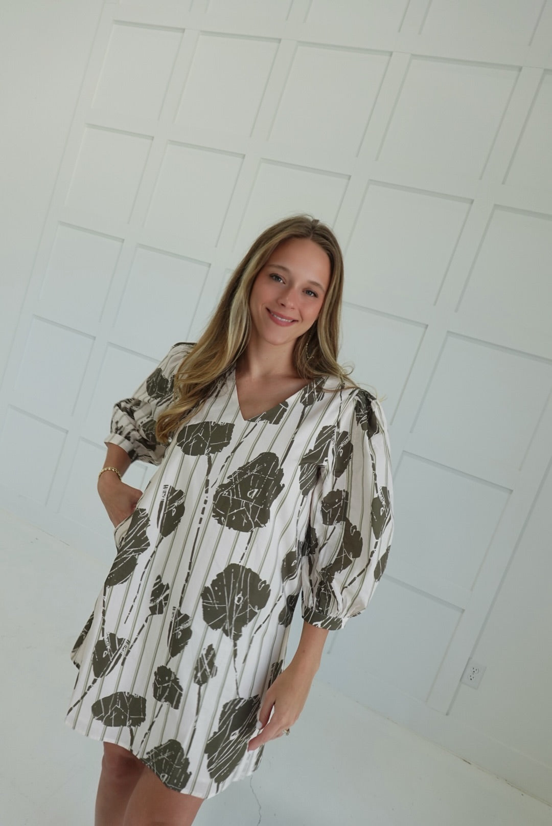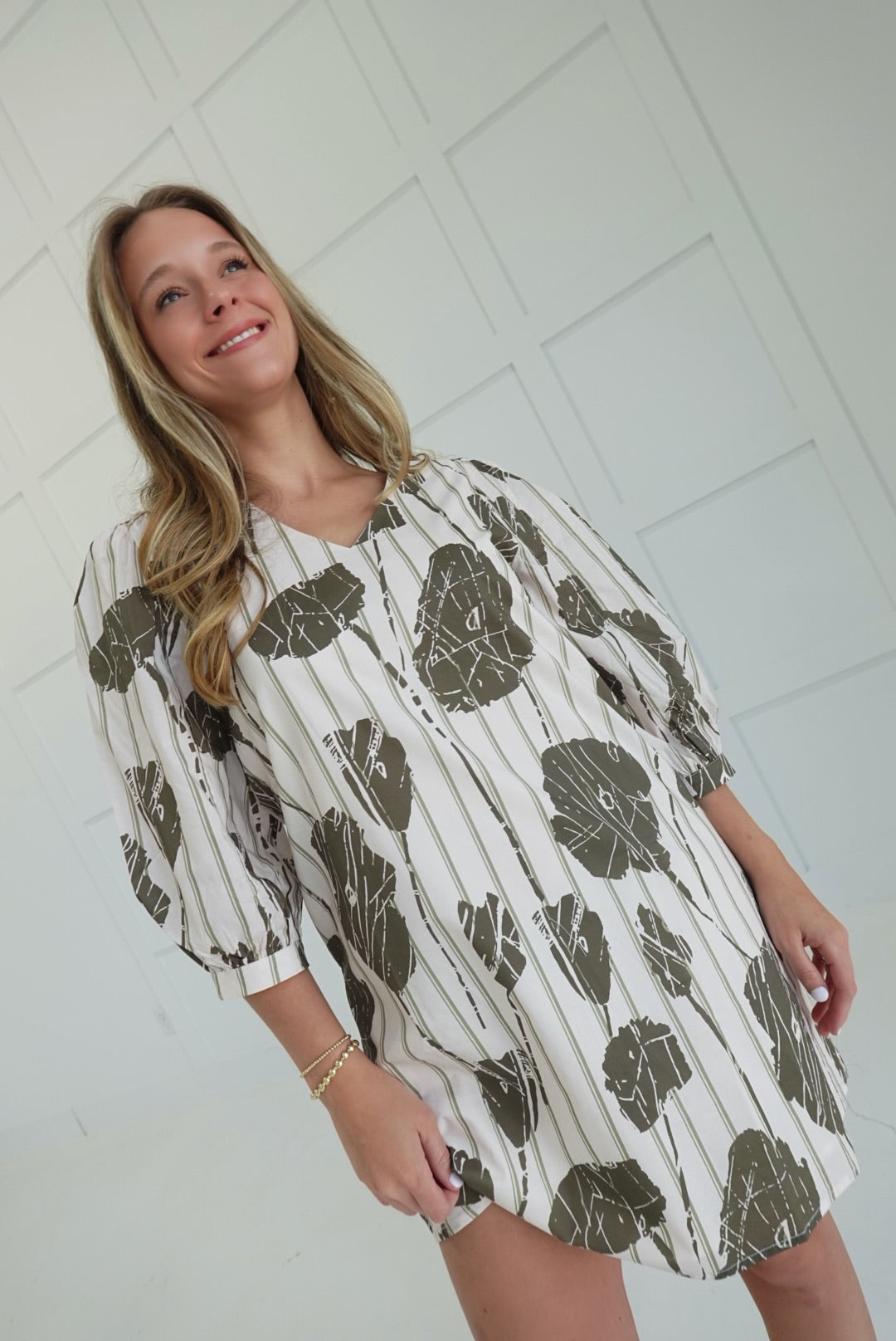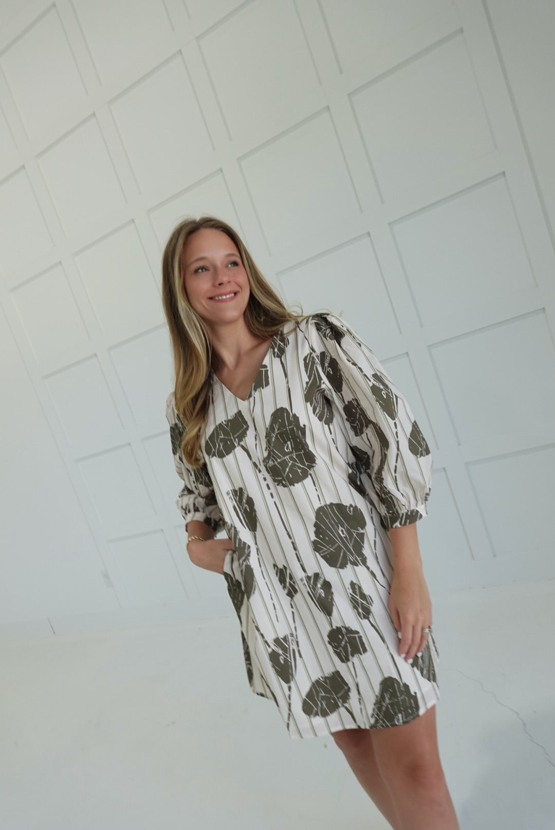 The Ollie Mini Dress features a charming combination of stripes and floral patterns, designed with a flattering V-neck and puffed three-quarter sleeves. Its 1-buttoned cuffs add a delicate touch, making it a versatile choice for both casual outings and special occasions. This dress offers comfort and style, helping you feel confident and effortlessly elegant.