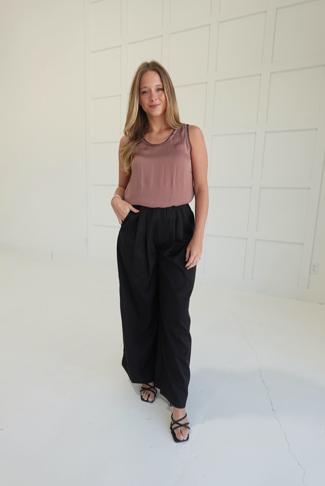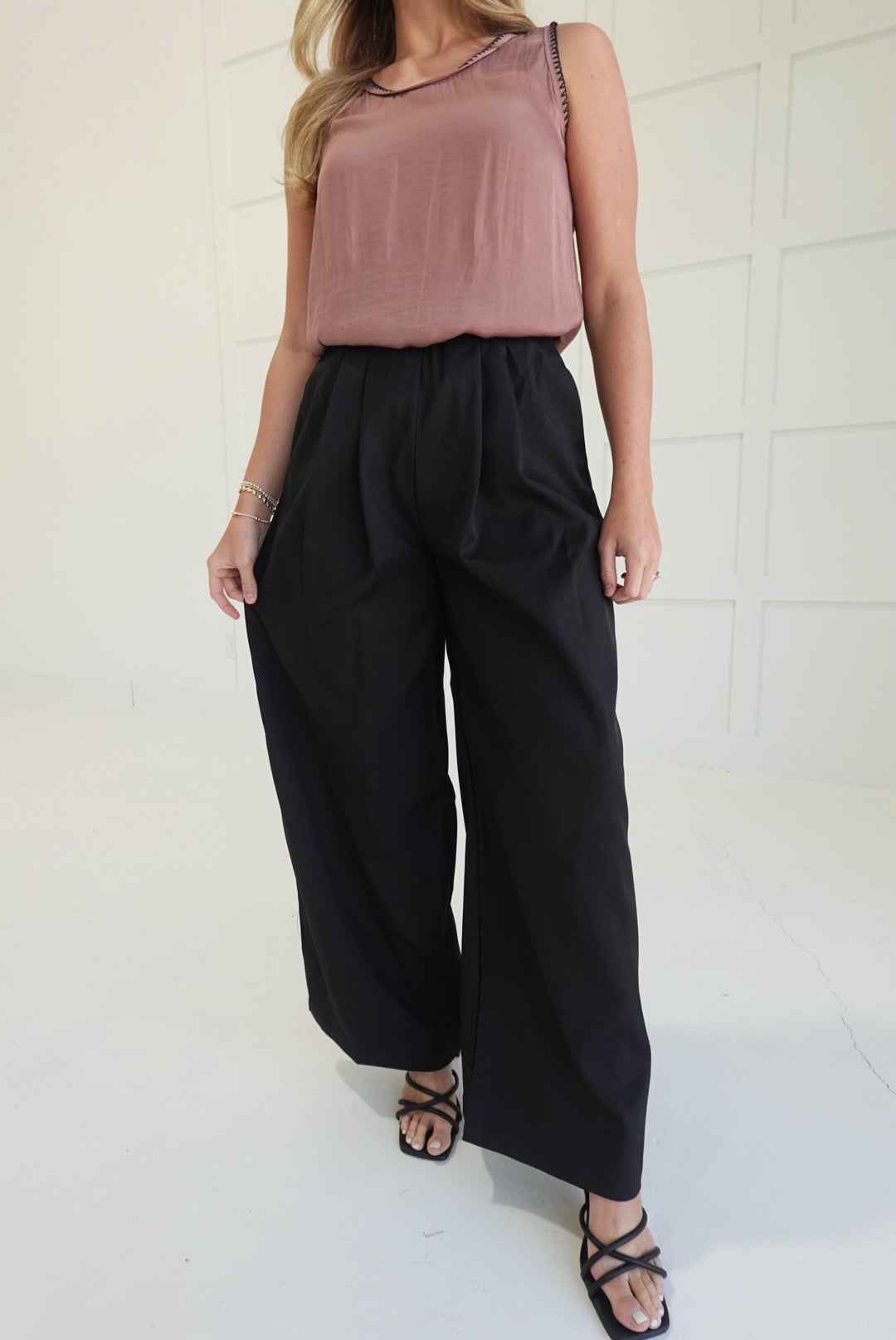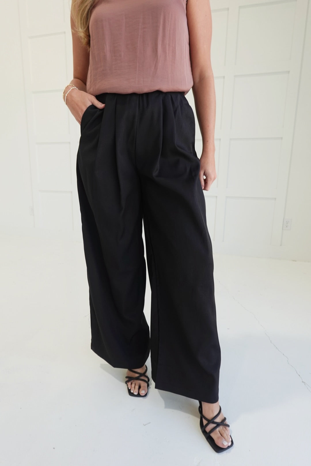 Experience comfort and style with the On My Dime Trousers in Black. These pleated, wide-leg tailored trousers offer a flattering fit and elegant silhouette, perfect for both professional settings and casual outings. The pleats add a refined touch while allowing ease of movement, helping you feel confident and comfortable throughout your day. A versatile wardrobe essential designed to support your busy lifestyle with polished sophistication.